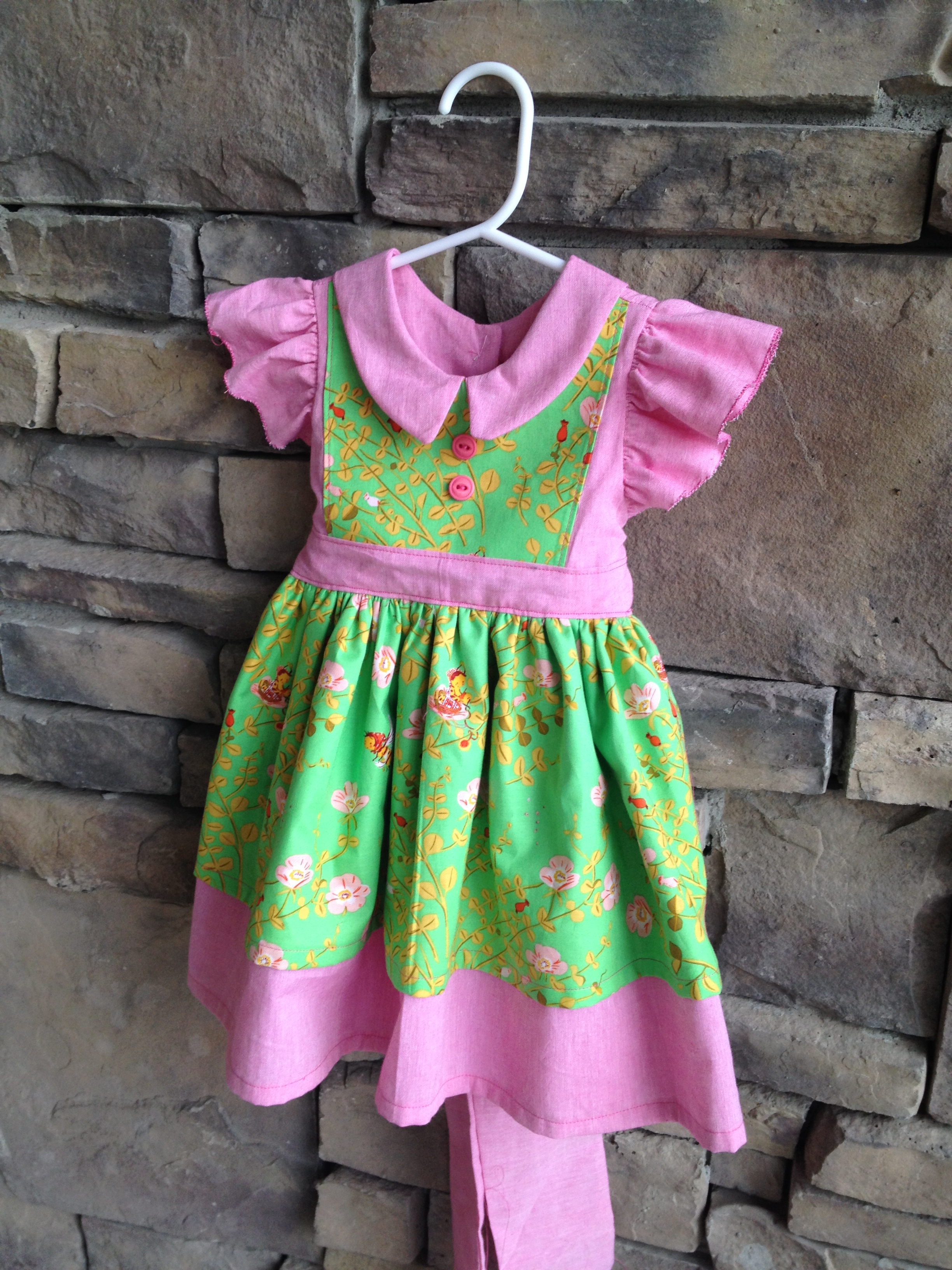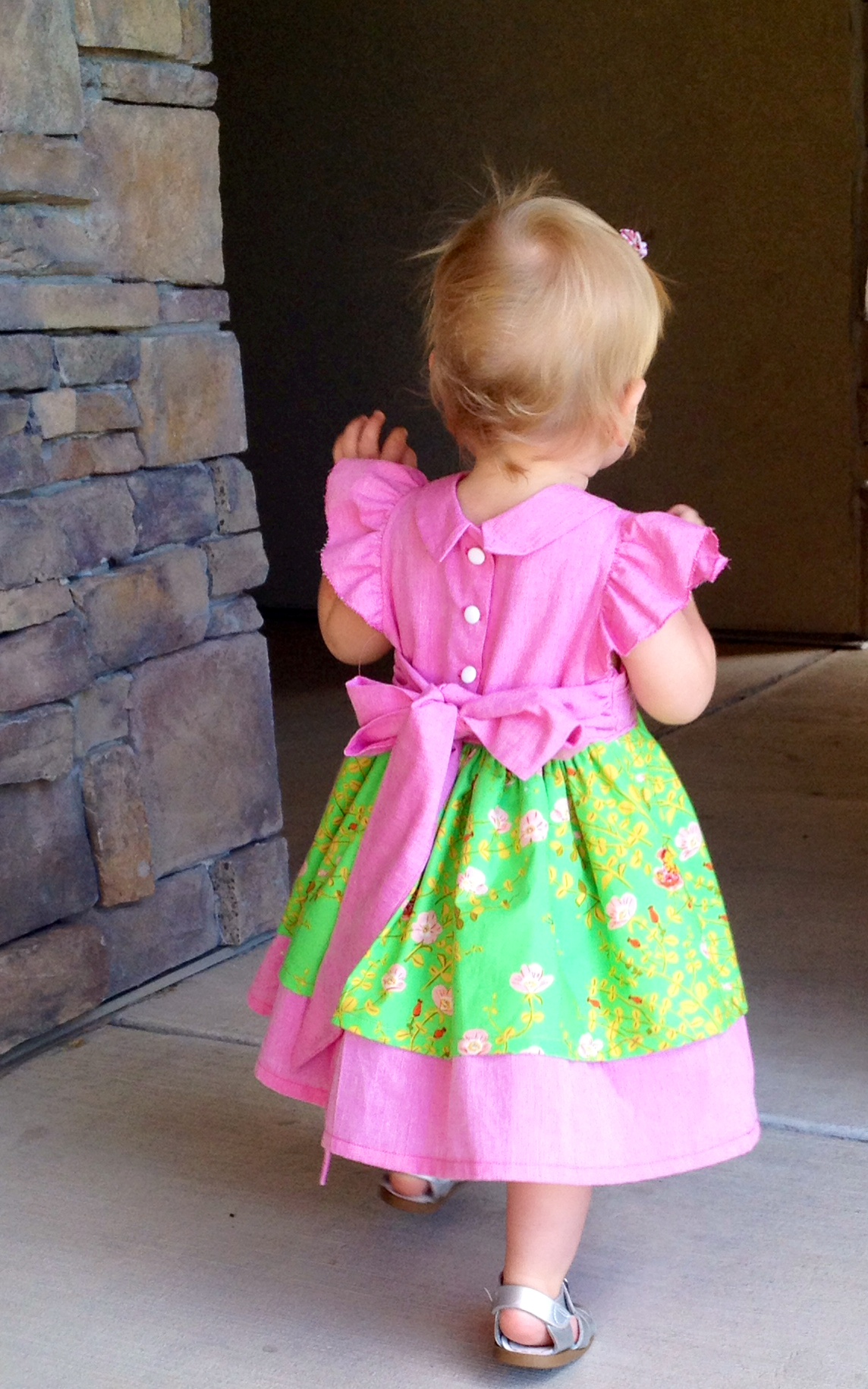 Since it’s officially Olivia’s birthday month, I thought we’d kick it off with this cute dress pattern I recently found. I decided to make this dress for Olivia’s first birthday coming up in a few weeks. I absolutely love how it turned out. The sizing is right on, the pattern is very easy to follow with step by step instructions and pictures. I found this pattern at Harmony Provo, my new FAVORITE fabric store. It’s a charming little store located at 315 E Center Street, Provo UT. Check out their website at Harmony Provo. They have the best fabric selection (modern, trendy, and vintage kind of stuff), and they also have the best selection of ribbon and trim I have ever seen! It’s also a great stop for knitting supplies.