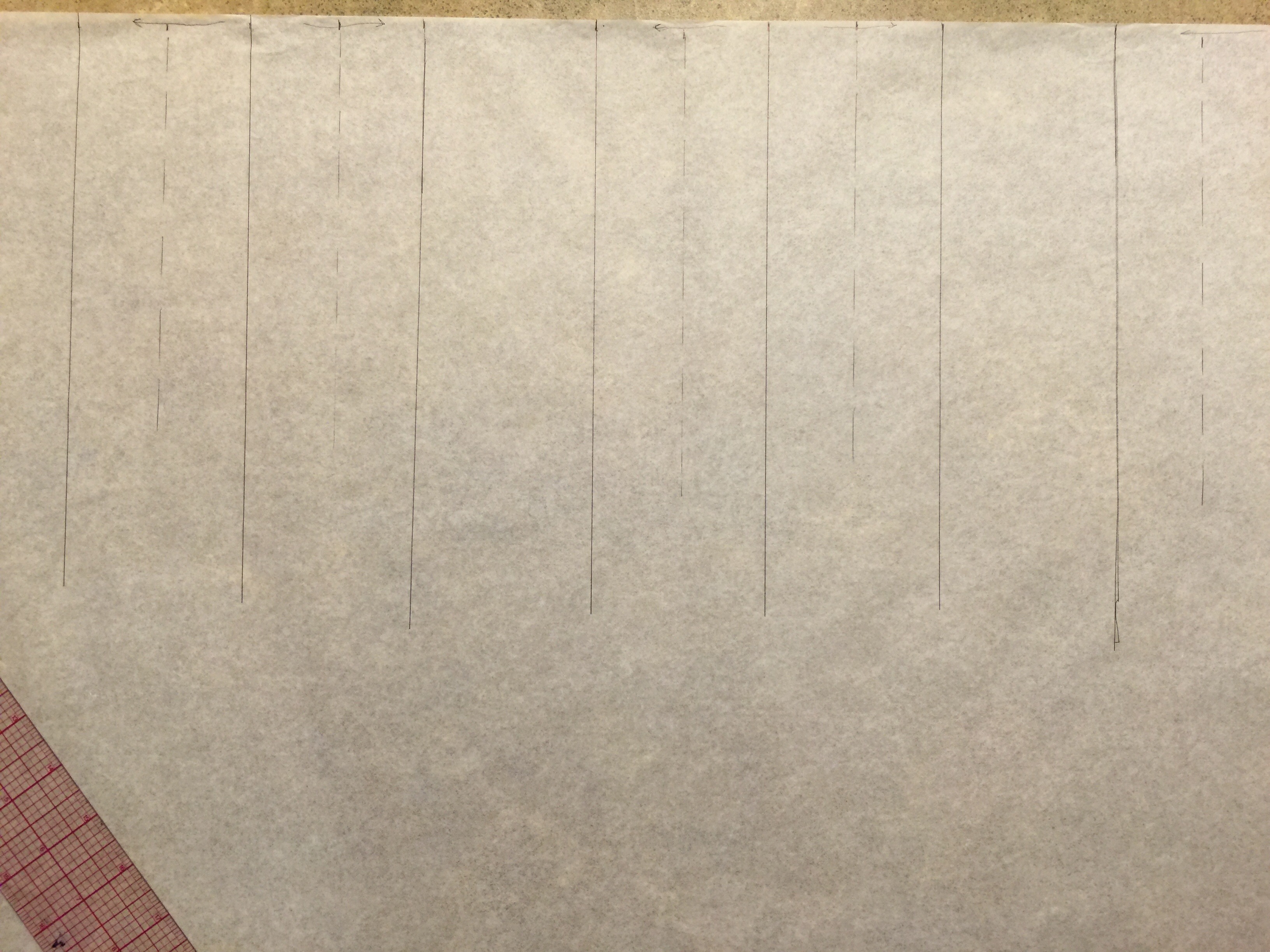 -Measure out a piece of pattern paper that measures HALF of your needed width. This will give you a front and back piece, so you will cut 2 of these out of your fabric. (You can buy this pattern paper at the Doctors office, its the same paper they lay on the exam table!). So my needed width was 89.5″ then divided by 2 came out to 44.75″. After you measure out your width, draw out your pleats. On each end of the paper, mark your 1/2″ seam allowance. For each pleat you will need your pleat length to the right and left of it. I drew dotted lines to represent the fold lines. You fold every line to the left of the pleat to the right, and every line to the right of the pleat to the left.