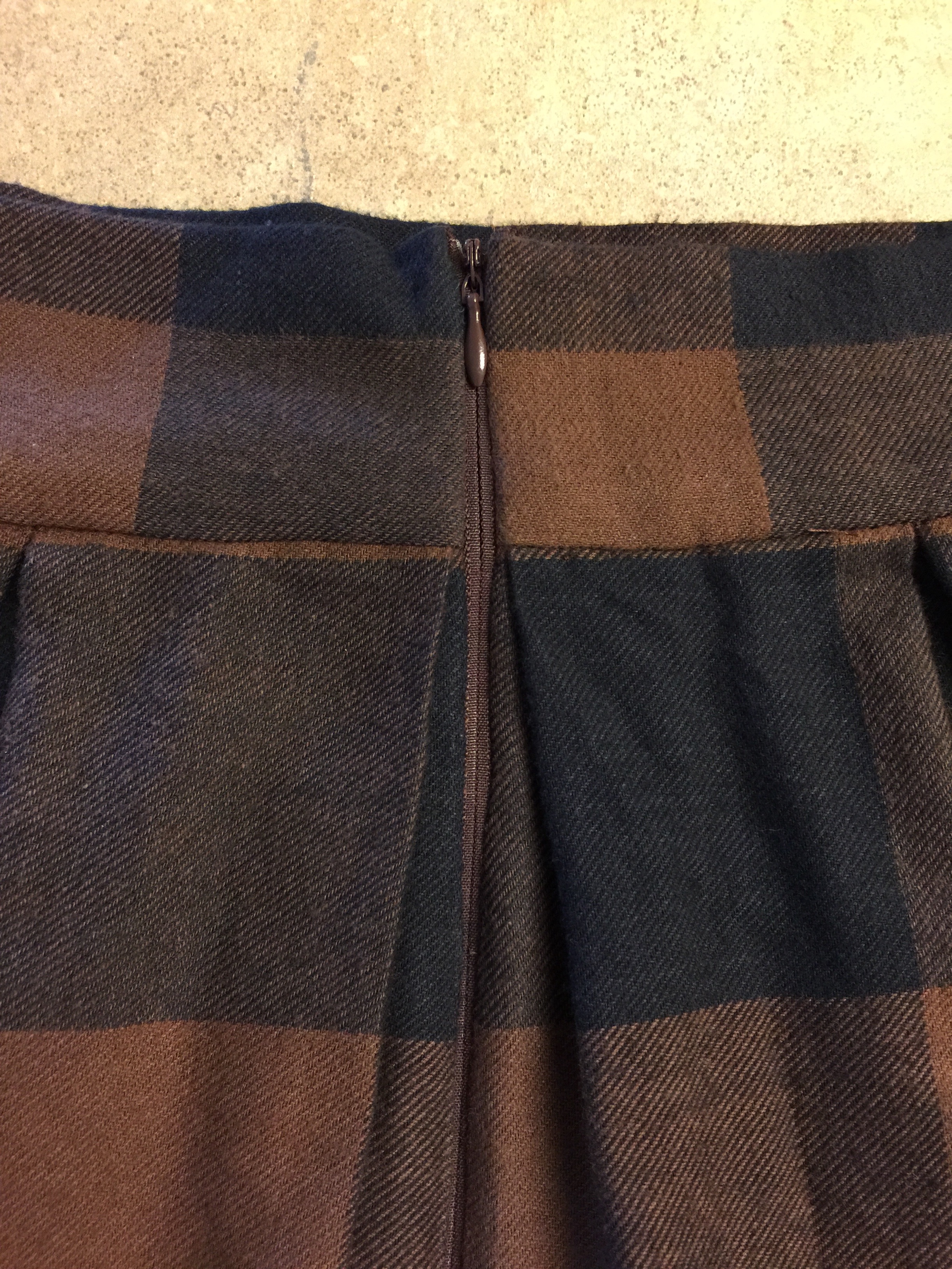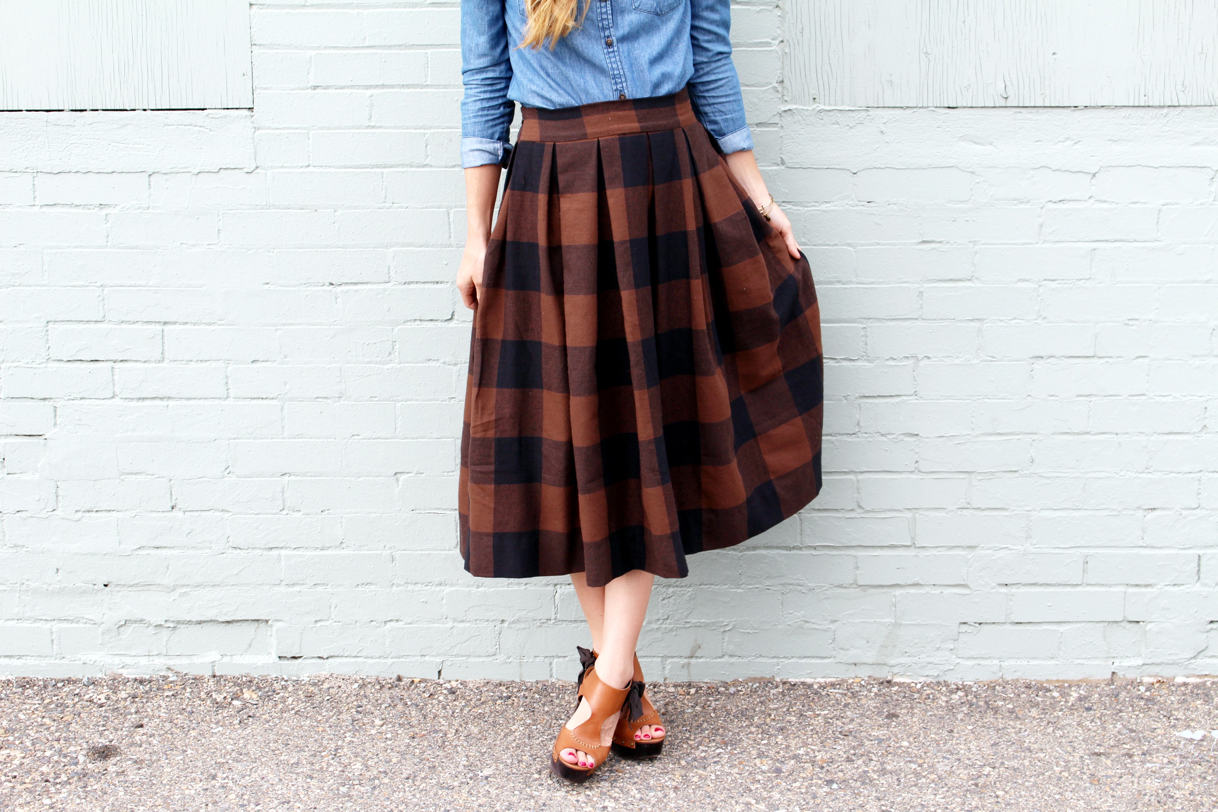 A few months ago I pinned this Anthropologie skirt, and I’ve been on the hunt for a great buffalo check fabric ever since in attempt to recreate it! Last week I came across a great brown + black buffalo check cotton fabric at Hancock fabrics that was just perfect for this project. I decided to make my skirt with pleats instead of gathers because I really like the constructed look pleats add to a garment. I chose to go for a midi length skirt (a big thing for Fall this year), just like the Anthro skirt.
