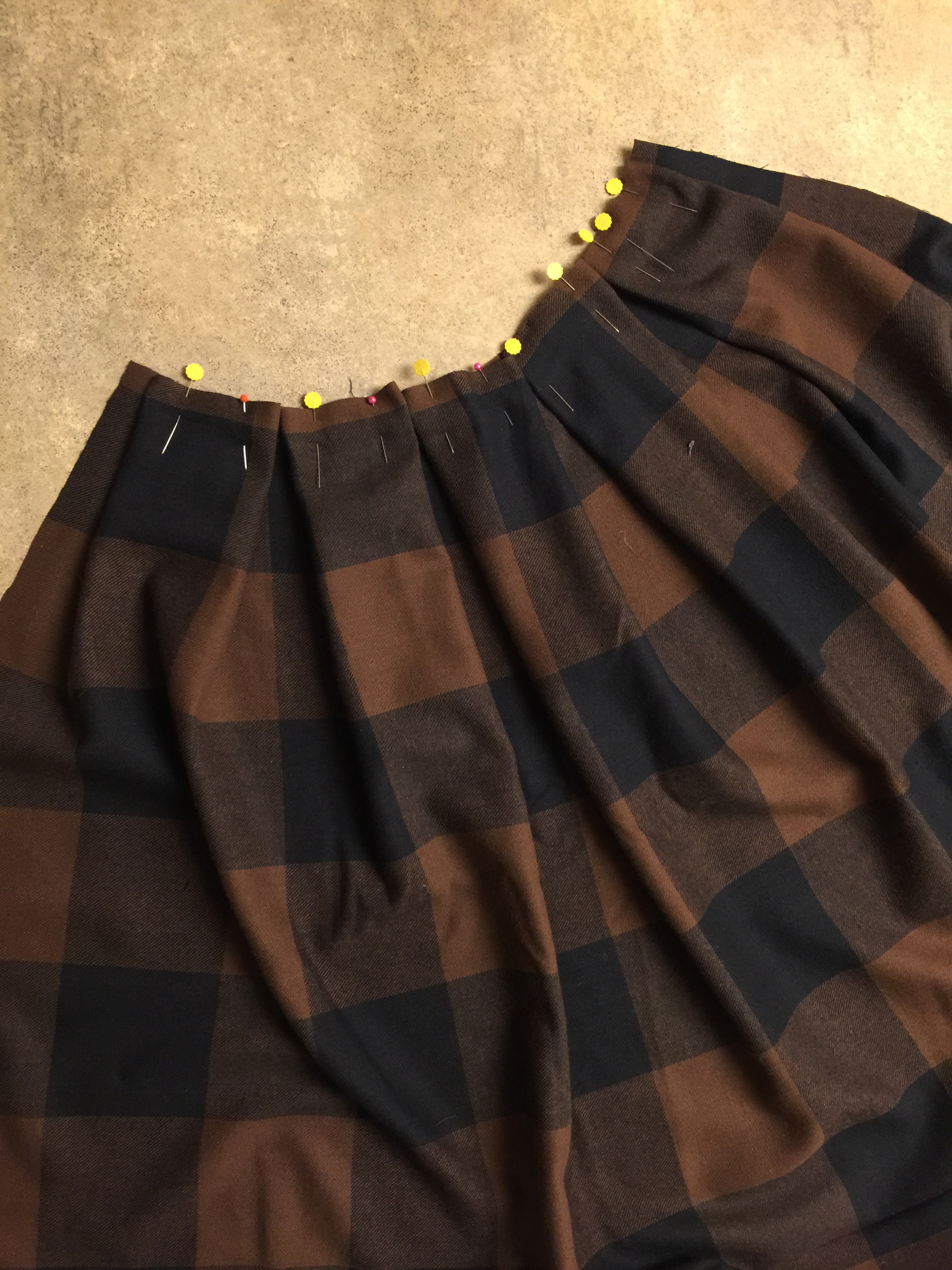 (NOT PICTURED: Baste 1/2″ on each waistline edge on both your pleated front and back skirt pieces).