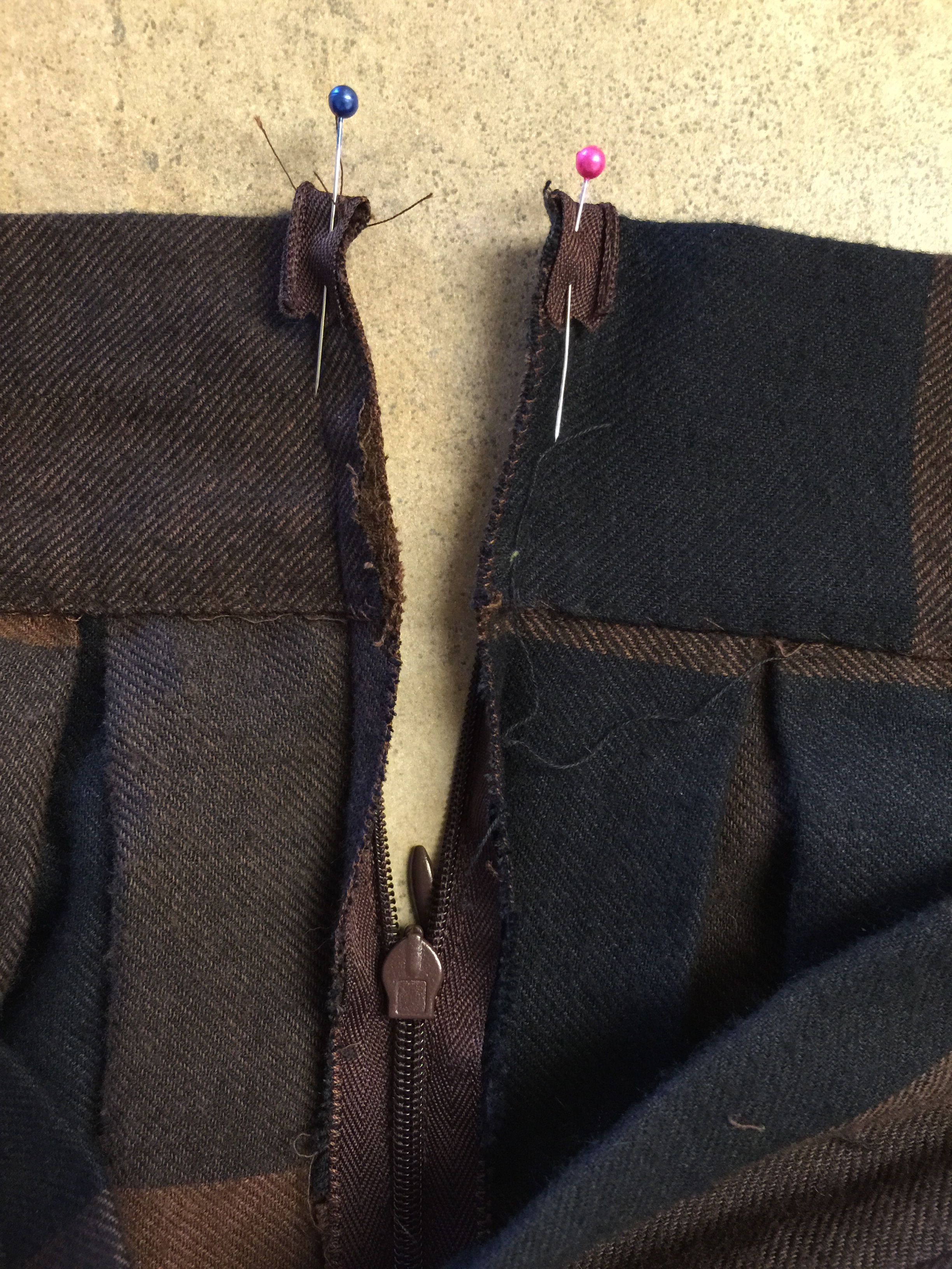 Finish off your zipper edge by pinning your loose zipper tape sticking over the top of your skirt to the back of the seam allowance.