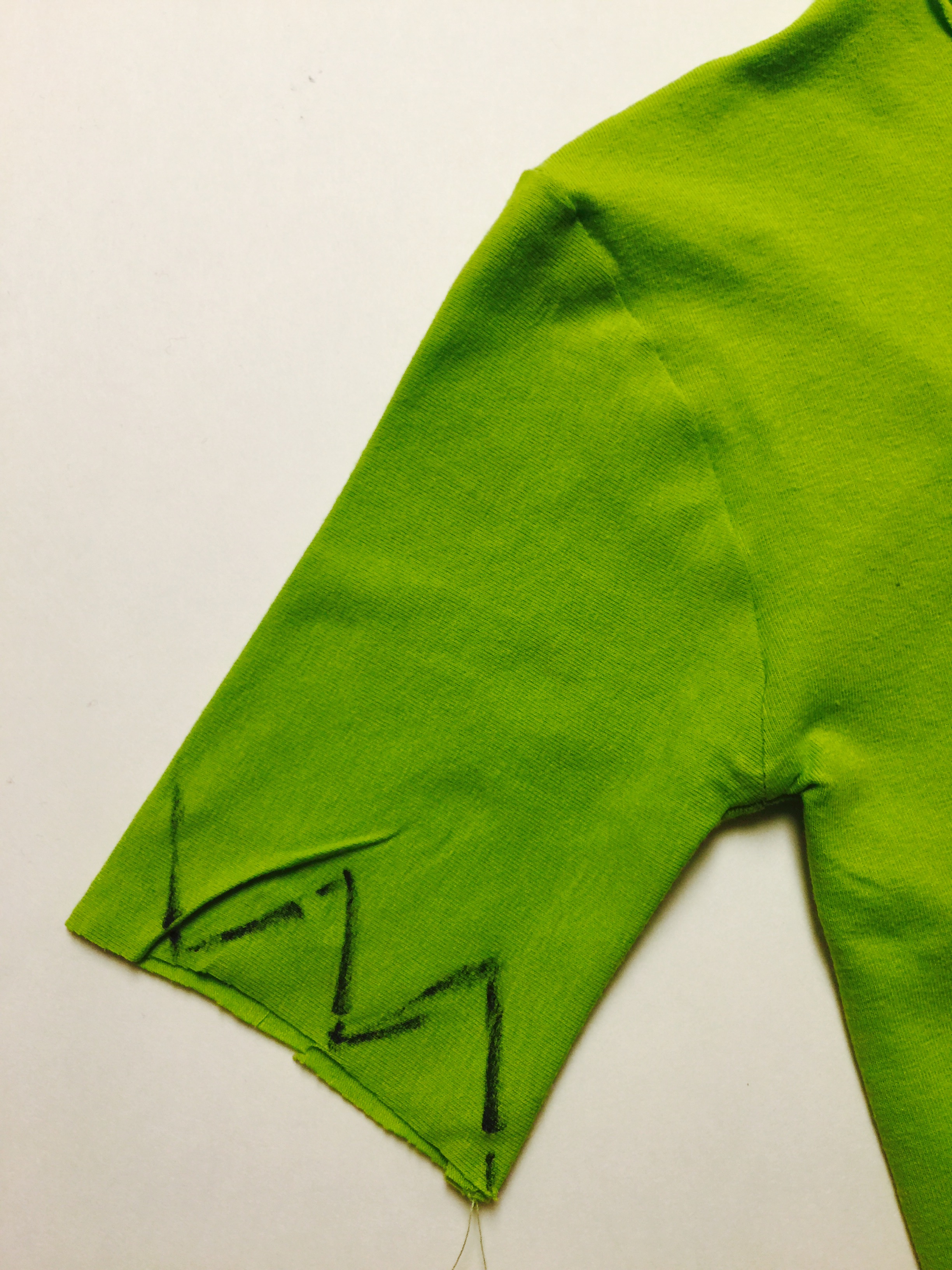 5. Your shirt is now finished. Lets add some little peter pan touches. Trace a zig zag pattern on sleeve and hem edges, and cut.