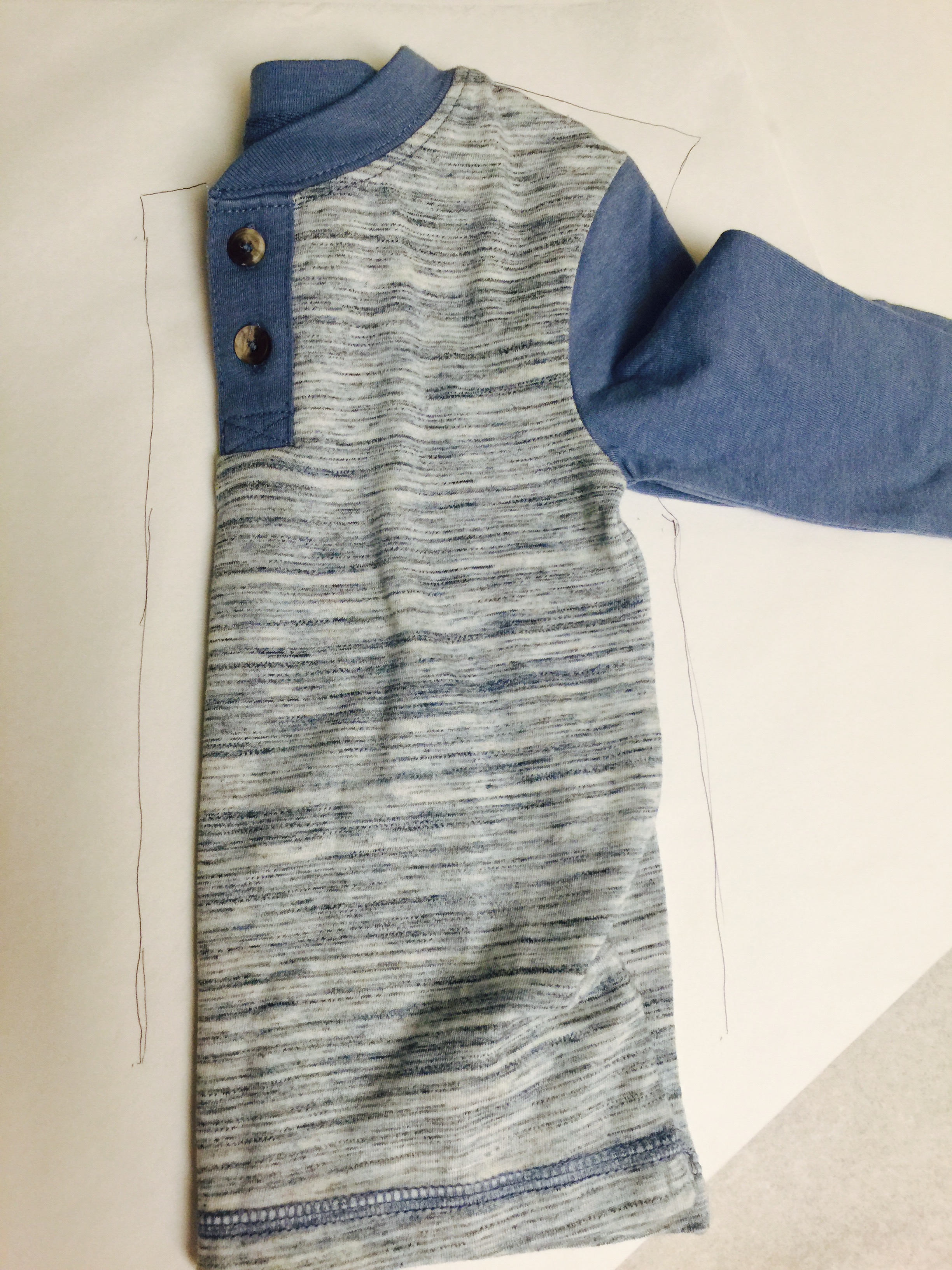 - Using a shirt that fits well, trace a simple bodice front, back and sleeve pattern, as pictured below: