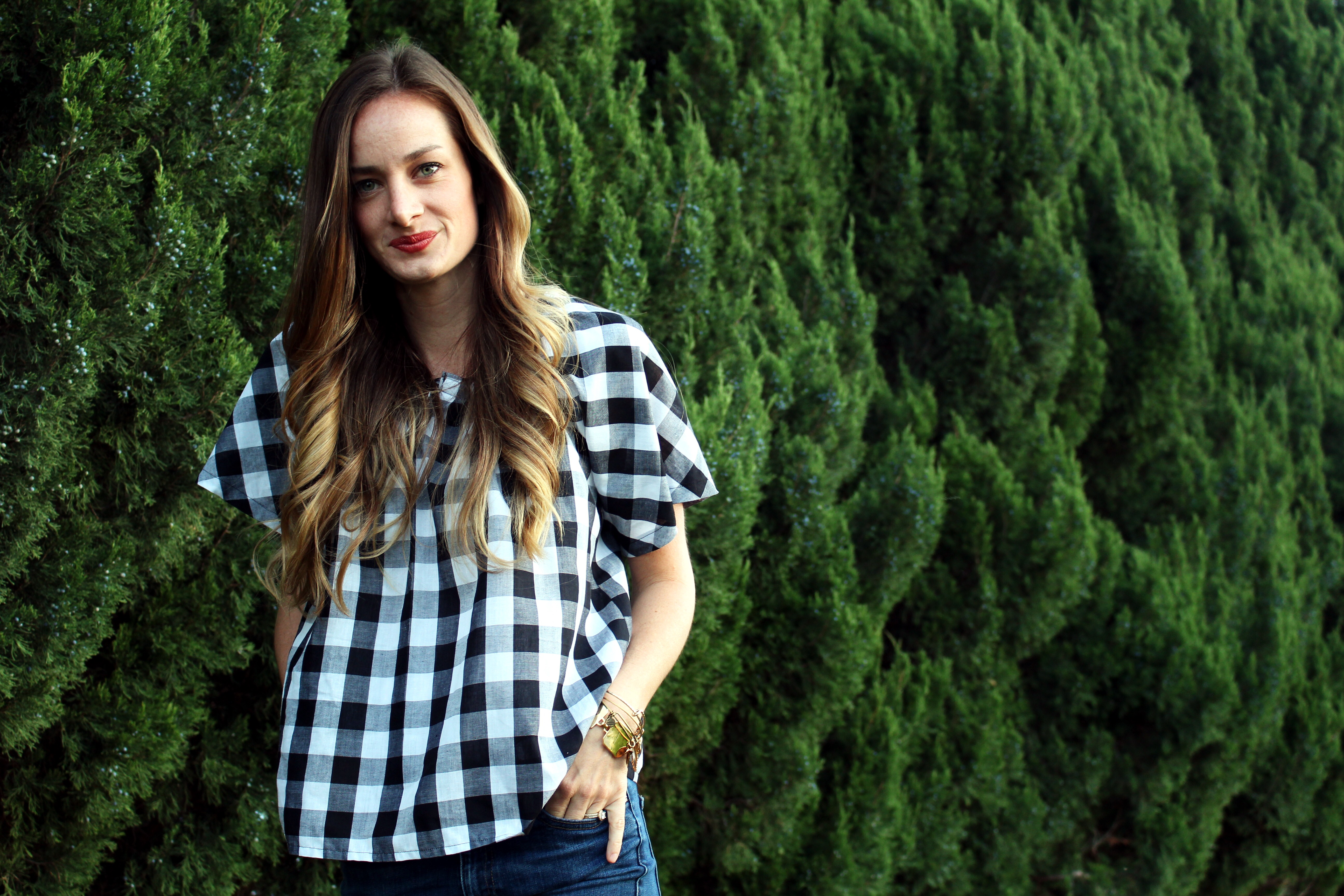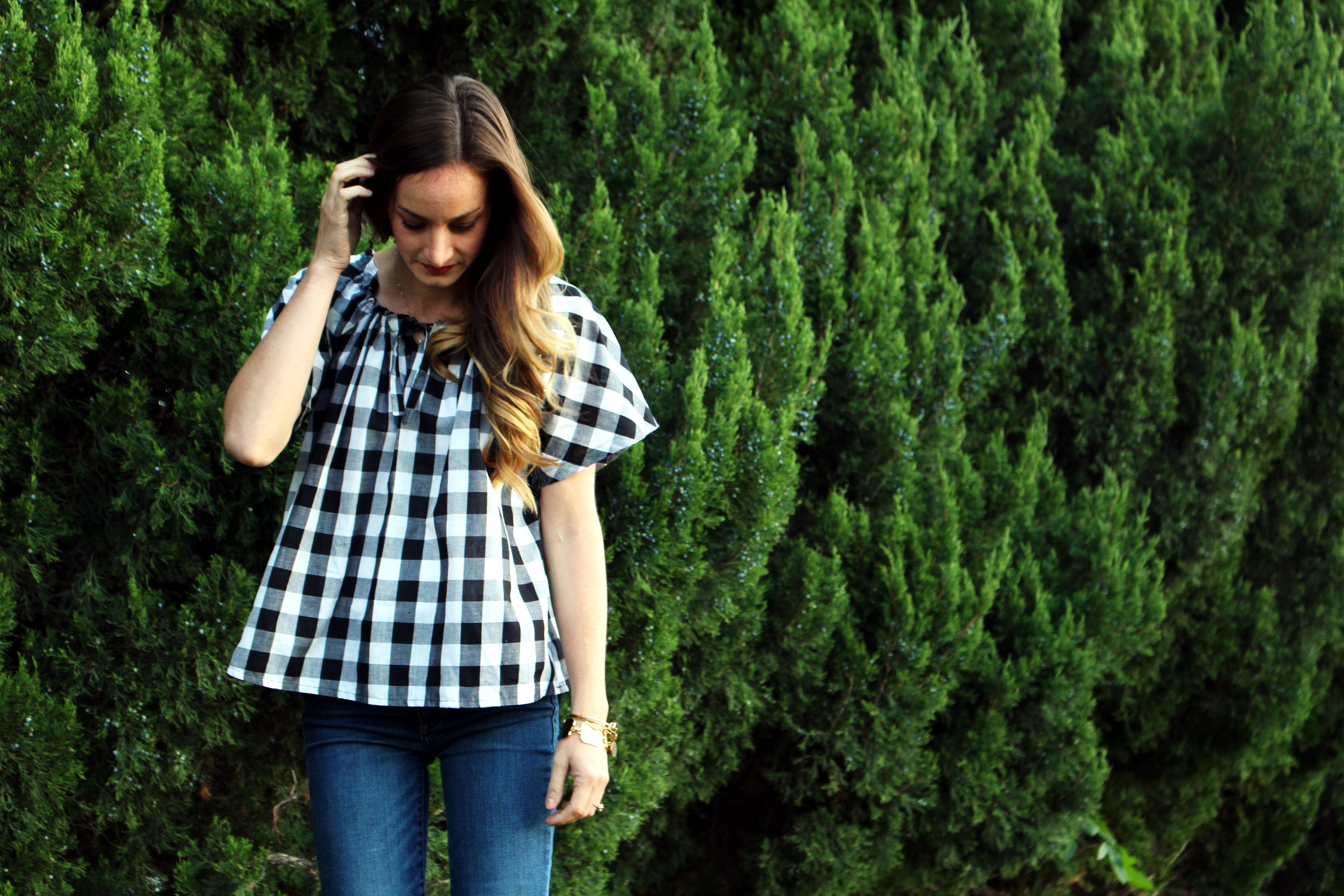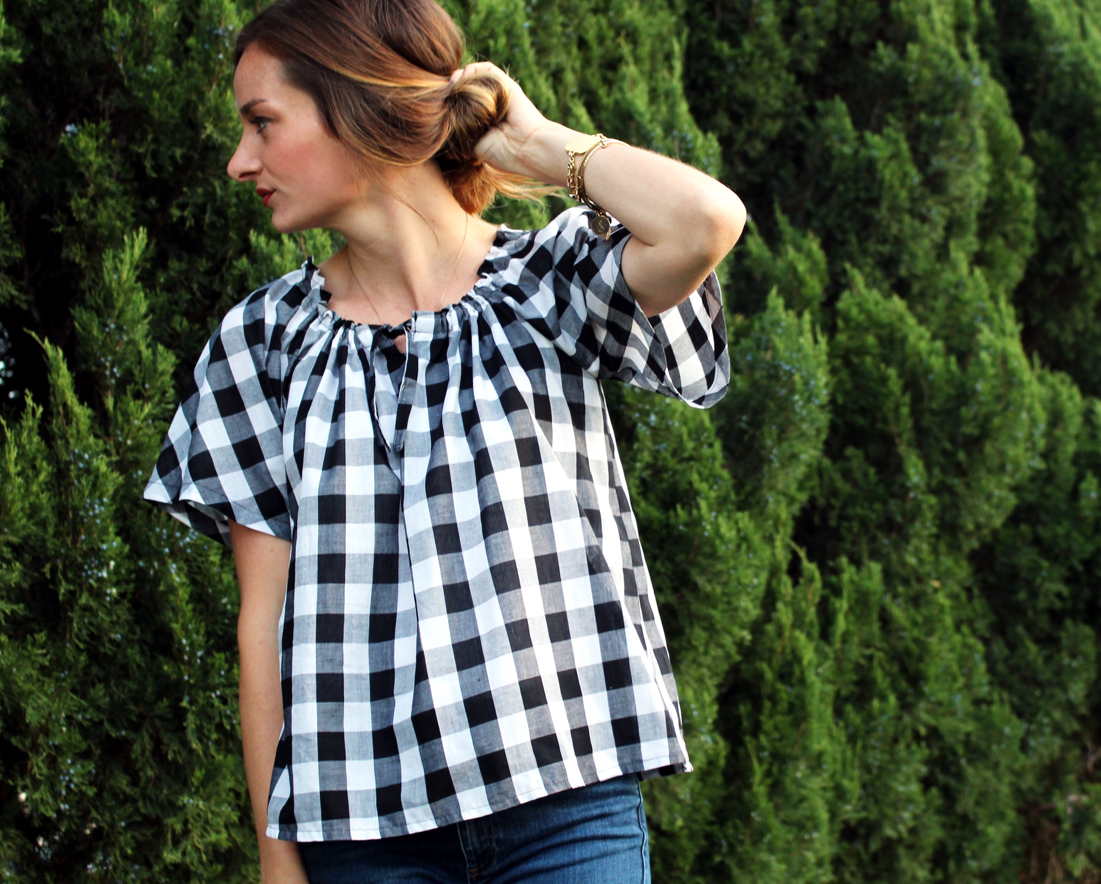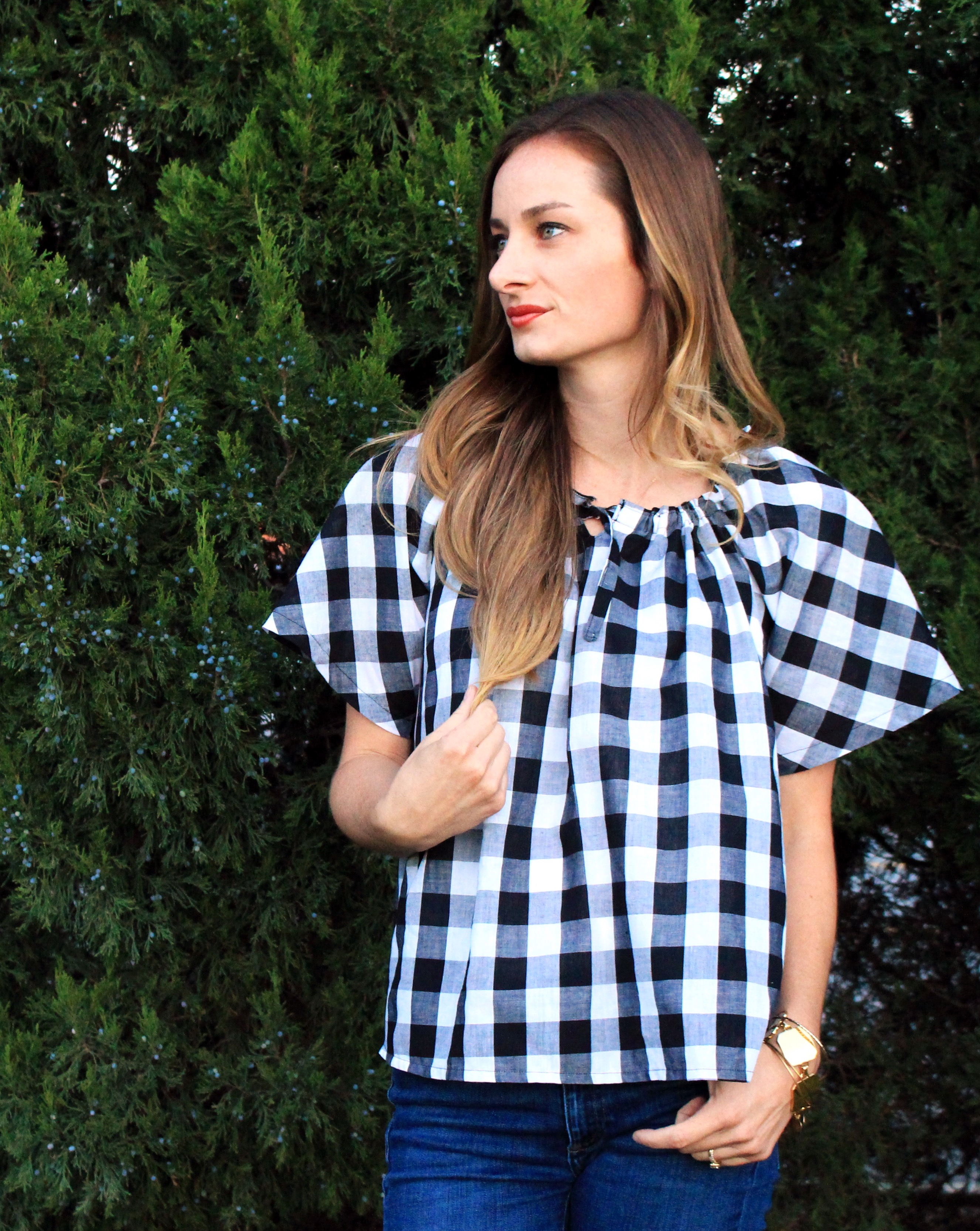 It was hard to pick just one. I really want to make them all, but lets be honest, how could I say no to a buffalo check top? (Pattern P). I went with a slightly bigger print with my fabric, and I really like how bold it reads. I found my fabric at Joann’s. This pattern is SO easy, and simple. I put the whole thing together in a few hours. I blindly followed the pattern in size small. I realllllly wish it was longer. Note to self, don’t trust the picture on the pattern and MEASURE. I was trying to hack this out for a weekend getaway, and didn’t take the time I should have to measure the length. The model must be wearing a few sizes up, a little oversized. I also had to add a little more elastic in the neckline than what the pattern calls for. Other than the length, I am happy with the over all results.