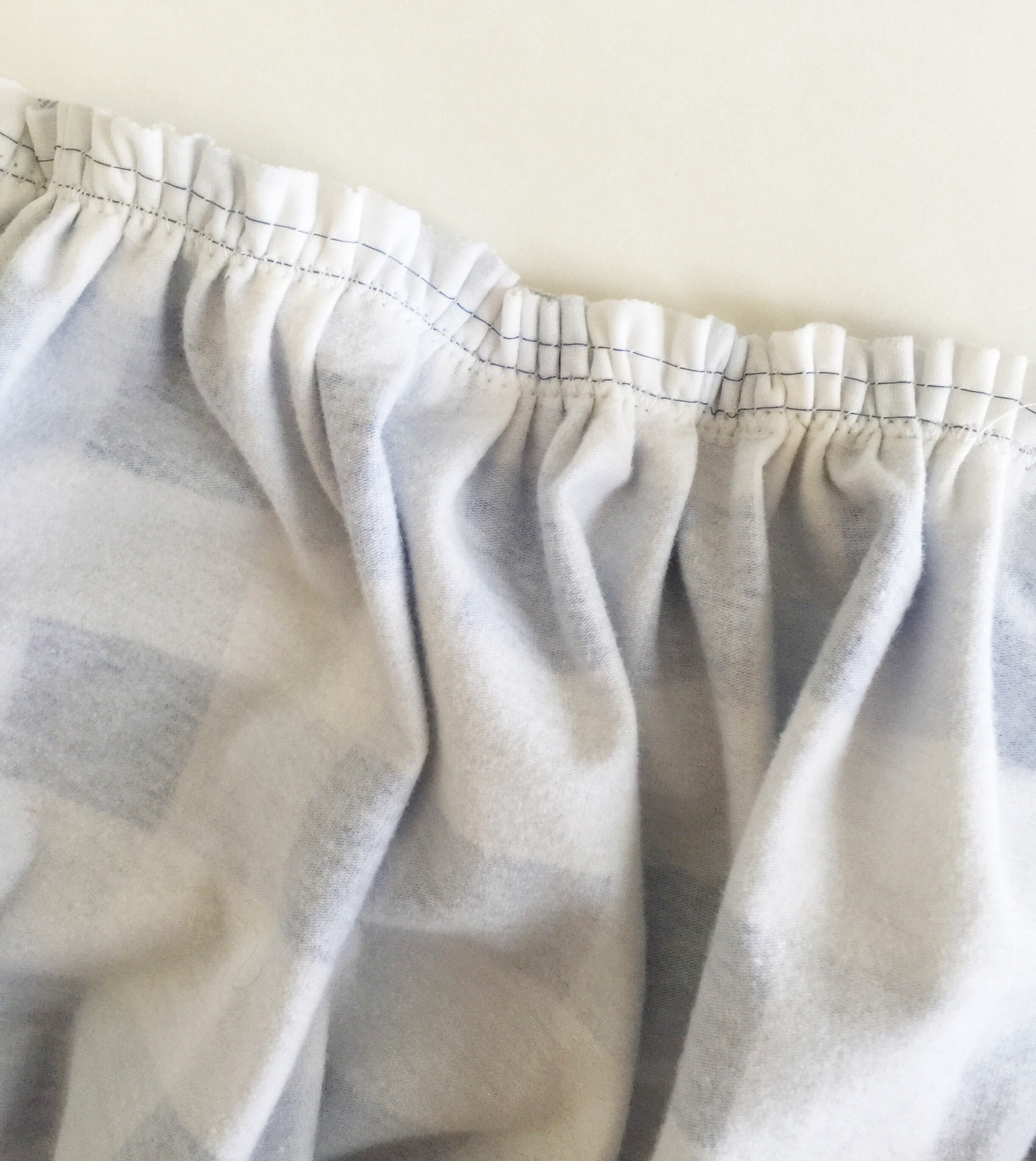 You simply iron it on around the top edge of your fabric, and you’re ready to gather your skirt! There’s also no unpicking involved because the Fuse and Gather is ironed on the backside of your fabric. It’s fab. I like to pin the skirt and bodice pieces right sides together, matching up center front and back, and side seams for both, and then gather the skirt to fit. Evenly spread your gathers, and pin. Sew at 1/2″ around the whole waist edge. This is mine finished: