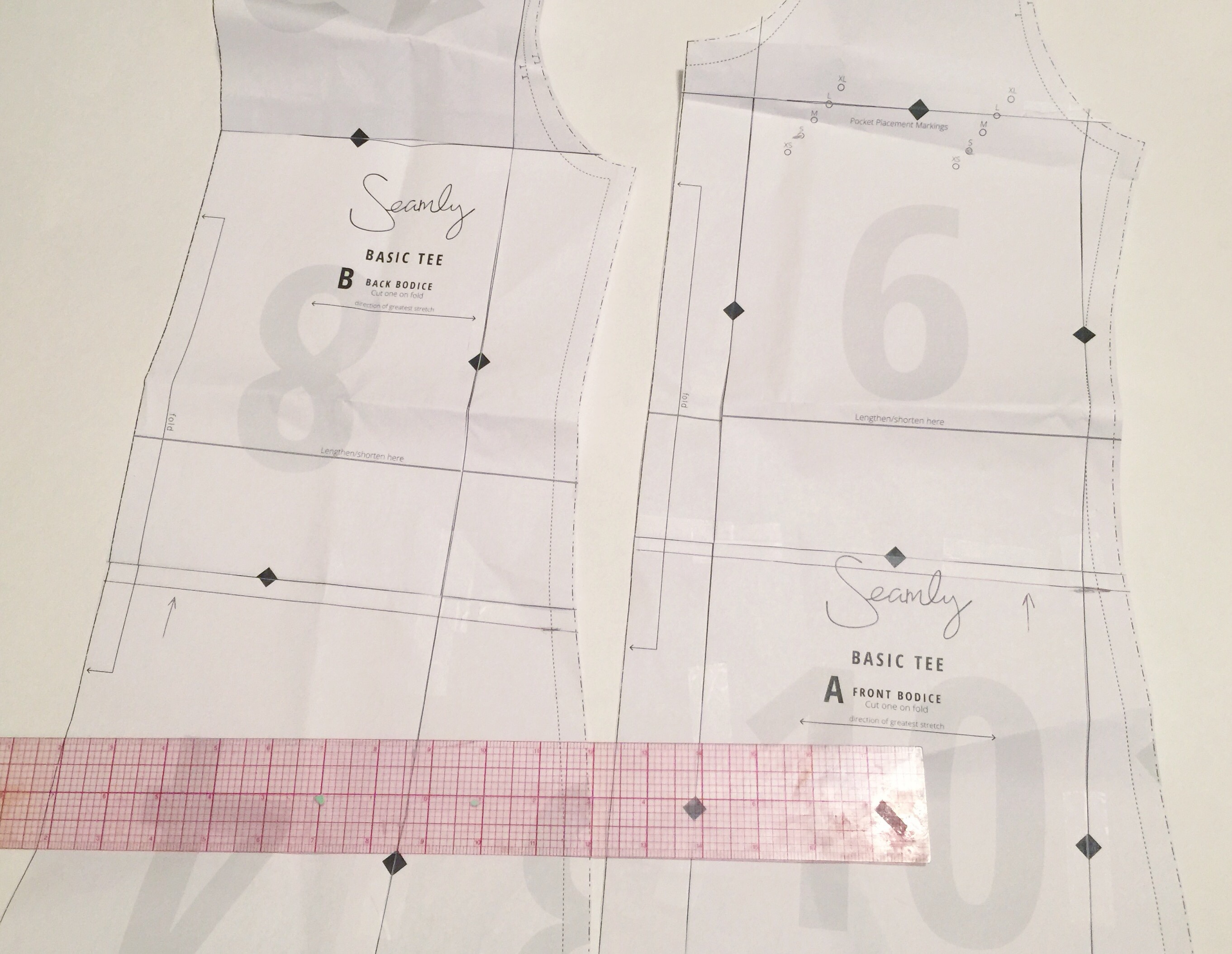 Step 1: First we need to alter our basic tee pattern just slightly. First, trace your pattern off of your original in your preferred size, closest to your measurements. Second, measure from your underarm to your side waist straight down. Add 1/2″ for seam allowance. (Just 1/2″ because the weight of the fabric pulls the waist seam down farther than you intended). Next, mark this measurement on your front and back bodice patterns, and draw a straight line across.
