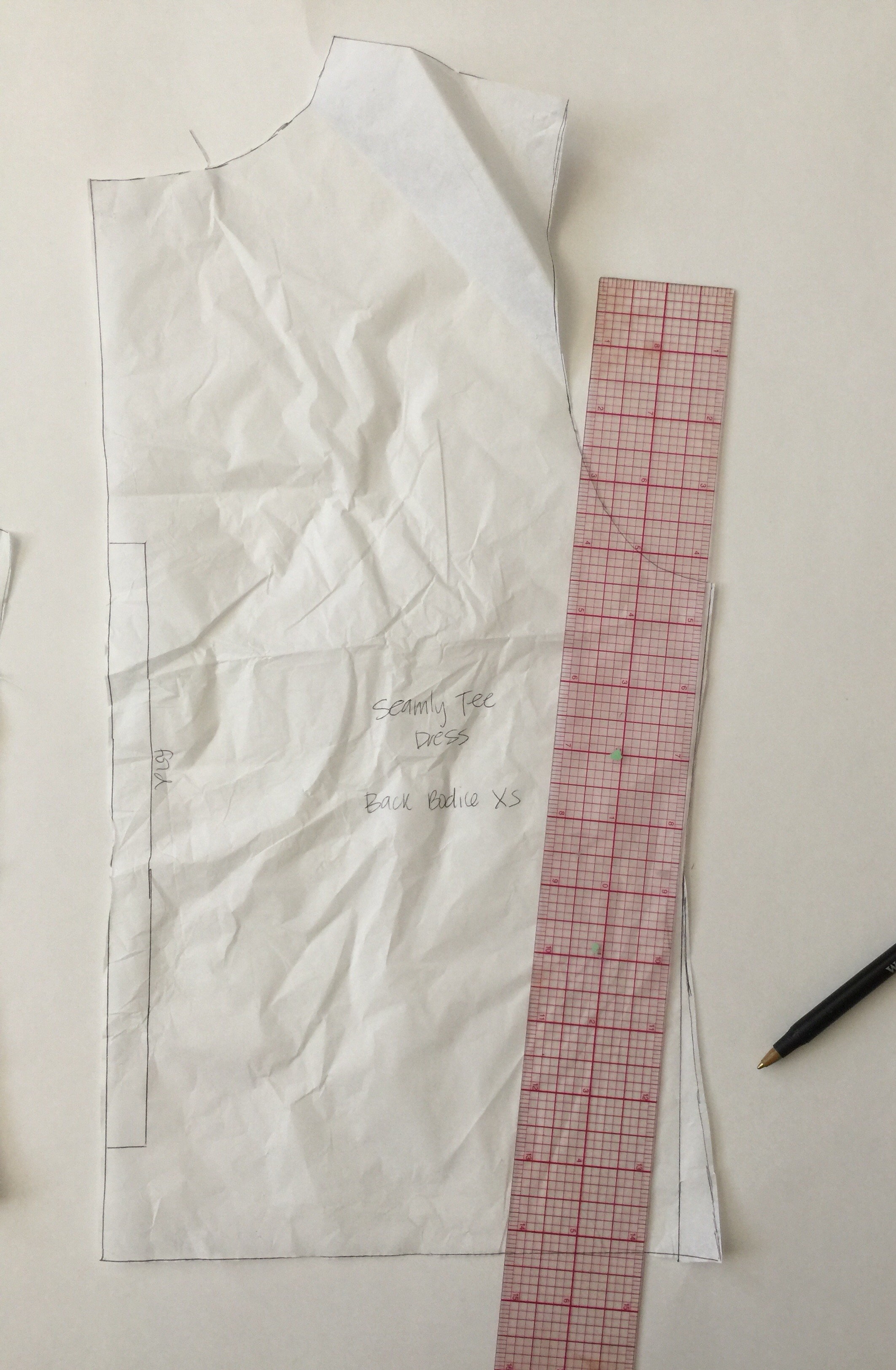 On your traced pattern piece, slightly straighten out the side seams for a more form fitting look, I would recommend doing this, otherwise your side seams stick out a little at the waist. You can see where I straightened mine between the ruler and my pen. (You can also see this in the above picture on both bodice pieces).
