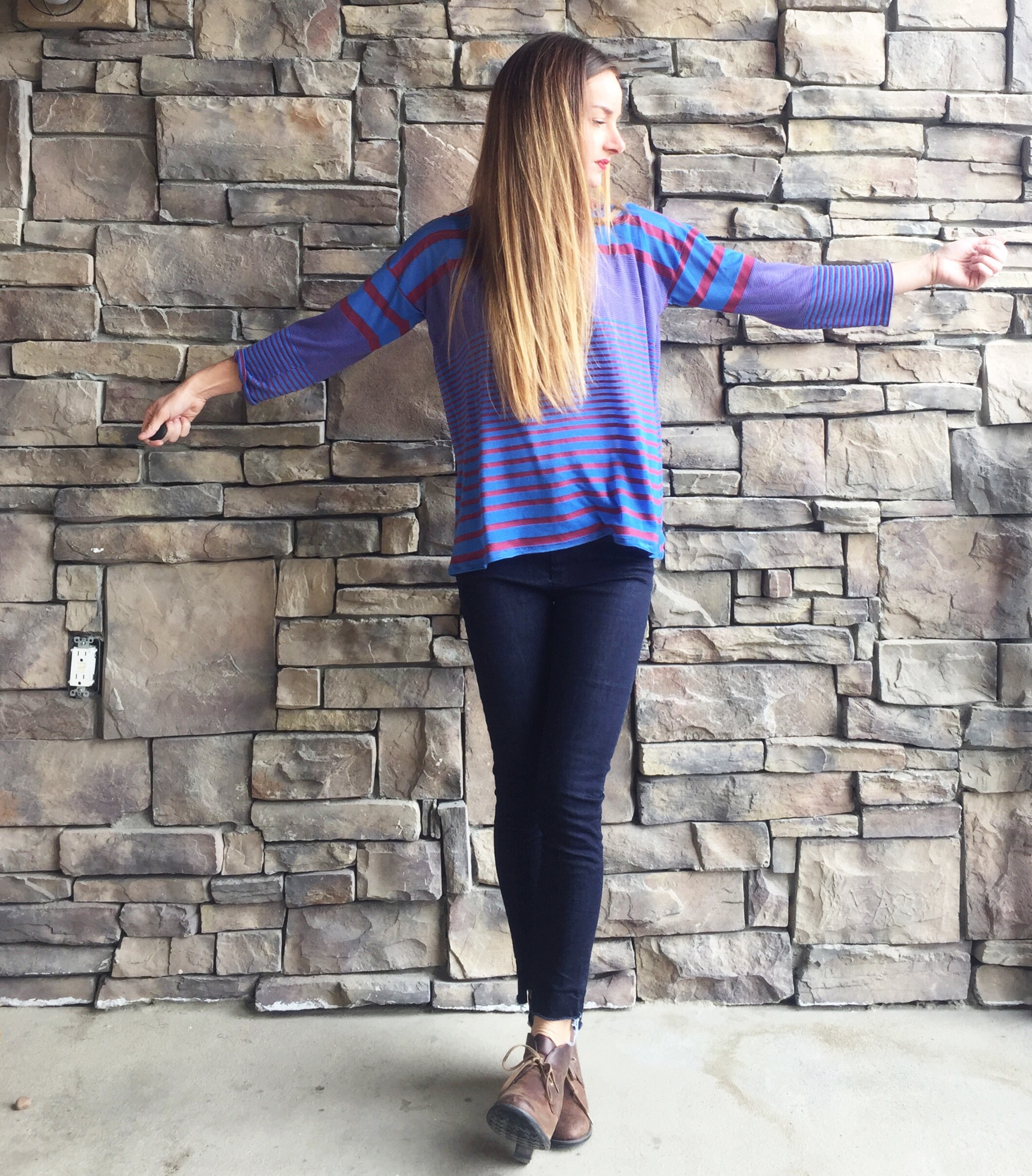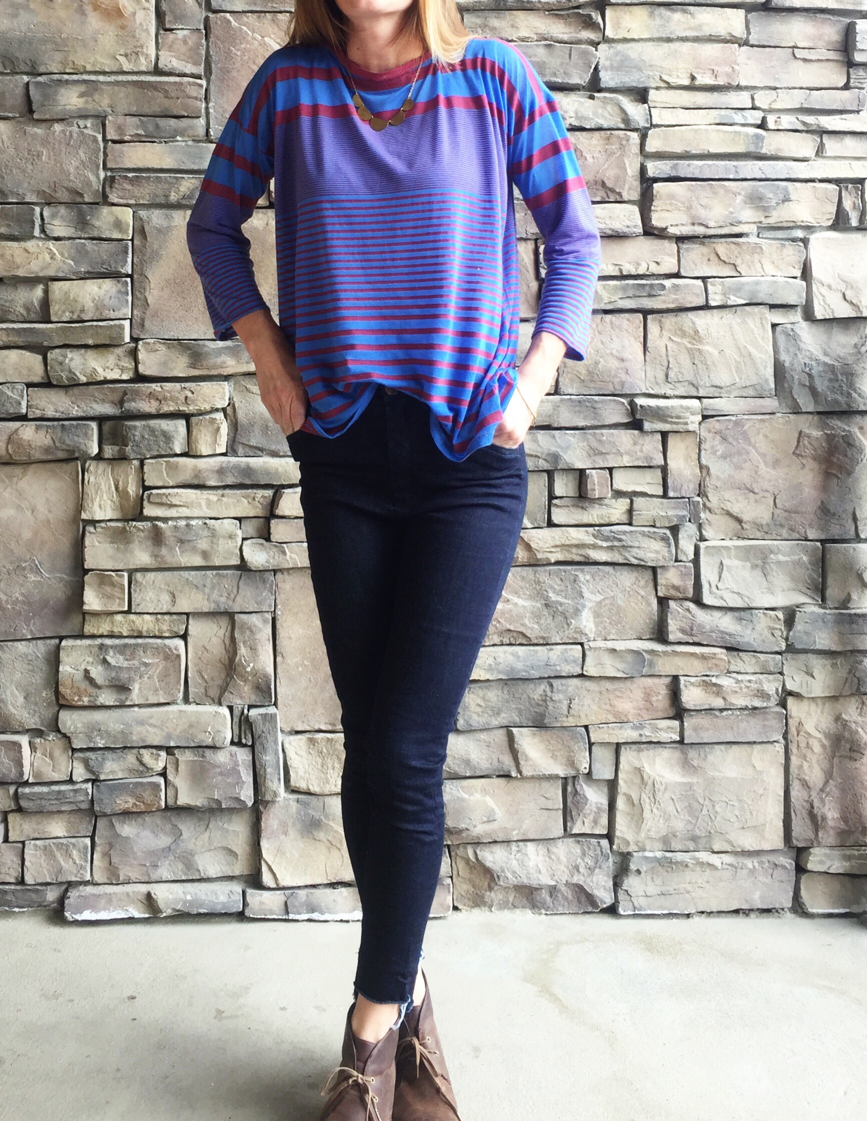 Fab top, love the fabric and the different size stripes and the colours too! It looks great on, perfect for the chillier weather that’s coming.