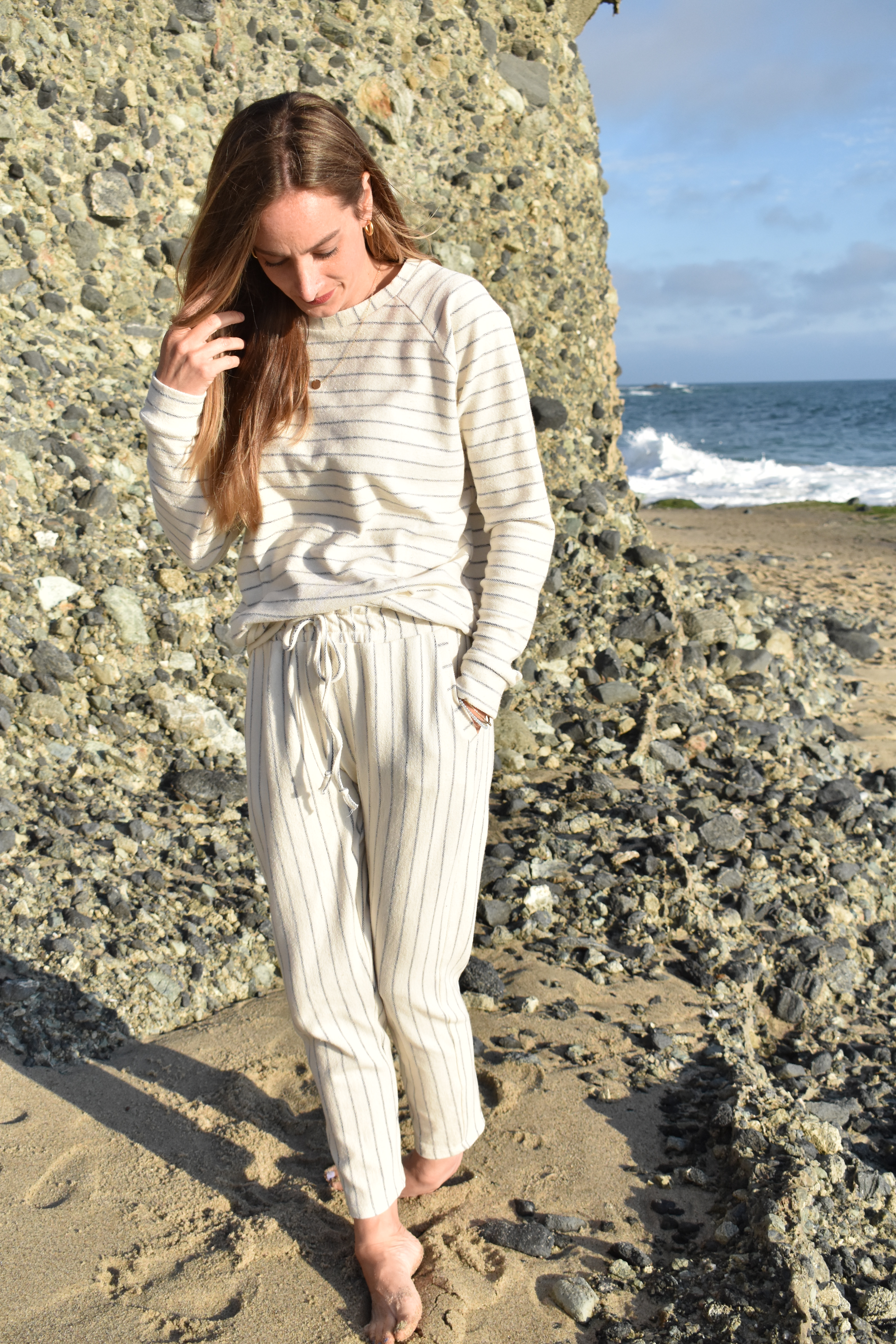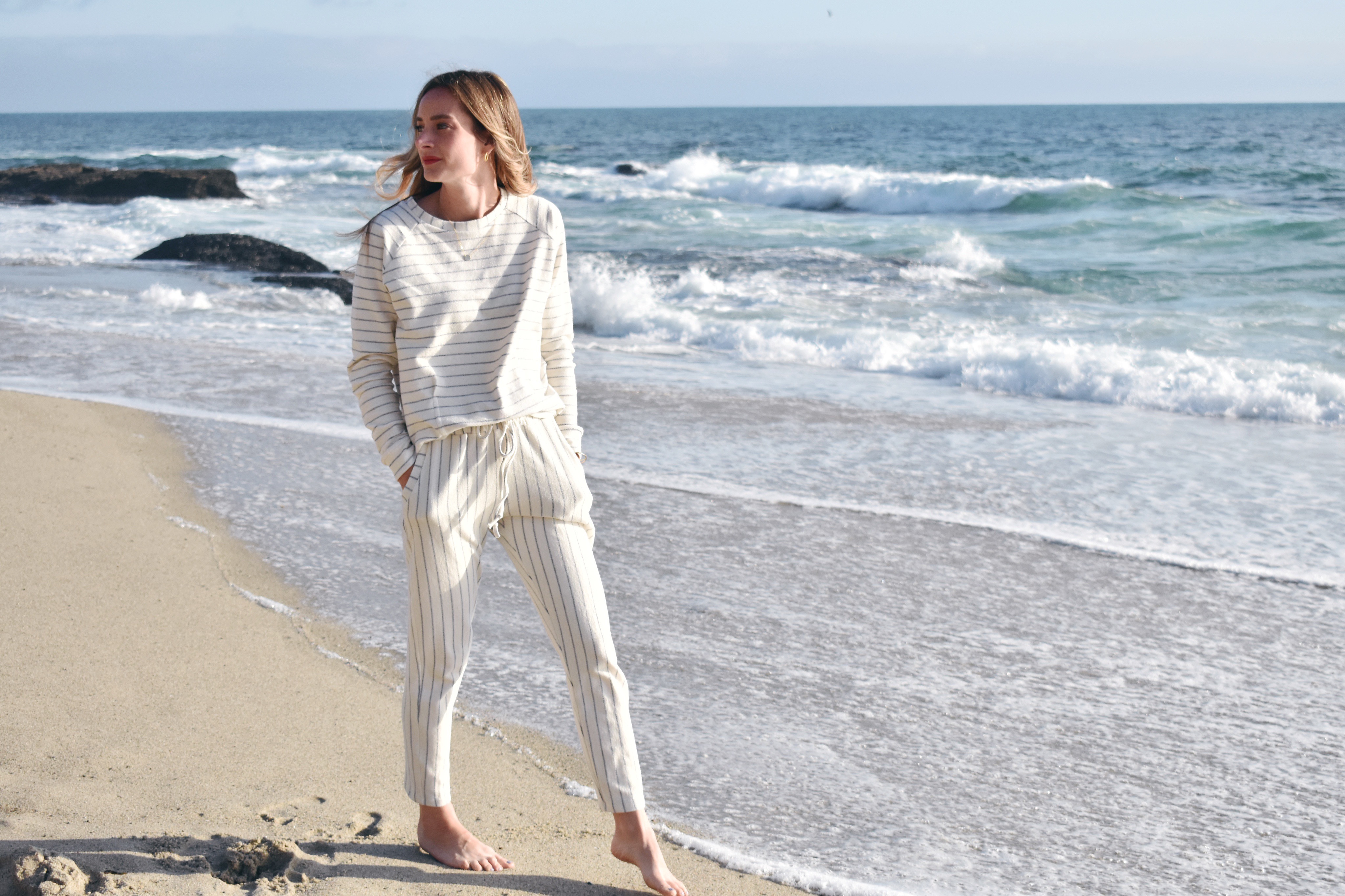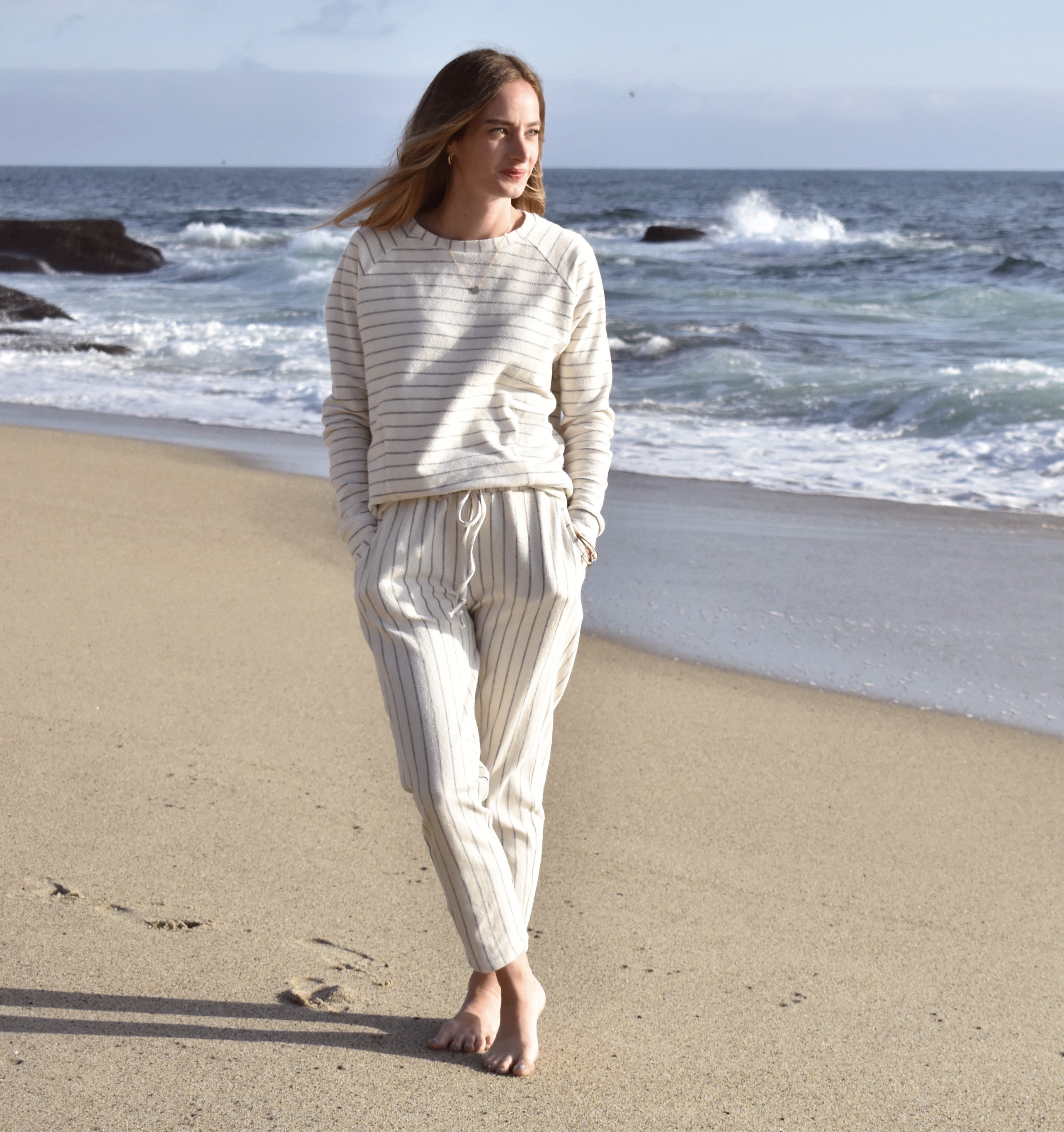 As we head into summer months, I’ve been getting excited for all of the beach days that lie ahead, especially given that we live in Southern California now. JOANN recently launched this cozy + coastal white and navy stripe french terry fabric. It’s a summer dream! One thing I always like to have in the summer is a great pair of cozy joggers, or an easy sweatshirt to throw on for all of those late summer nights when the temperature cools down near the coastline.
