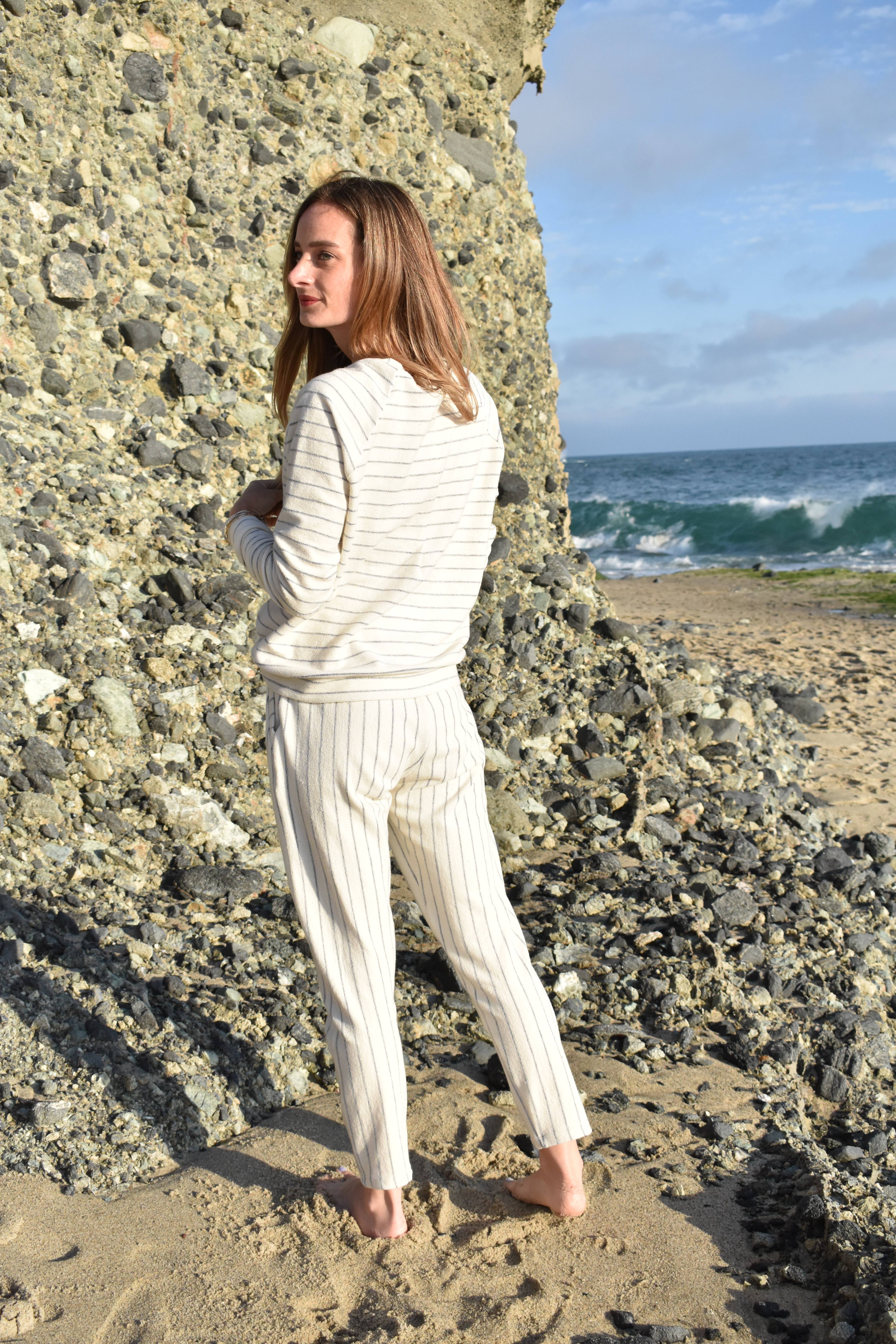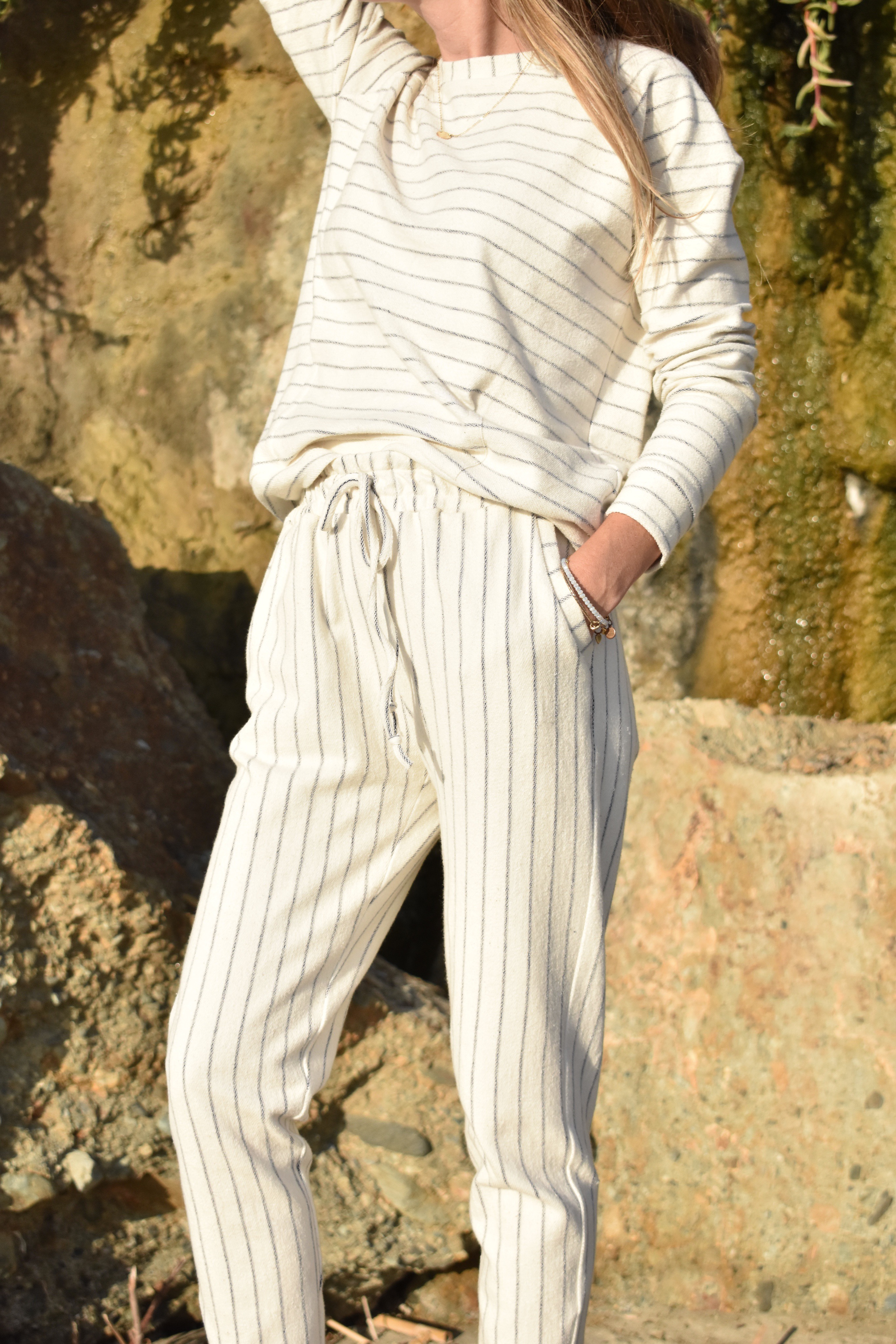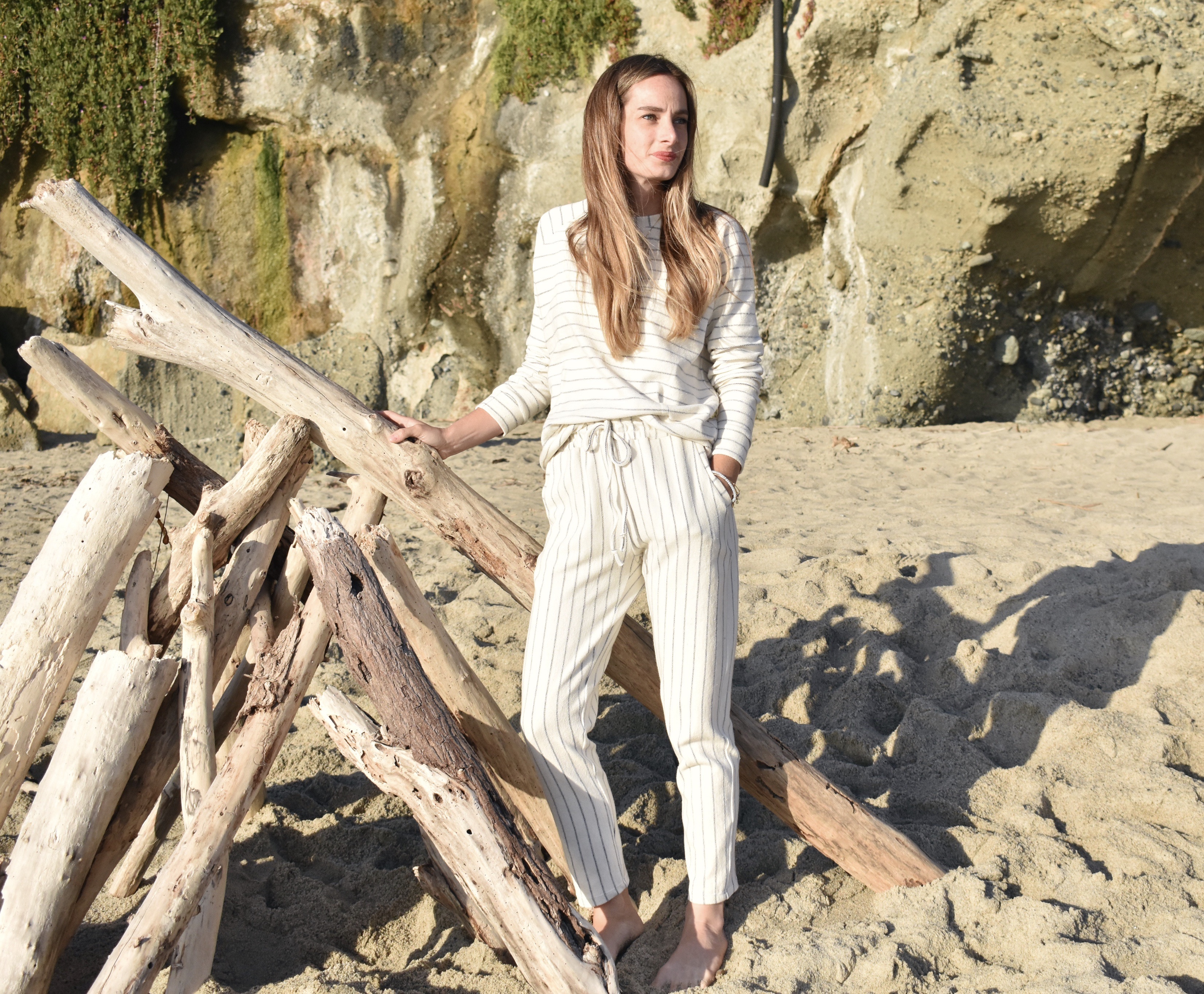 As we head into summer months, I’ve been getting excited for all of the beach days that lie ahead, especially given that we live in Southern California now. JOANN recently launched this cozy + coastal white and navy stripe french terry fabric. It’s a summer dream! One thing I always like to have in the summer is a great pair of cozy joggers, or an easy sweatshirt to throw on for all of those late summer nights when the temperature cools down near the coastline.