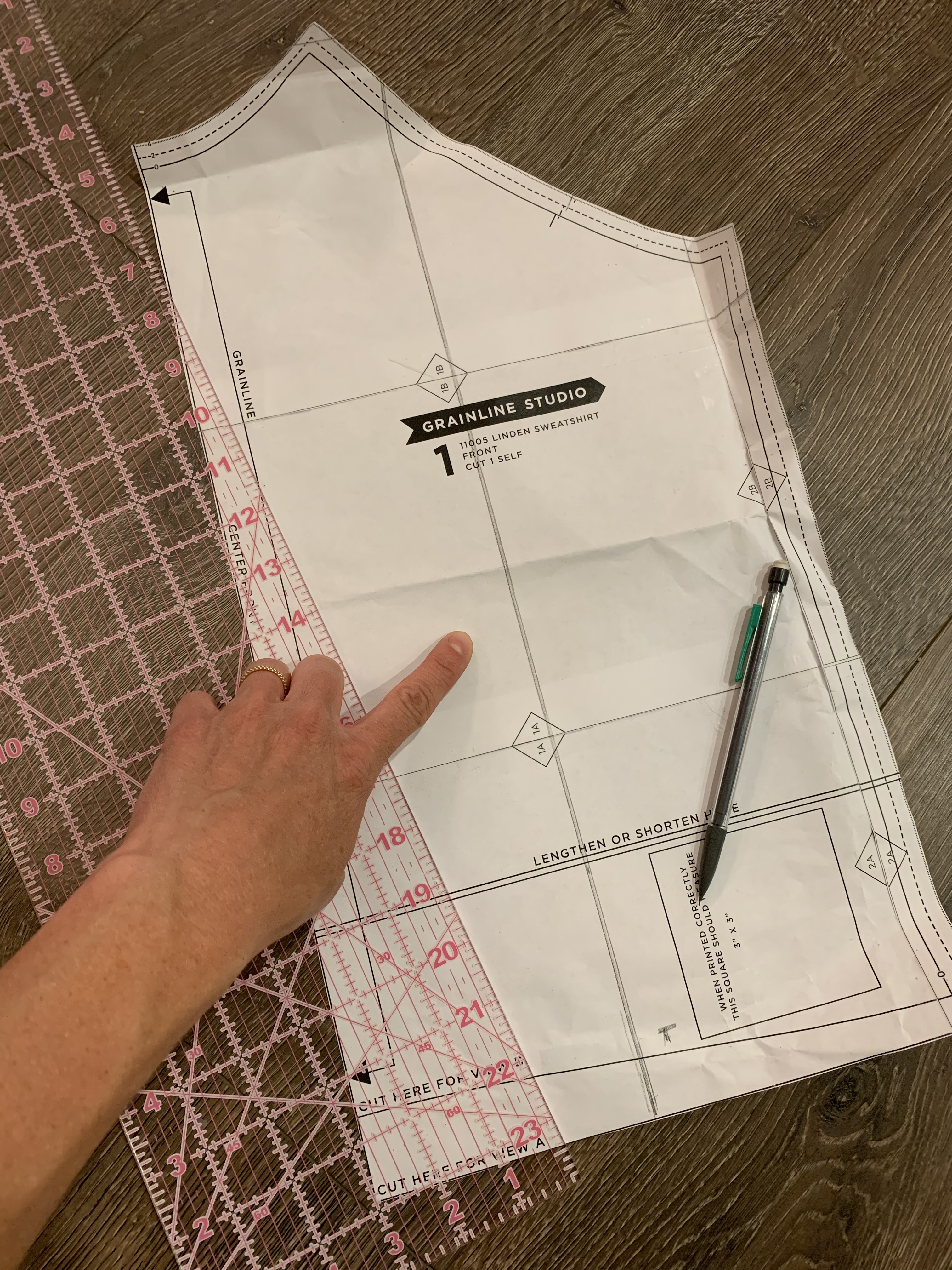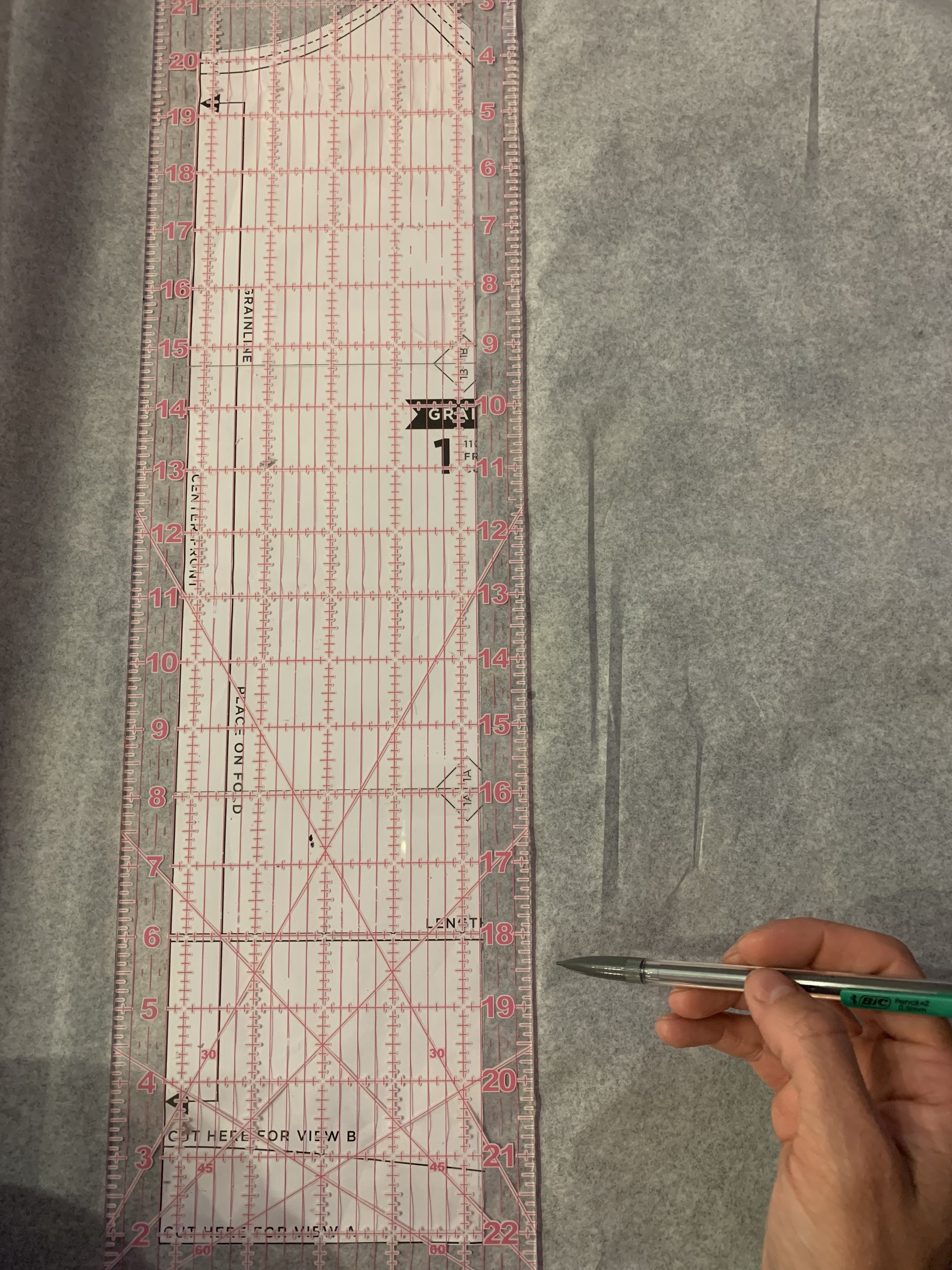 2. Tape the left side of the front bodice to some tracing paper. Measure 3/4″ from the edge using a ruler and draw a line.