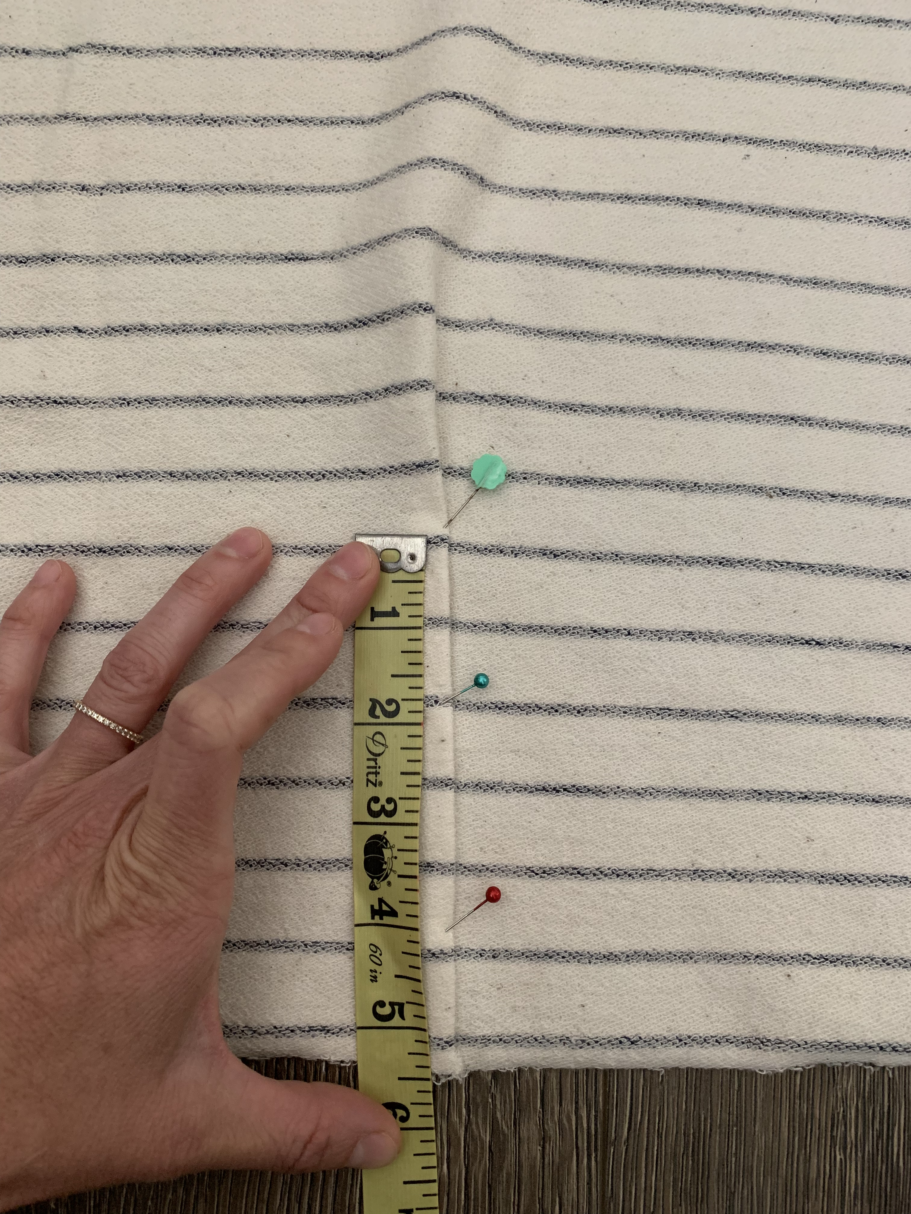 7. Pin the pleat in place 5 1/2″ from the bottom of the sweatshirt.