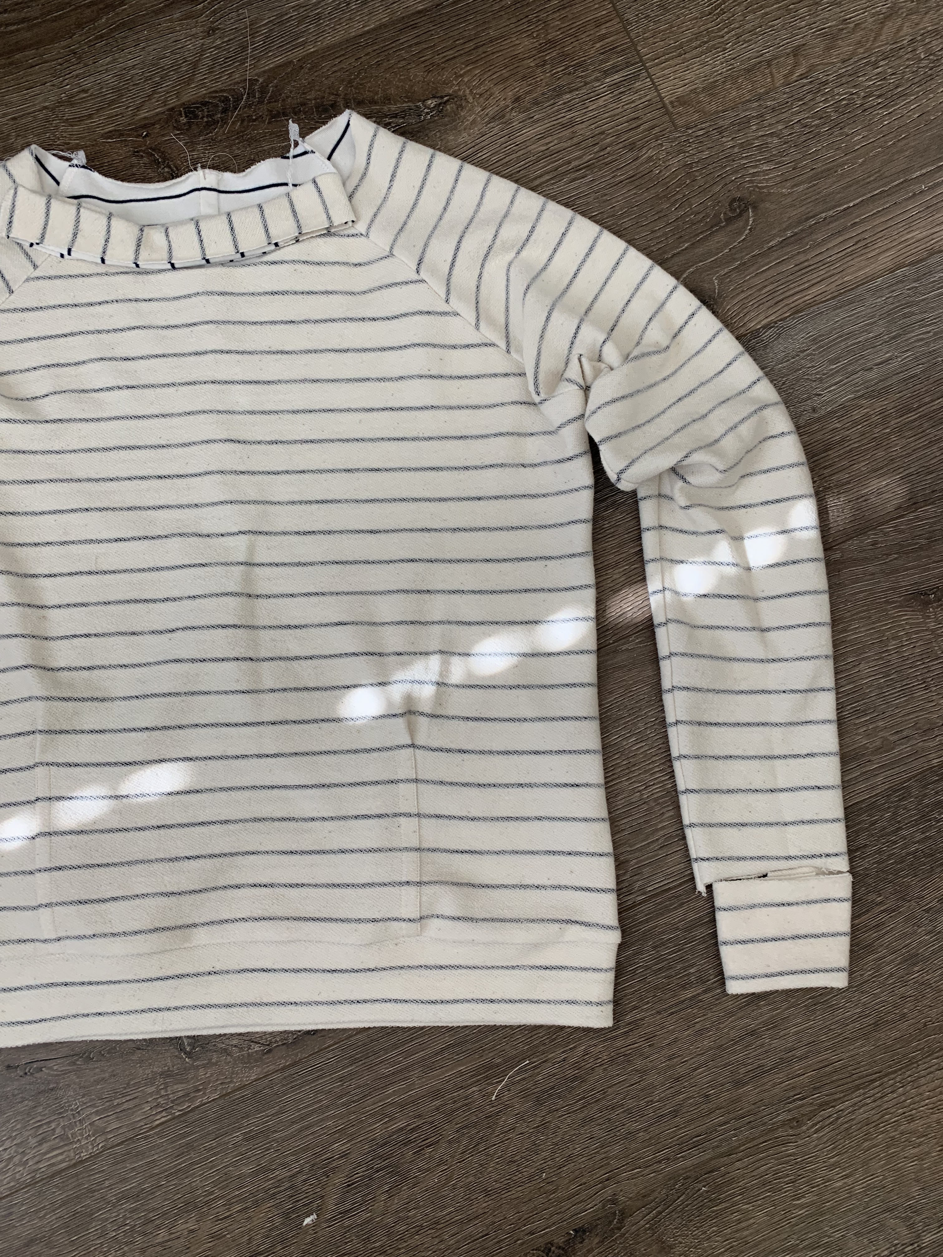 This french terry fabric is sooo good. It’s thick (without being too thick), washes up great, and gives you two look options depending on which side of the fabric you use. I love playing with stripes and had a lot of fun planning how I would use them in this project. I used the stripe horizontally for the sweatshirt with a vertical neckband to match the vertical stripe on the pants.