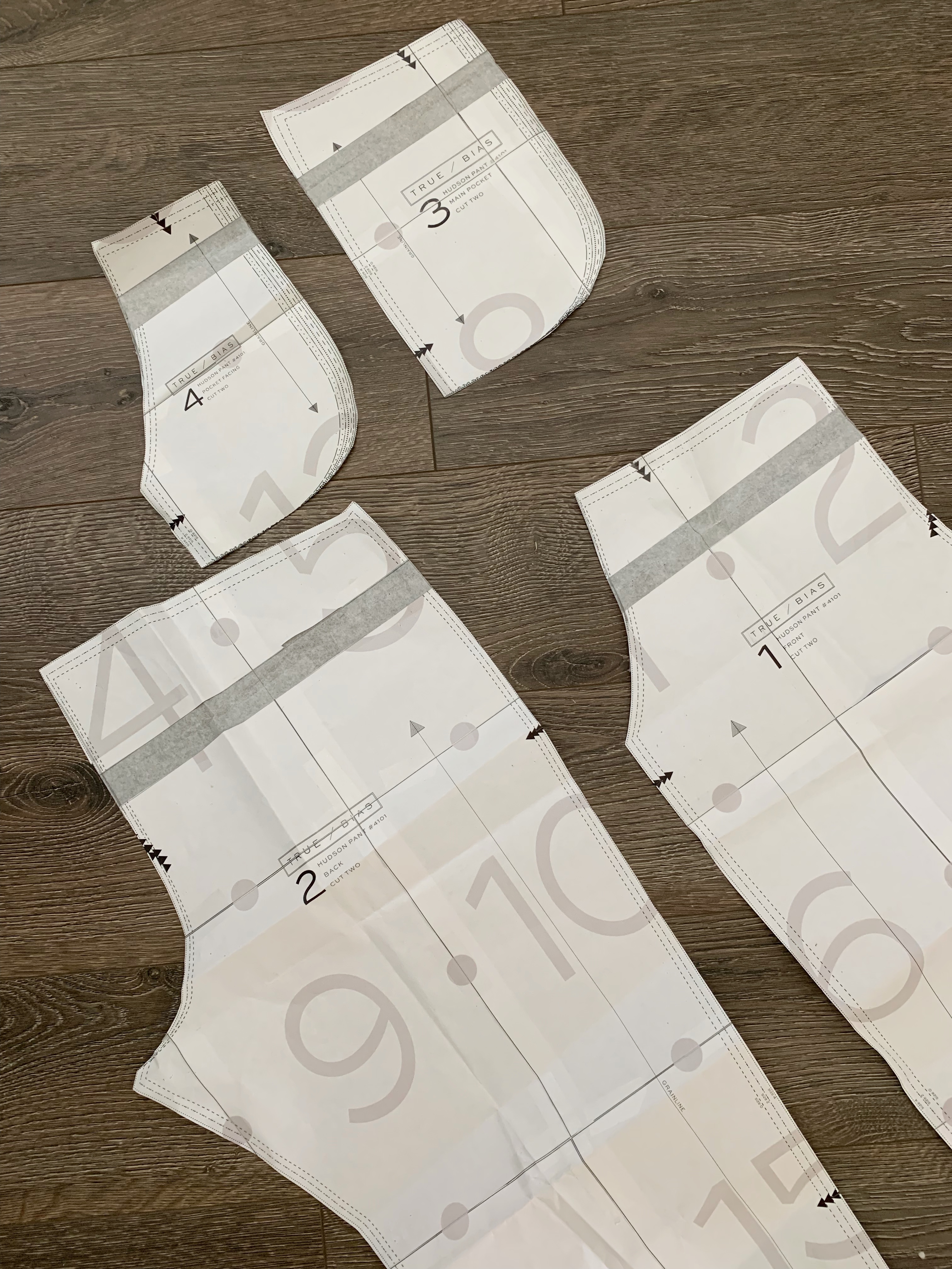 For the pants, I used the Hudson Pants jogger pattern by True Bias. I added 1″ to the rise of the front and back pant pieces because I wanted a slightly higher waisted fit. If you wish to do this too, make sure to add 1″ to the two pocket pieces as well. This is what my pattern pieces looked like: