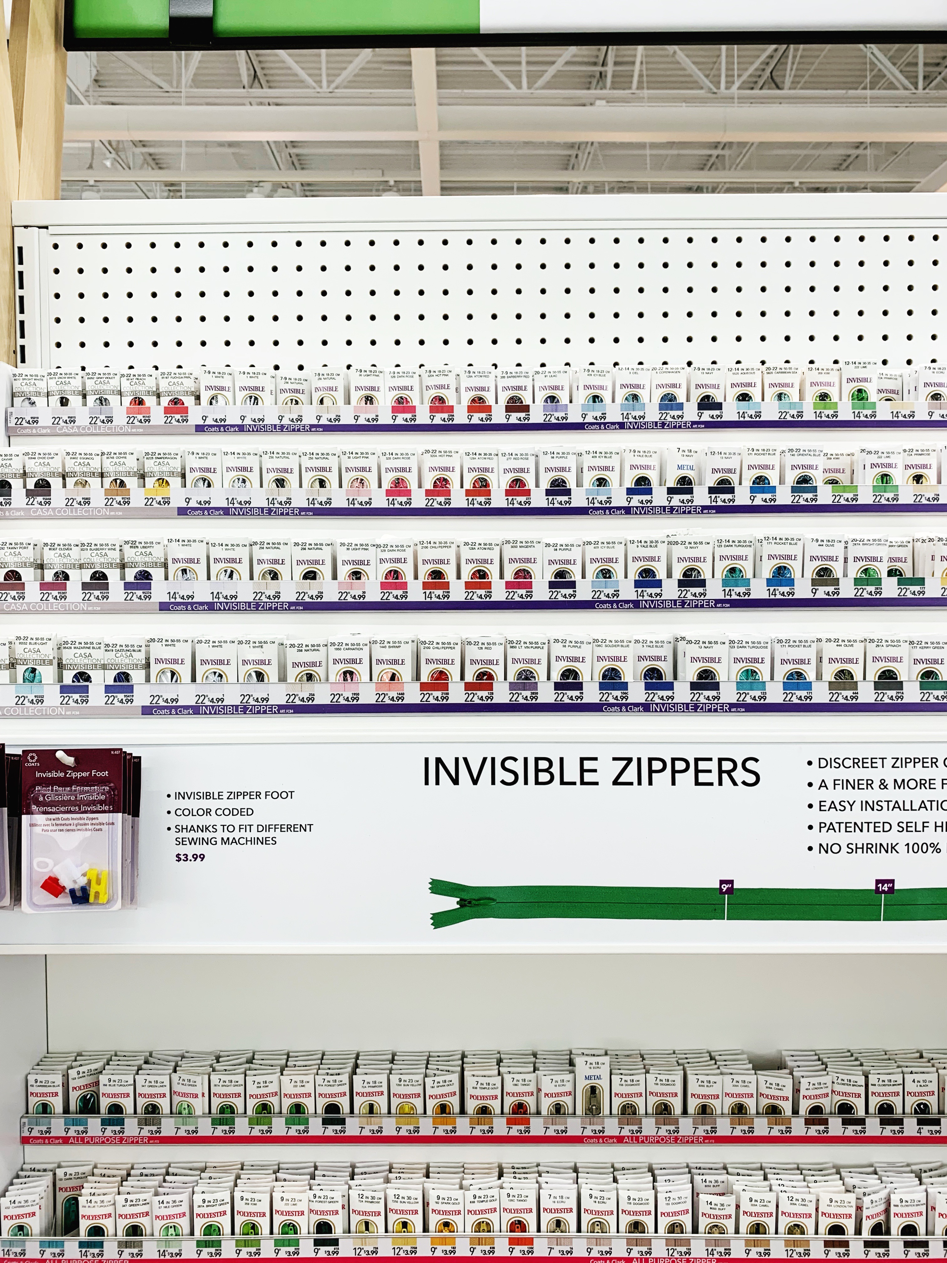 I never thought a bunch of displayed zippers could make me feel so happy. How clean and fresh does this look!? It’s stocked, color coordinated and so easy to navigate. The thread and other sewing notions are also organized similarly, and it looks so nice.