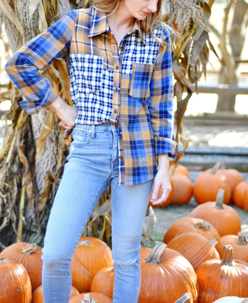 Every single year I make a plaid flannel button up shirt. It’s become a fall tradition! When JOANN asked me if I could make something using their Plaiditude fabrics, I knew the tradition would continue on this year! I wanted to mix things up a little bit this time around and I came up with the idea of using a few different plaids from the very plentiful plaid JOANN line up to create a unique, mixed plaid button up shirt.