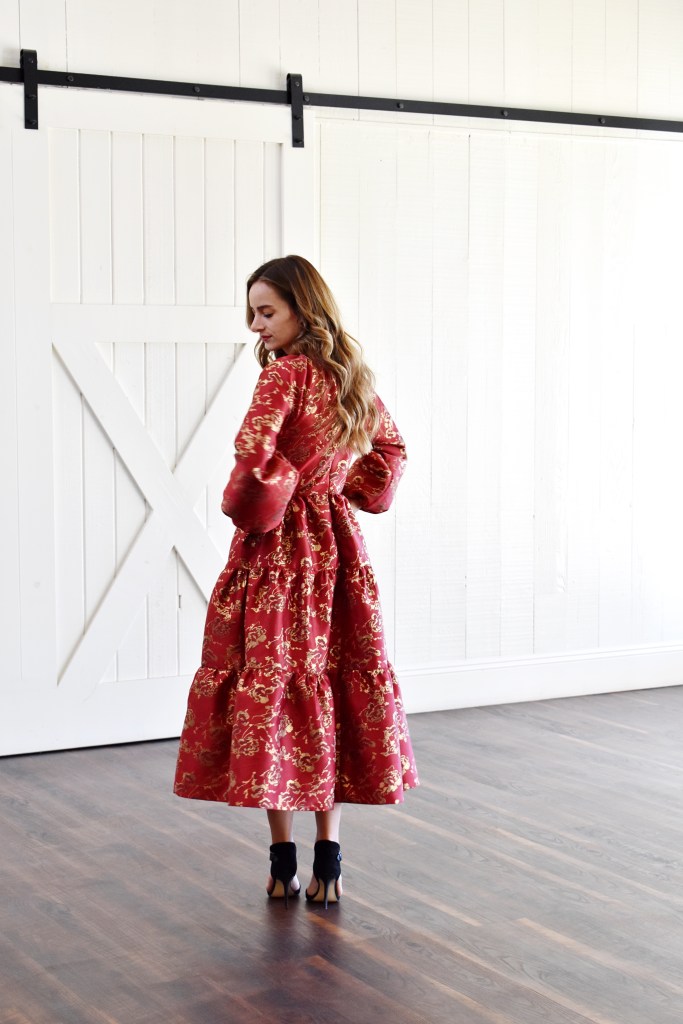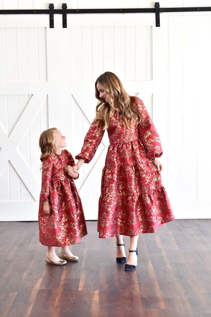 It’s December!! This month’s project is a holiday dress inspired by a Ulla Johnson Dress I recently fell in love with. JOANN has some really beautiful brocade fabrics perfect for sewing special occasion dresses and I chose this Floral Metallic Rio Red Brocade fabric. I had some extra fabric left over when I finished my dress so I made up a little matching dress for my daughter too. I can’t wait to wear these together to some of our upcoming holiday events.