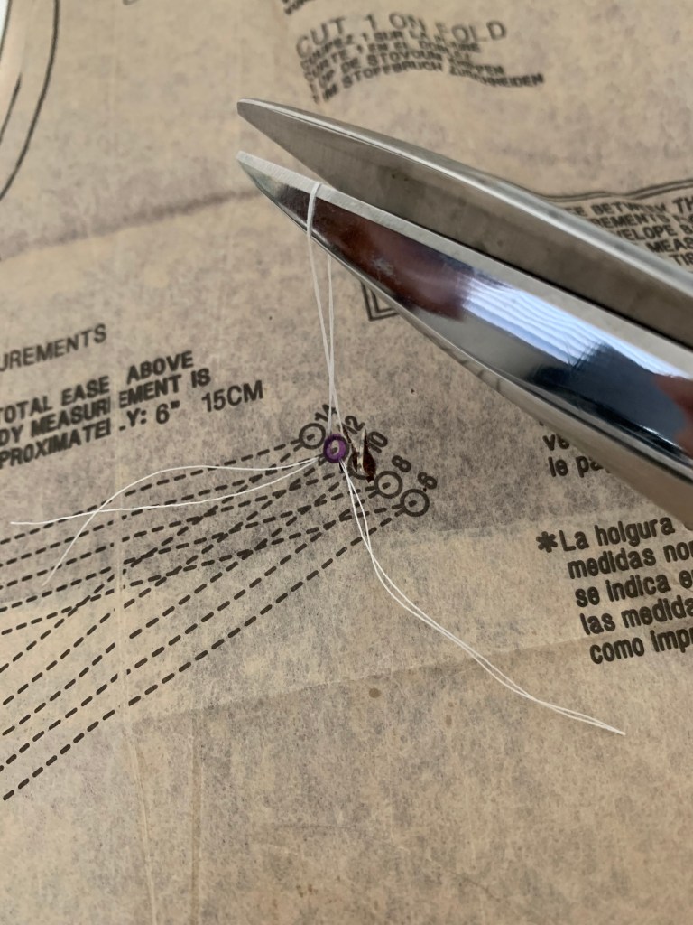 3. Cut the top of the loop in half, and ever so gently pull the pattern off of the fabric. If you are marking two layers at once, gently pull the two layers apart but not all the way. Cut the tailor’s tack threads in half between the layers.