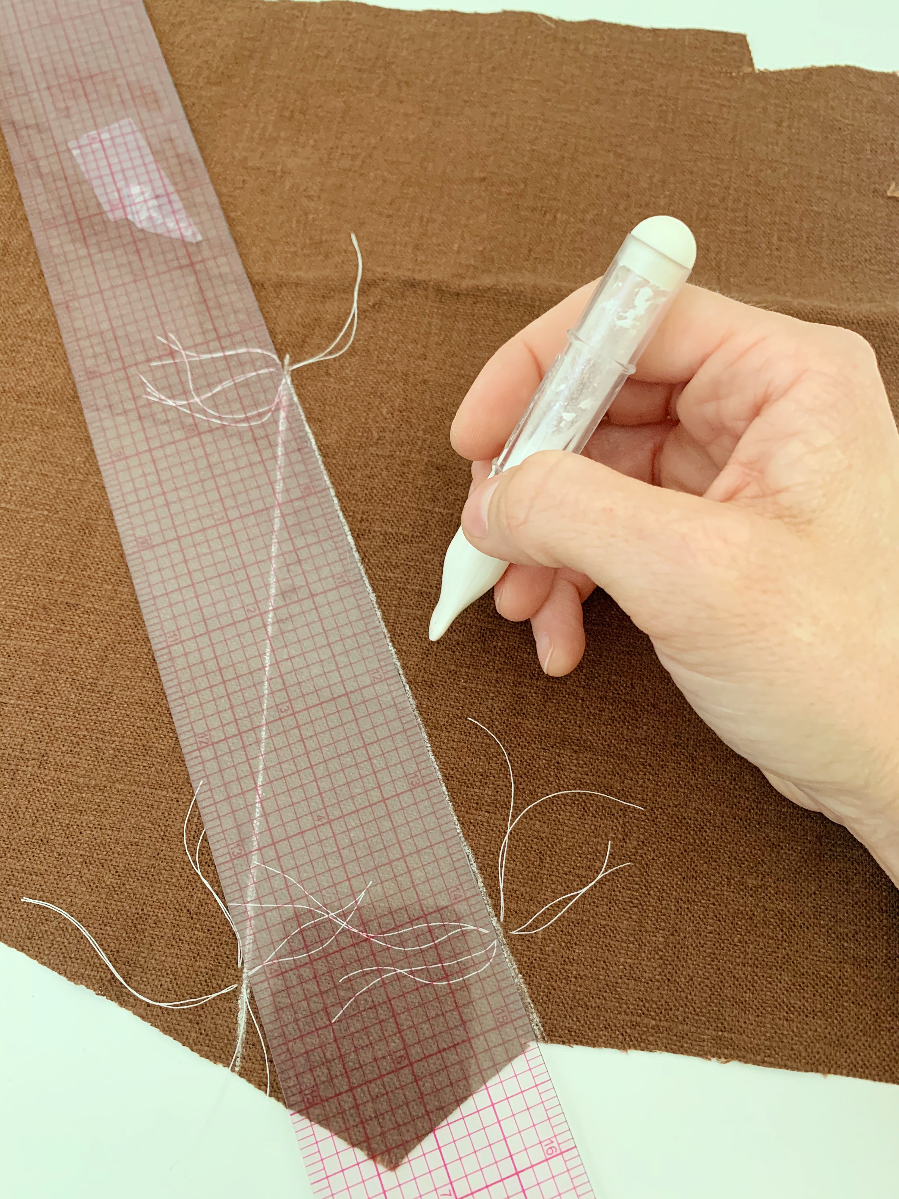 4. Then, using a ruler and chalk, connect the tailor’s tacks to draw the legs and point of the dart. You could also sew many tailor’s tacks up and down the length of the dart leg to avoid using chalk. I like to leave the tailor’s tacks in place for the sewing portion of the dart- it helps to line up the legs of the dart evenly.