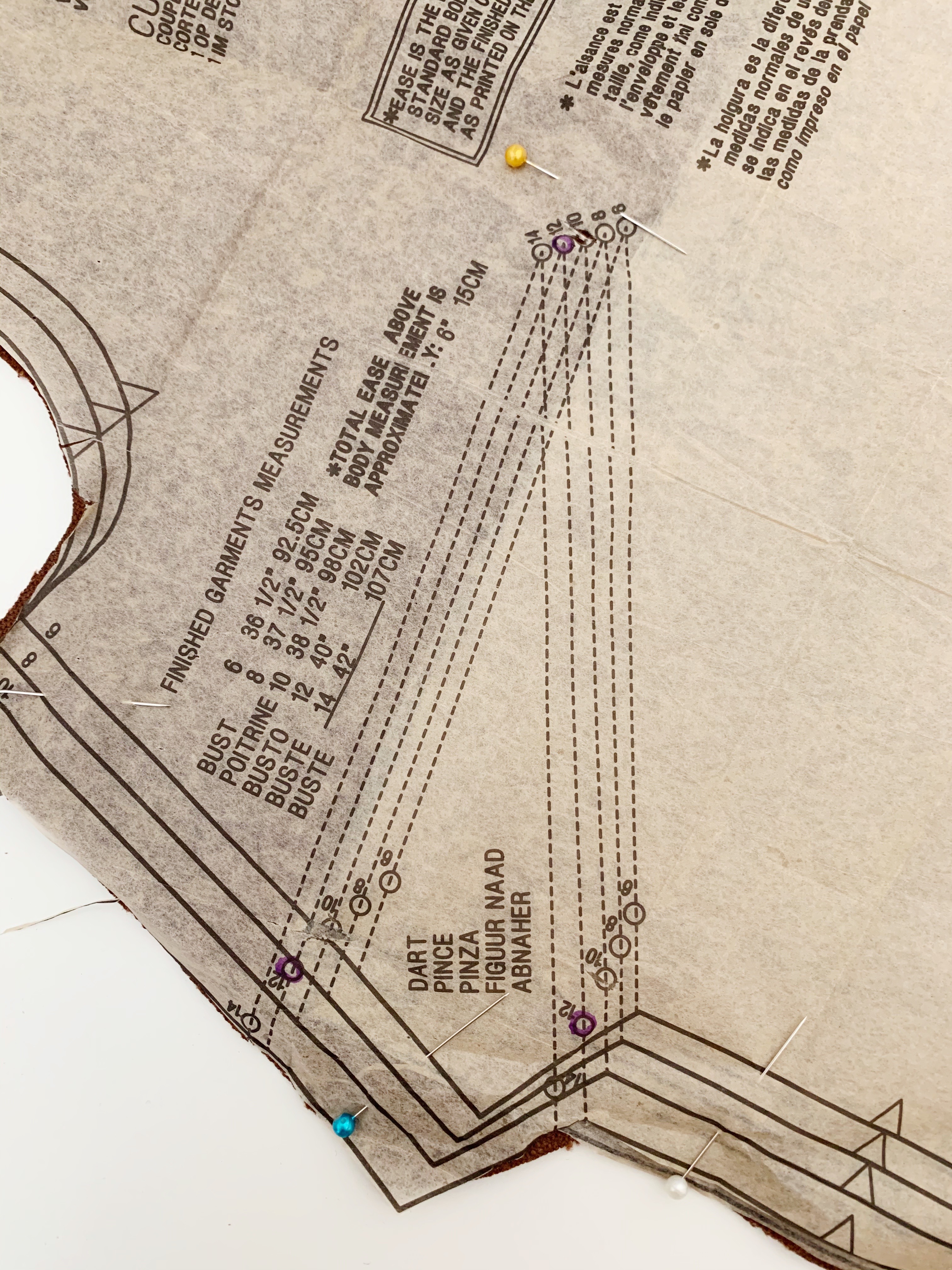 - Mark and trace the dart onto your fabric, remove paper pattern.
