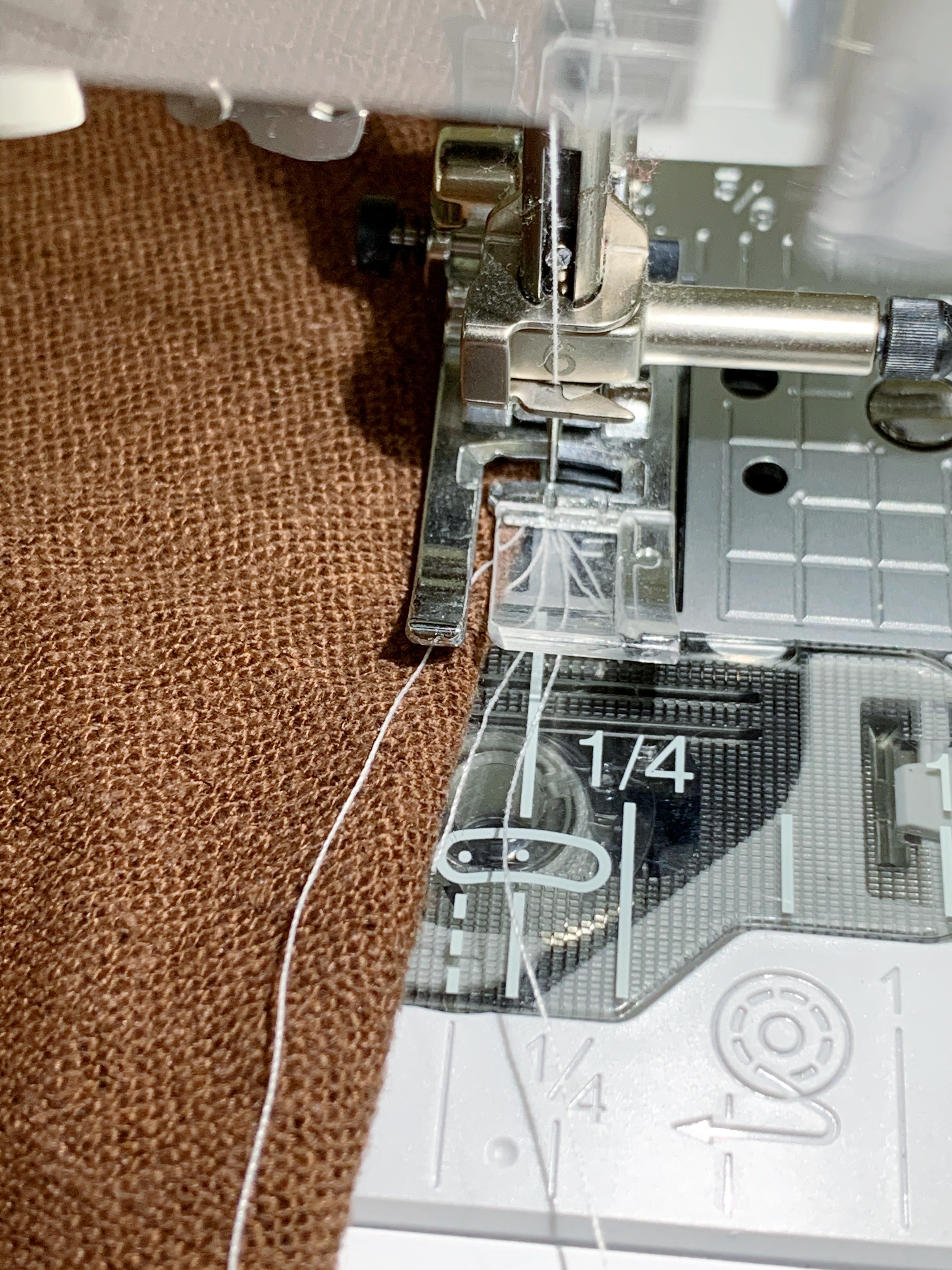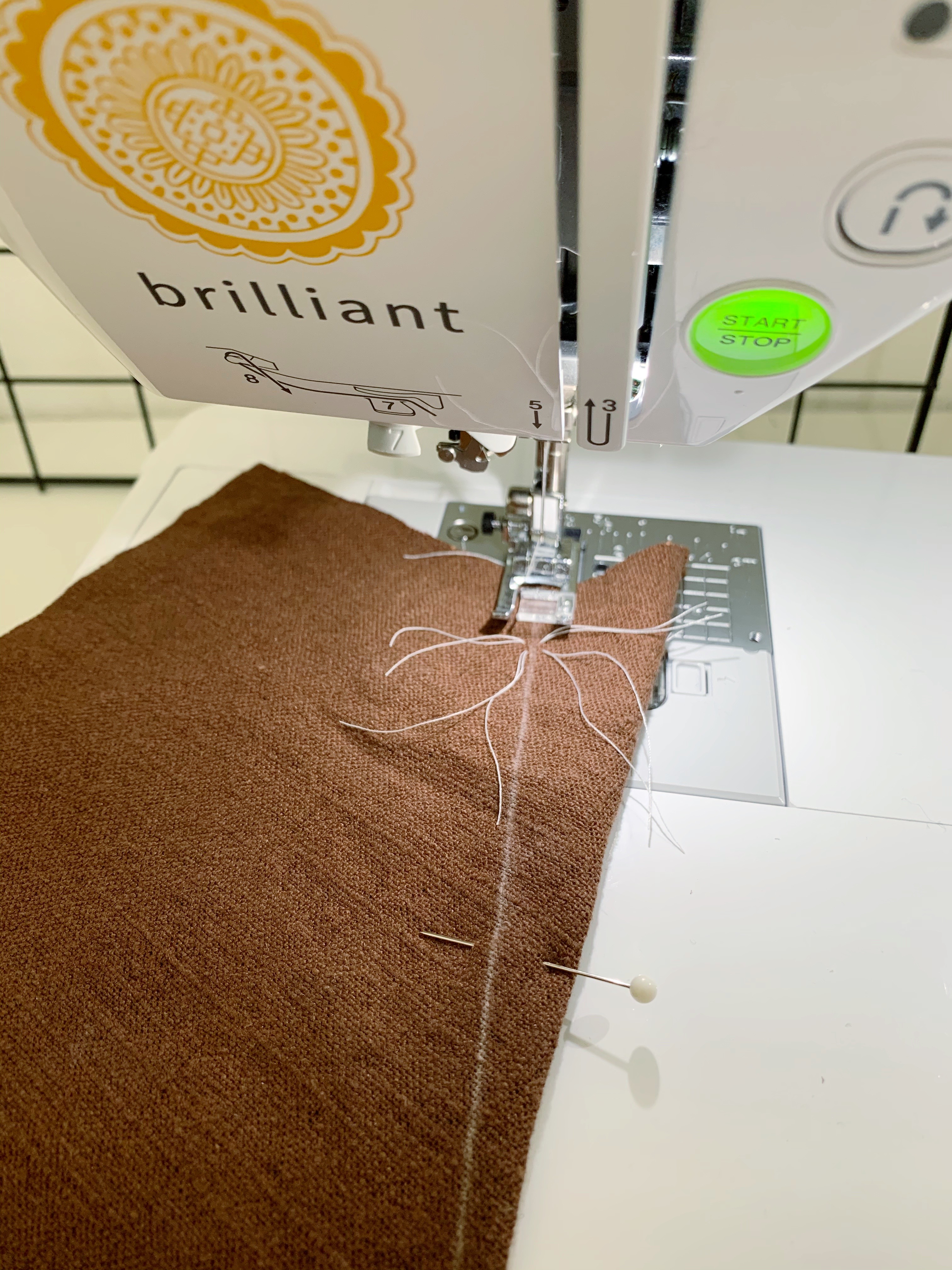 3. Time to sew! I used contrasting thread to make the stitches easier to see, but make sure to pick a thread color that matches your fabric. Starting at the bottom of the dart legs (opposite side of the dart tip), begin sewing along your chalk mark, making sure to backstitch at the beginning.