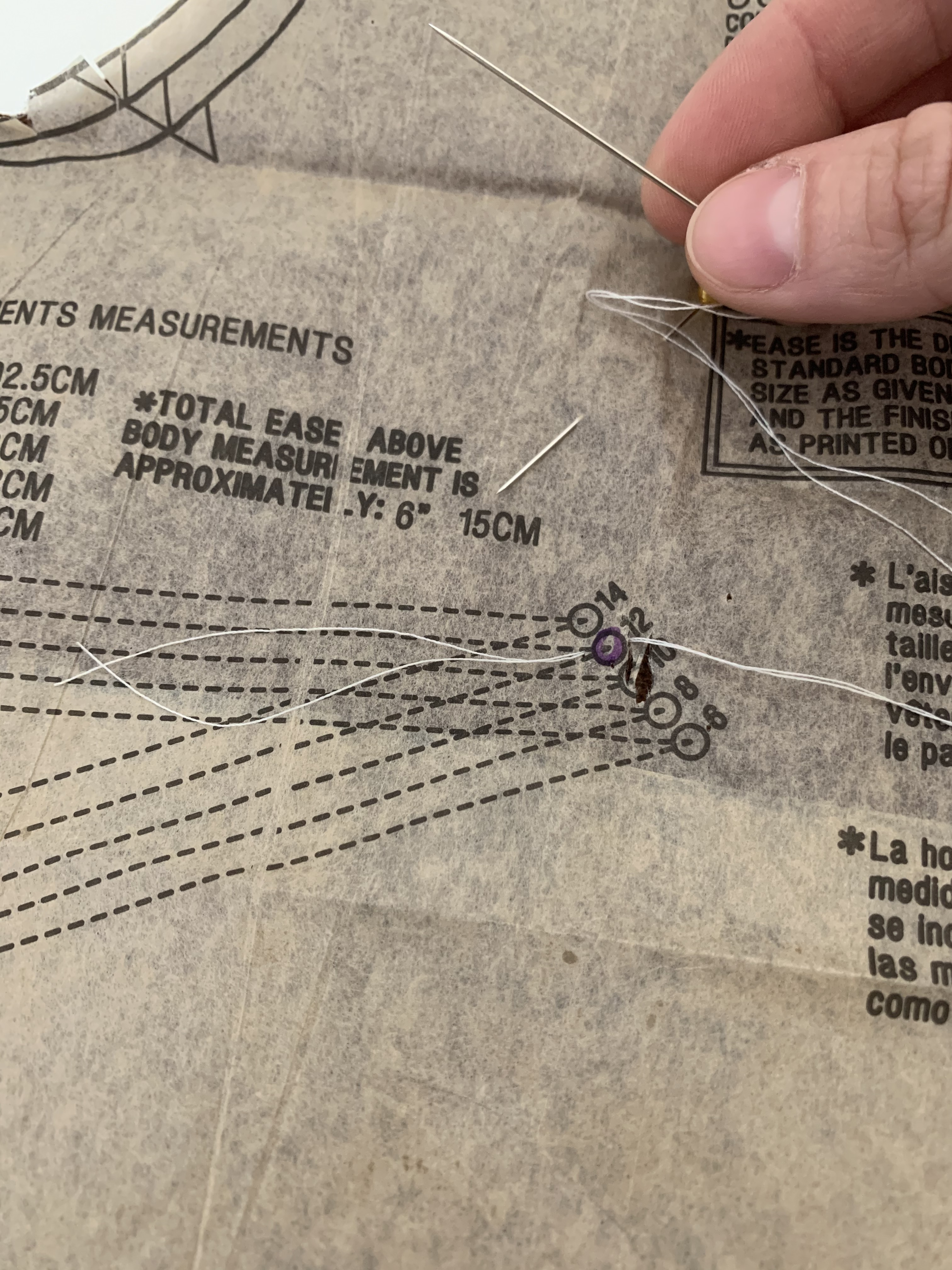 Leave your pinned paper pattern piece attached to the fabric while you are making your tailor’s tacks.