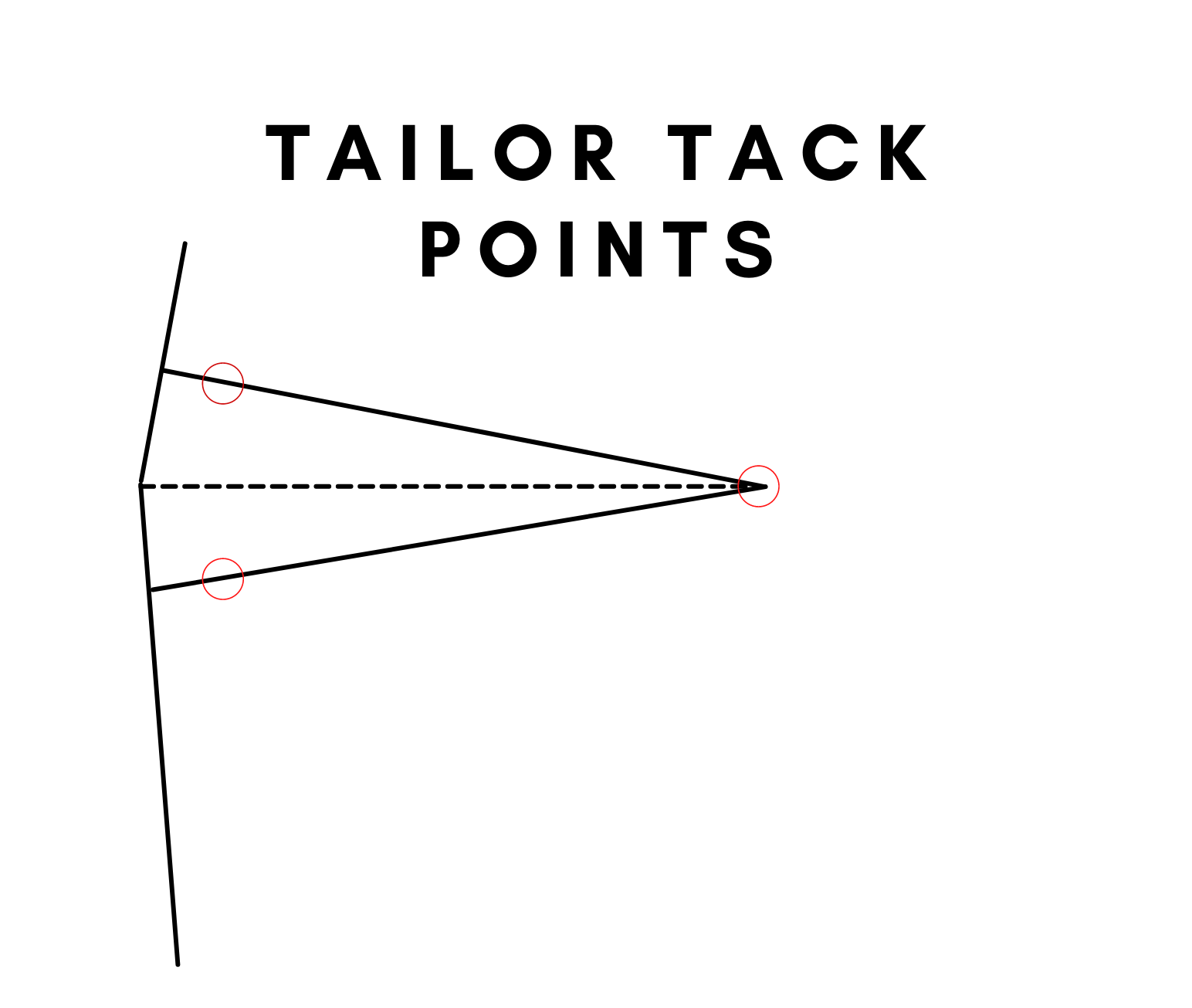 First, find your dart point and dart legs. Sometimes patterns will come with small circle/notch marks slightly above the bottom of the dart leg, and one right on the dart point. These are the spots you where you will want to make or sew a tailor’s tack. See the visual below: