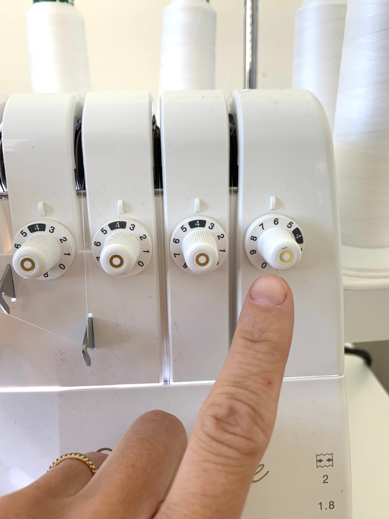 To set up your Baby Lock Celebrate serger for a three-thread rolled hem lettuce finish, remove your left needle and thread, and set your dials and tension as shown in the photos below: