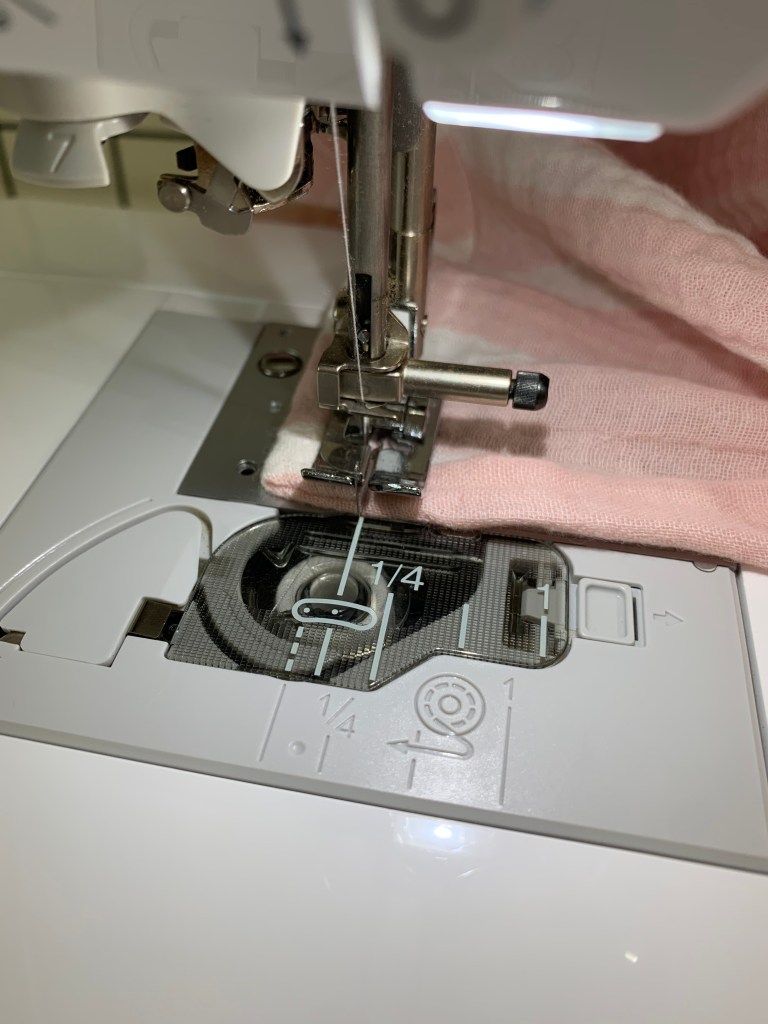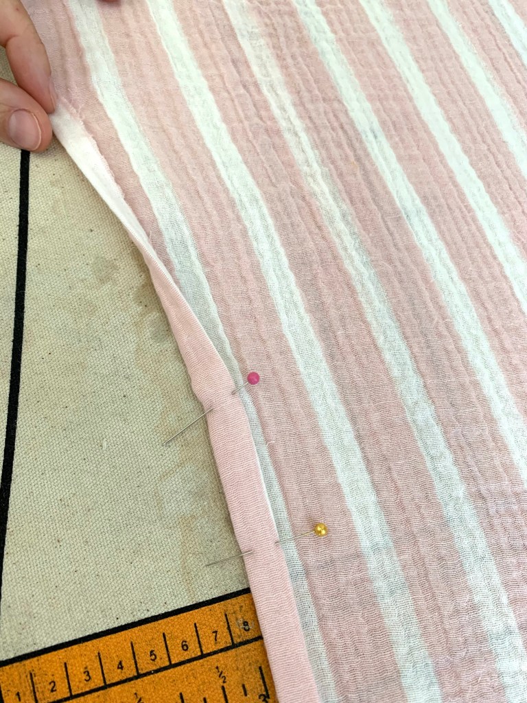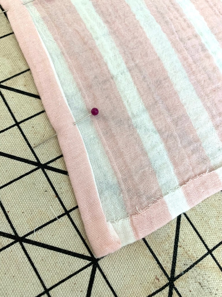 Next, prep the raw edges of the blanket by pressing the edges to the wrong side once at 1/4″. Gauze tends to stretch a little as it’s being worked with. You can straighten out the edge by trimming off any stretched corners.
