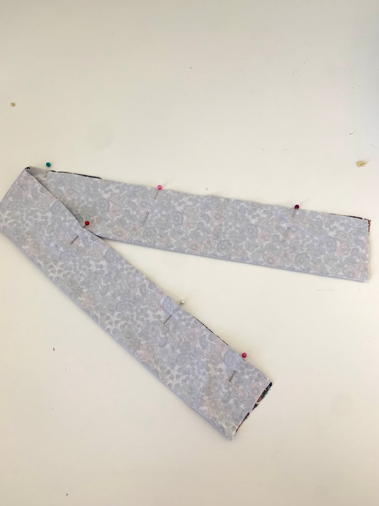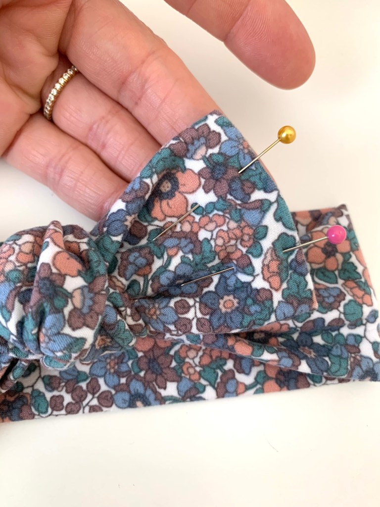 To finish the raw open edges of the bow, fold the ends inside the open end at about 1/2″ and pin in place. I ended up cutting off about 1/5″ off the edge to have a shorter bow, this is why I like to save this part for the end after I’ve tied the knot. Play around with the bow size and length here.