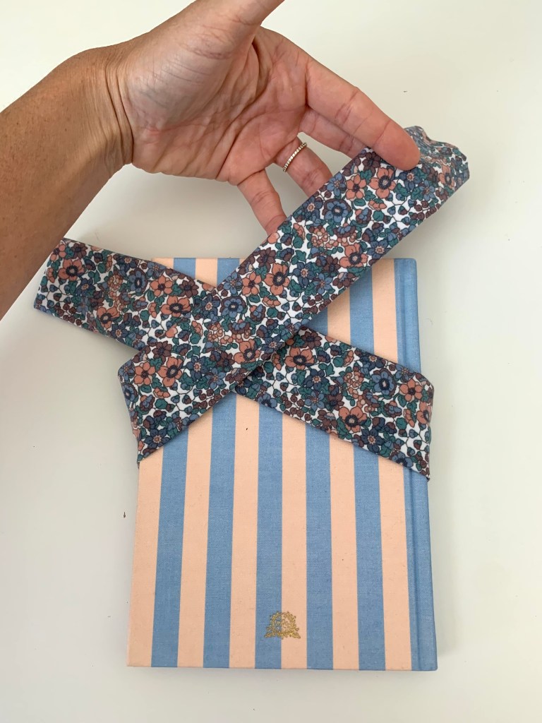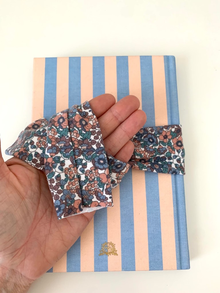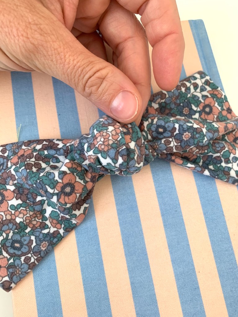 Now it’s time to make the knotted bow. Grab a book or something similar that is about 6″ wide to help you tie the bow. I used a journal I had lying around. Follow these images to help with tying. Also, make sure to keep the seam side from showing on the right side of the bow. It might take a few tries to get it just right.