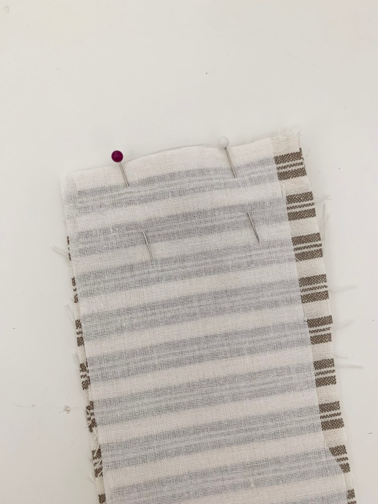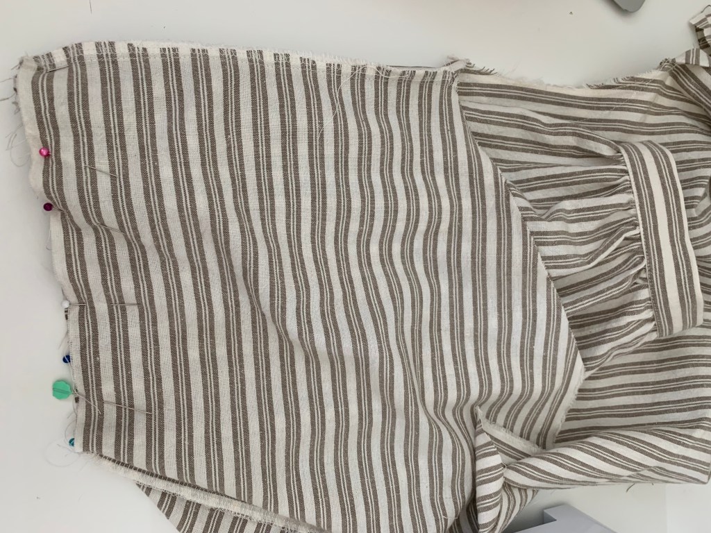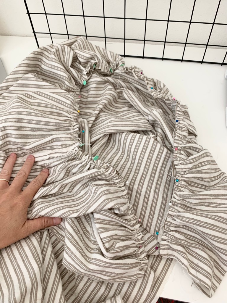 4. Sew in sleeves. I followed hack #2 laid out in the instructions for the gathered sleeve option. Pin the sleeve piece right sides together length wise. Sew at 1/2″ and finish.