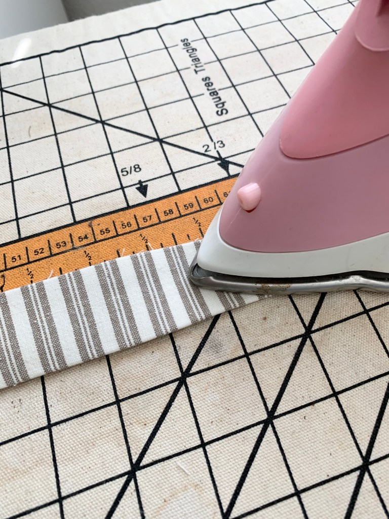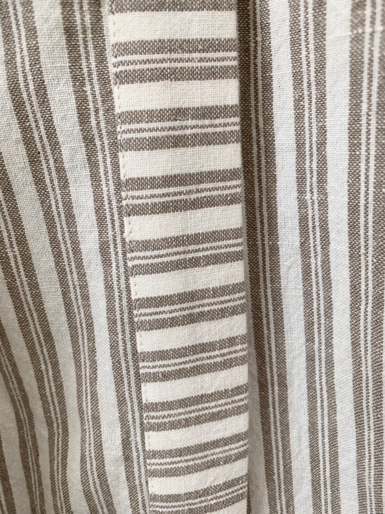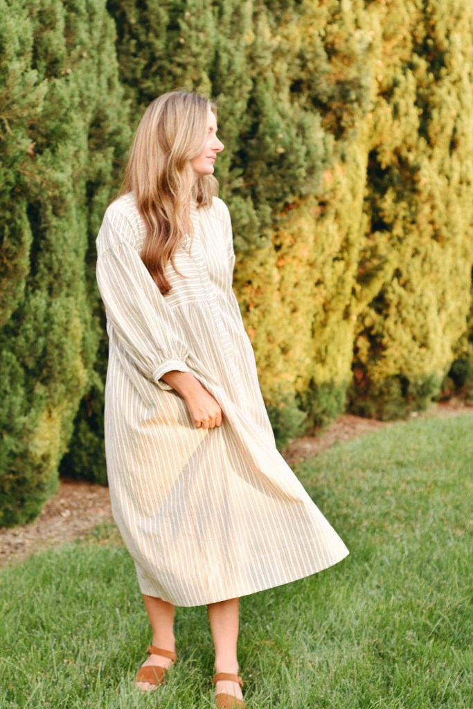 Now, when it came down to picking a fabric, I kept picturing this dress sewn in a dreamy neutral linen check or stripe. I couldn’t find quite find what I was looking for, and that was also affordable. When I was about to give up, I remembered Hobby Lobby sells fabric and thought I would pop in to see if they happened to have what I was looking for. YOU GUYS!! Hobby Lobby! Who knew!? They had exactly what I had been searching for and guess what…. it cost me $19 for 4 yards of fabric. I chose this really beautiful linen/cotton blend neutral stripe fabric, and I am soooo happy with the finished result.