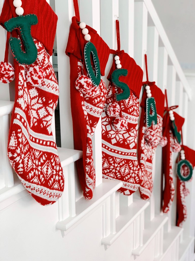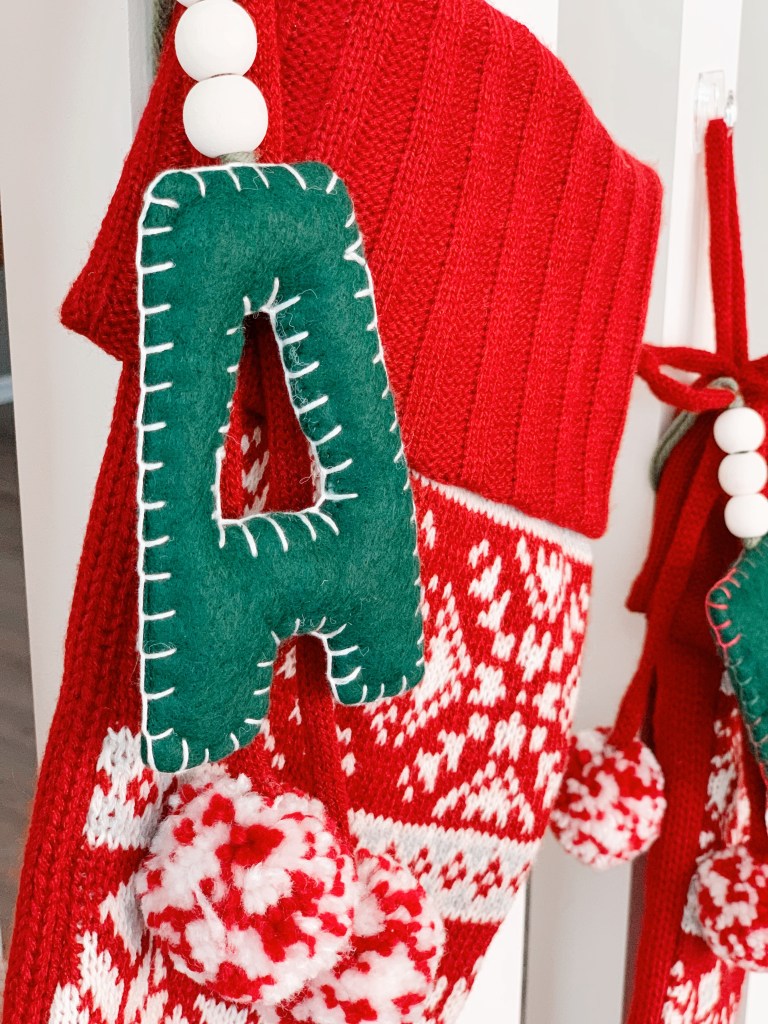 Hi everyone! It’s time for Christmas crafting and I have a fun tutorial for you today! I’ve been needing a way to differentiate and label our family’s stockings and I came up with a super easy and cute way to do it. I created simple felt letters to tie onto each stocking starting with each person’s first letter of their name. They look really cute and they are super easy to customize to match with your Christmas scheme.