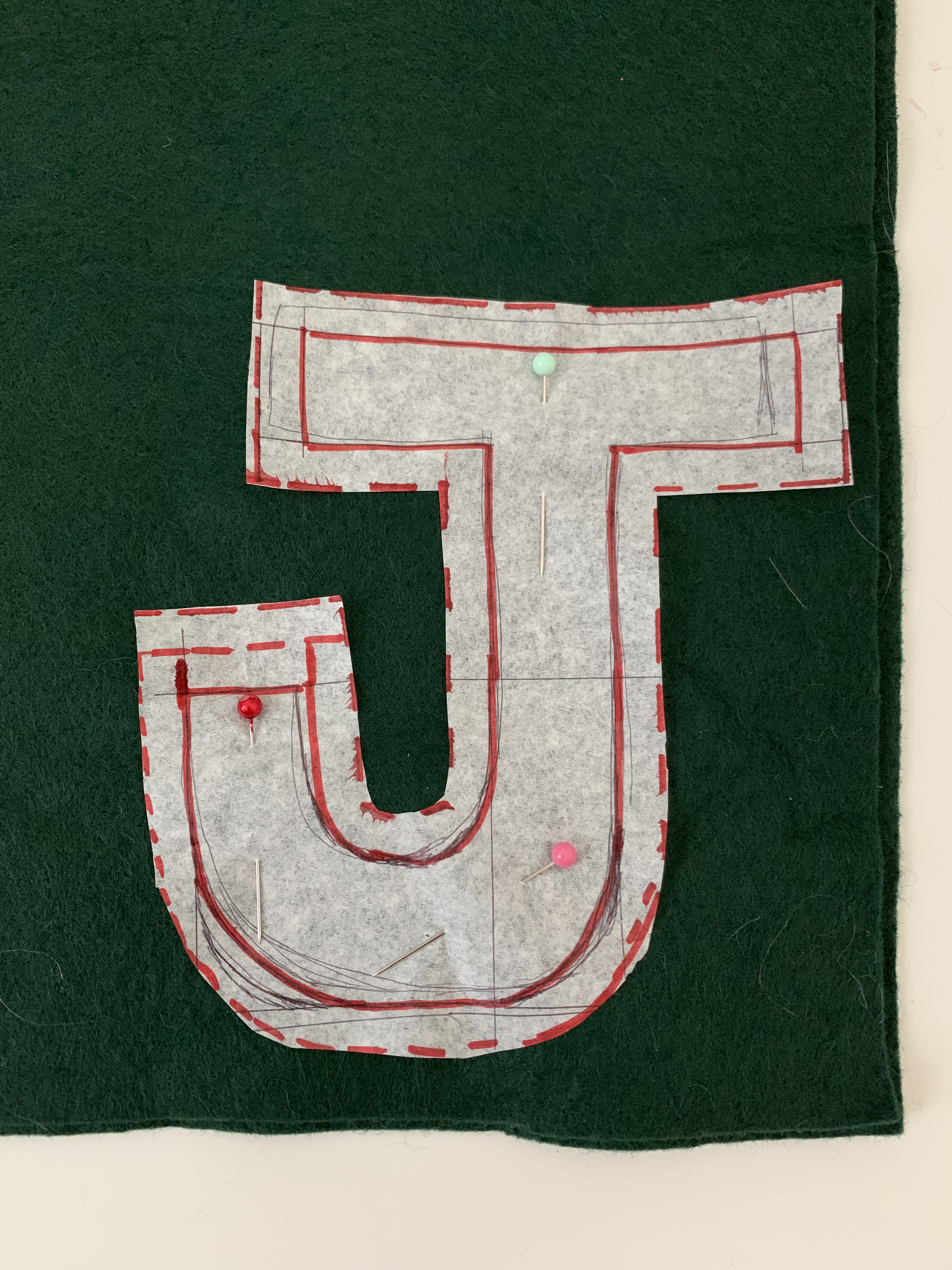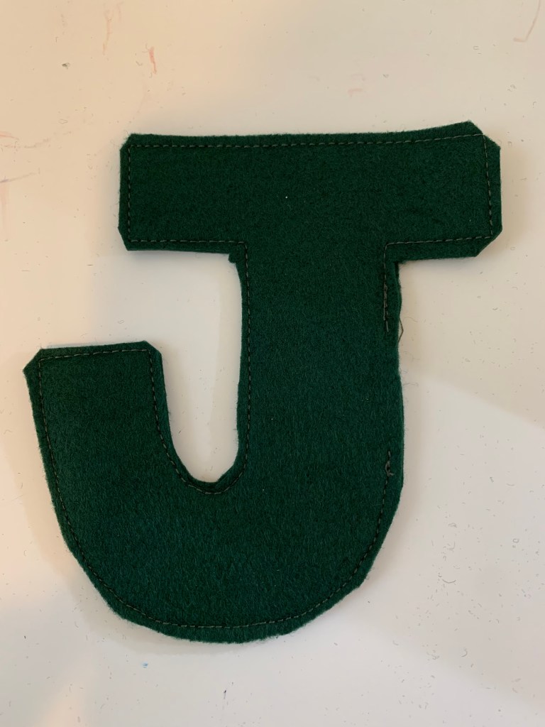 I made 6 different letters for my tags. I started by drawing out my letter (A ruler is very handy here), adding a 1/4″ seam allowance, and testing it out. I then based all of my other letters off of the first letter to keep the size consistent. The following steps are for letters that do not have a cut out in the middle of them (ex: S, J, T). For letters with a cut out (ex: A, O, B) skip down to step six. After your patterns are created, cut two out of the felt.