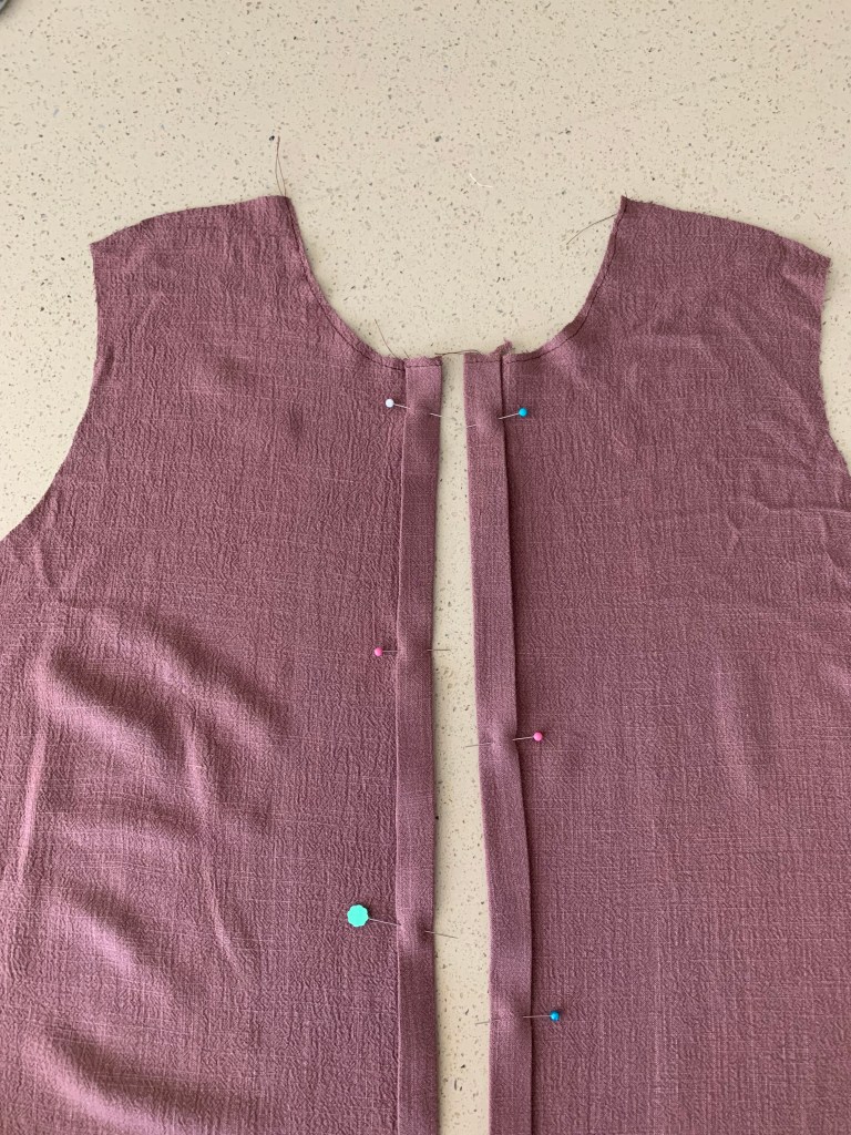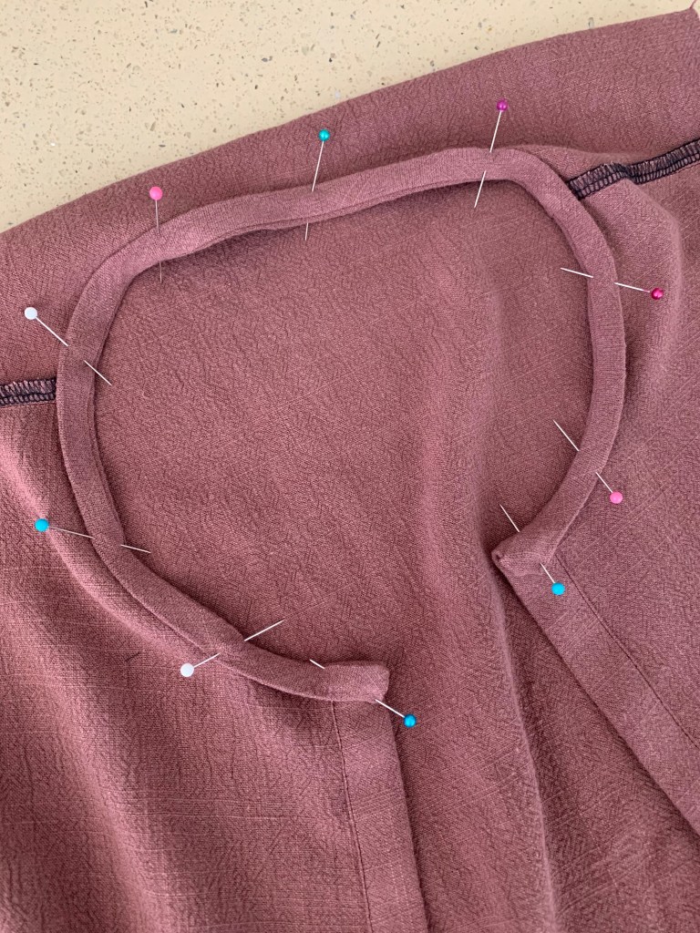 Step 5: Right sides together, and leaving 1/2″ extended past neckline edge, pin the bias binding all around the neckline. Tuck the 1/2 end edges behind the front neckline. Sew at 3/8ths.