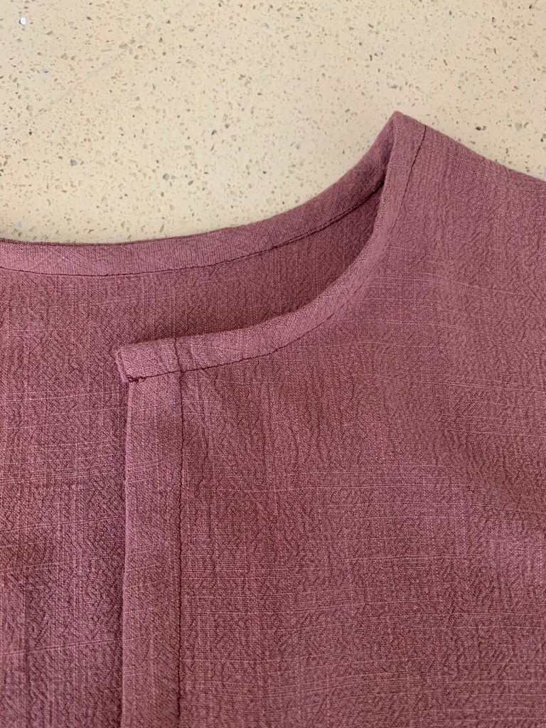 I sewed up a size 2, no changes, and used a really nice fabric I found at Joann. It’s a mauve brown slub linen rayon fabric in the color “rootbeer”– a nice dark neutral. This fabric has really great texture and drape, too. This pattern was pretty straight forward to sew! Next time I might size down, shorten the sleeves and sleeve band too. I found the band opening to be a little too wide for me, and sleeves a little long.
