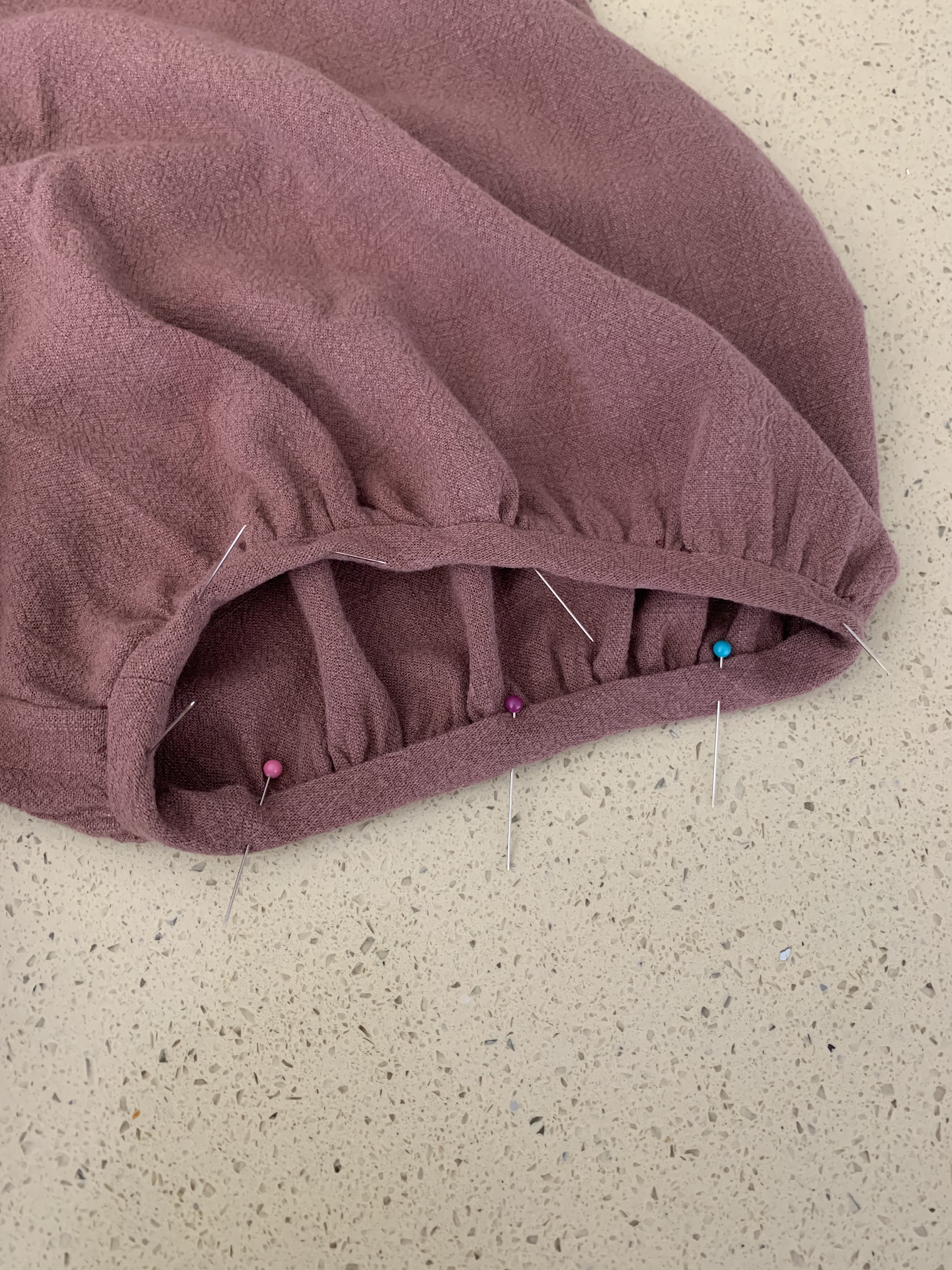 Step 9: Pin the sleeve binding to the bottom of the sleeve right sides together. I like to break it into 4ths and pin in place. Gently pull basting threads until bottom of sleeve fits into the sleeve binding. Distribute gathers evenly, pin and sew at 3/8″. Remove basting stitches that show on the right side. Fold and press the binding over twice to the inside of the sleeve and pin in place. Sew along the edge to secure. Remove basting threads that show on the right side, and give it a really good press.