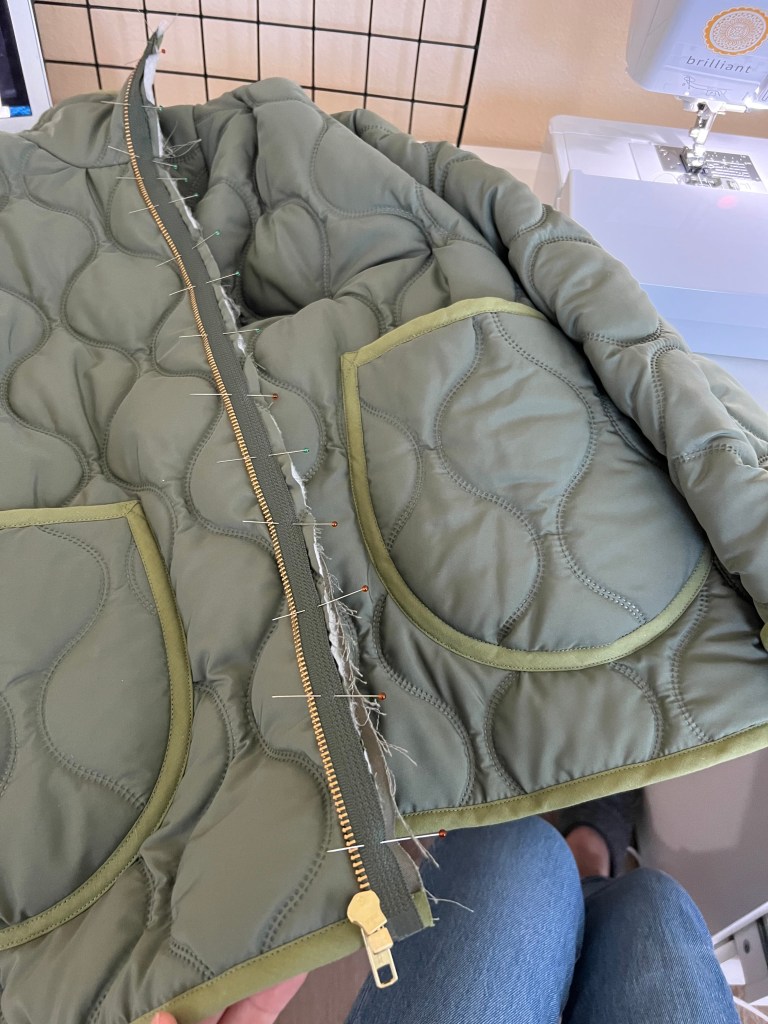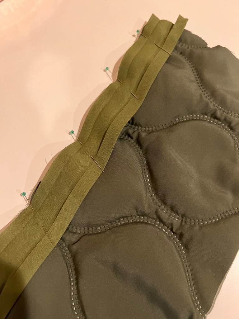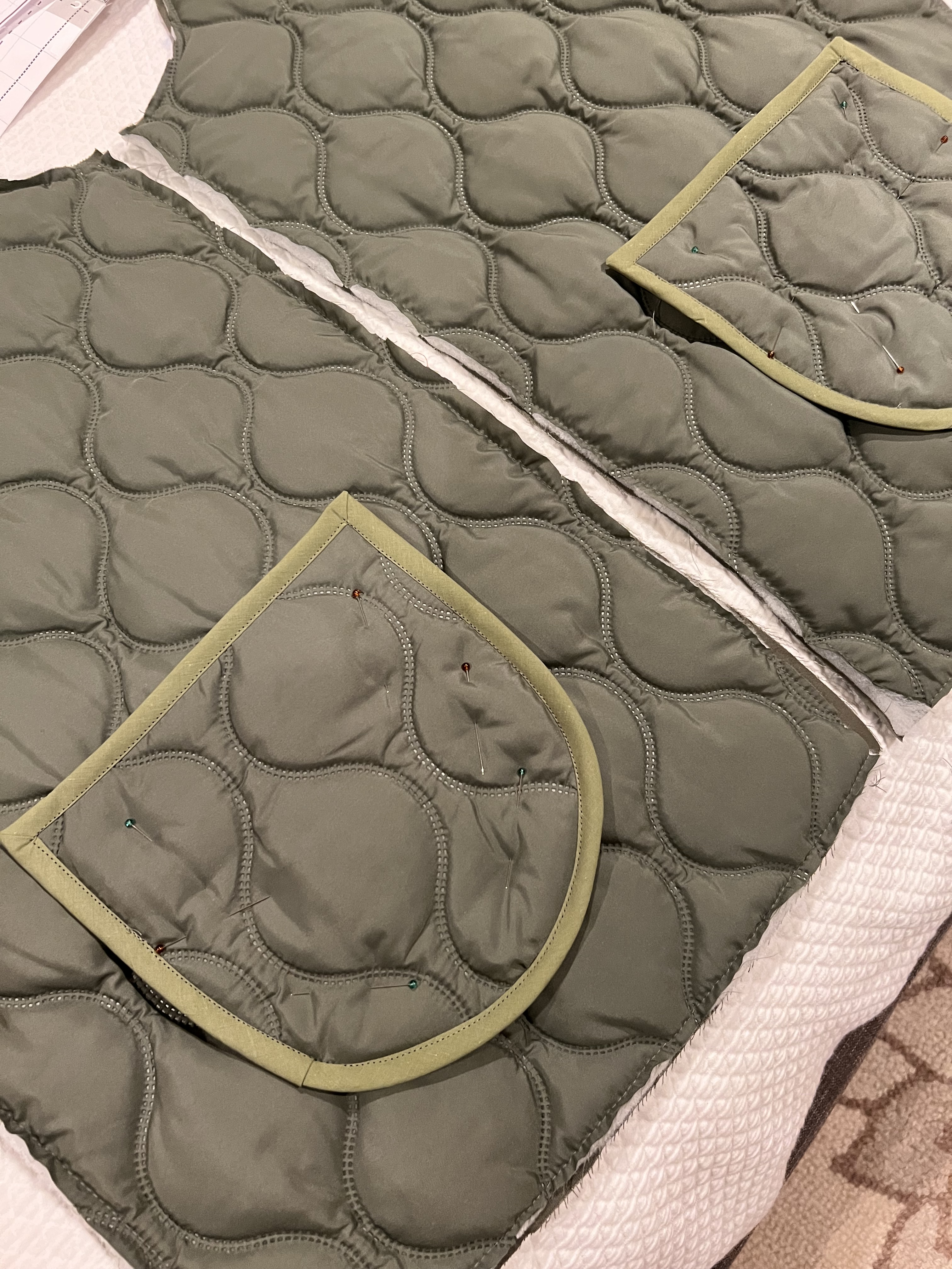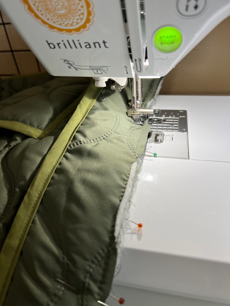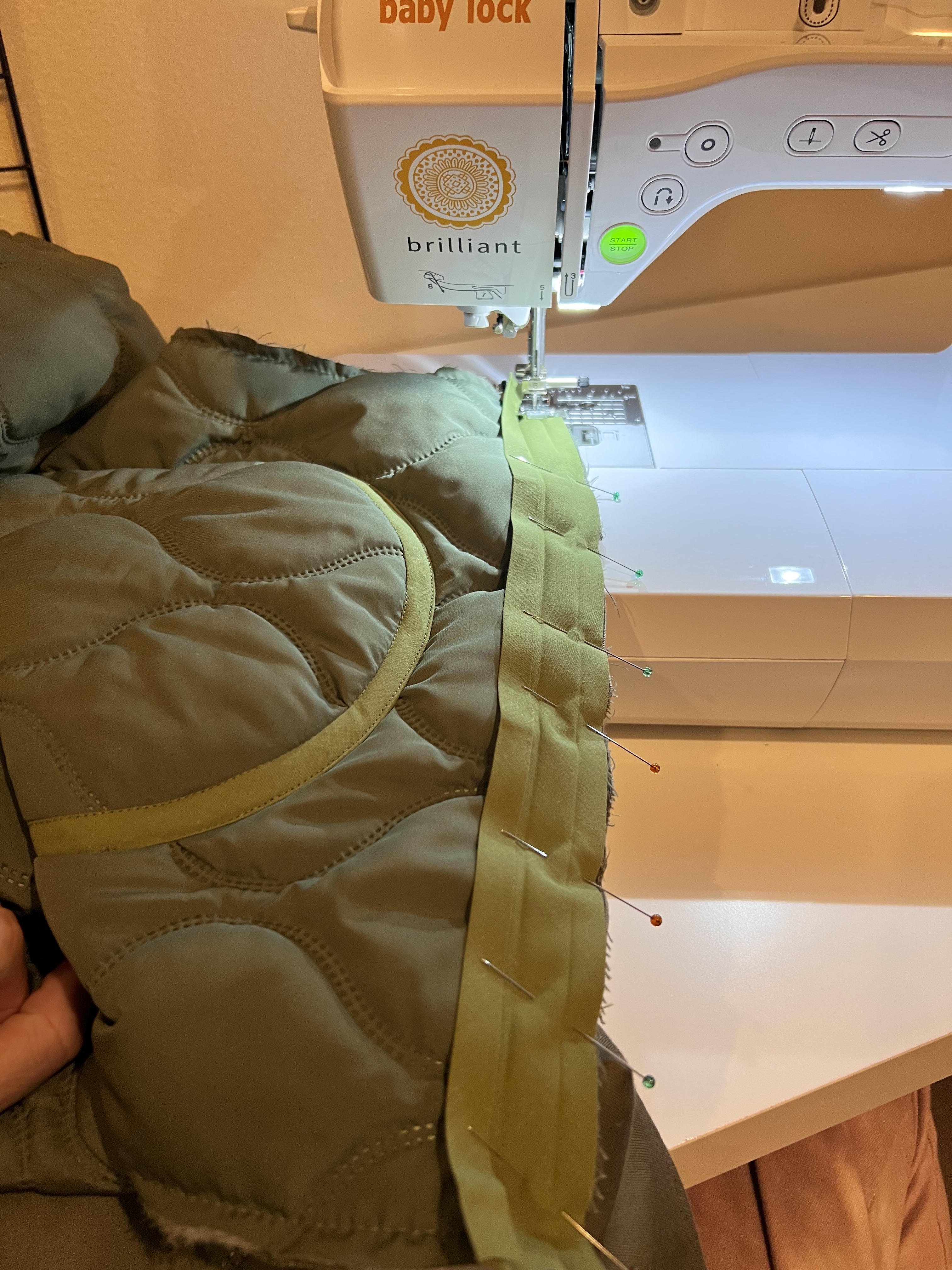 For supplies, I used 2 yards of the puffer fabric, 2 yards of stretch twill for my lining, 15 yards of pre-made extra wide double fold bias tape by Wright’s PC206 Leaf , a zipper I ordered off amazon, and matching thread! I will note that I did not pattern match the quilted puffer jacket with my pattern pieces, you will need more than 2 yards of fabric if you decide to pattern match. I sewed between a XS and S size wise, and I ended up taking in the underarm another 3/4″ or so for a better fit. I extended the sleeves 1-2″ so I could roll the cuff and have the sleeve hit at my wrist. I also added patch pockets instead of using the welt pocket. I followed the pattern directions and was very impressed! It was very easy to follow along, and overall I really enjoyed the whole process of making this jacket.