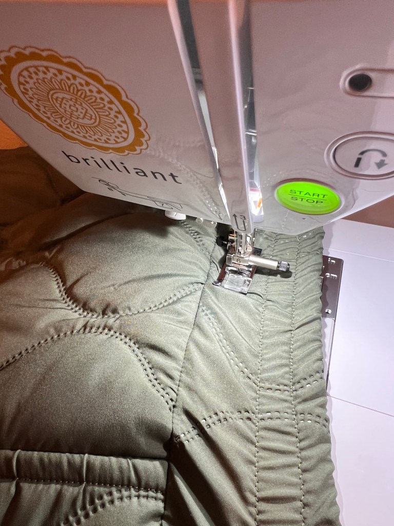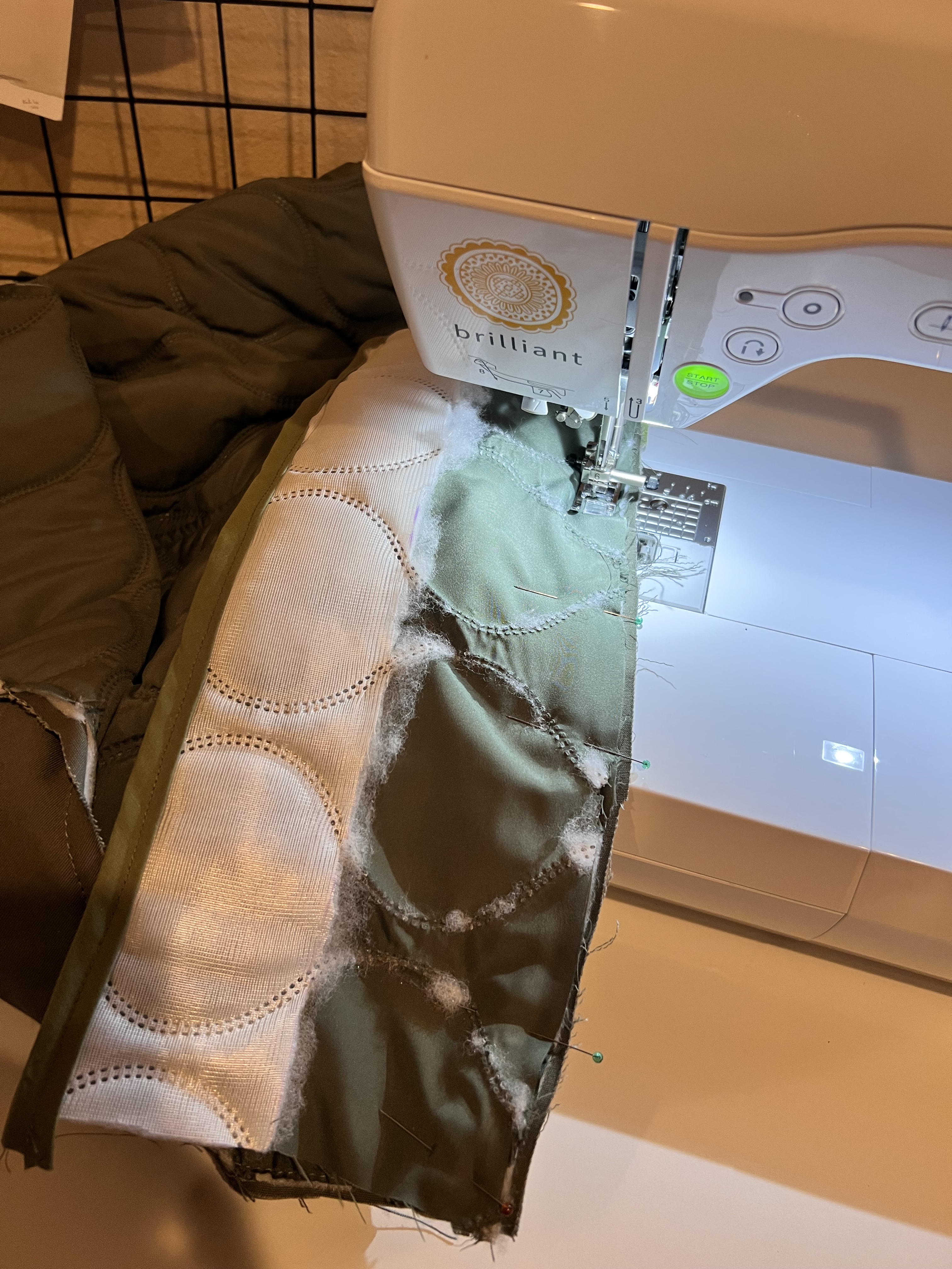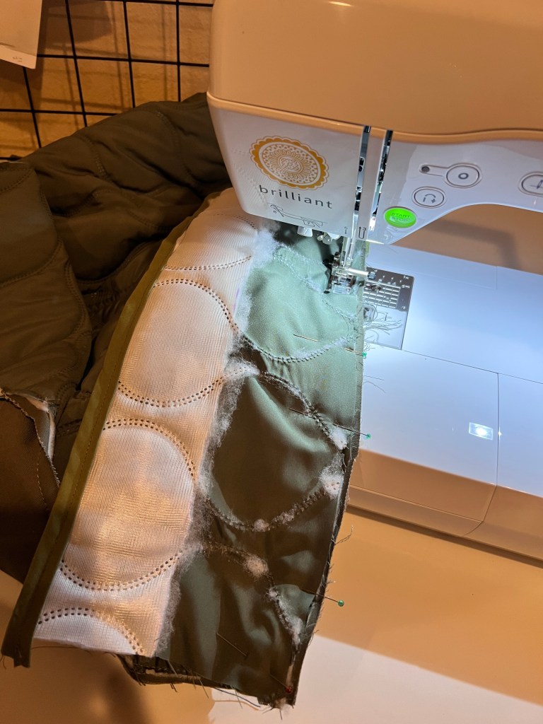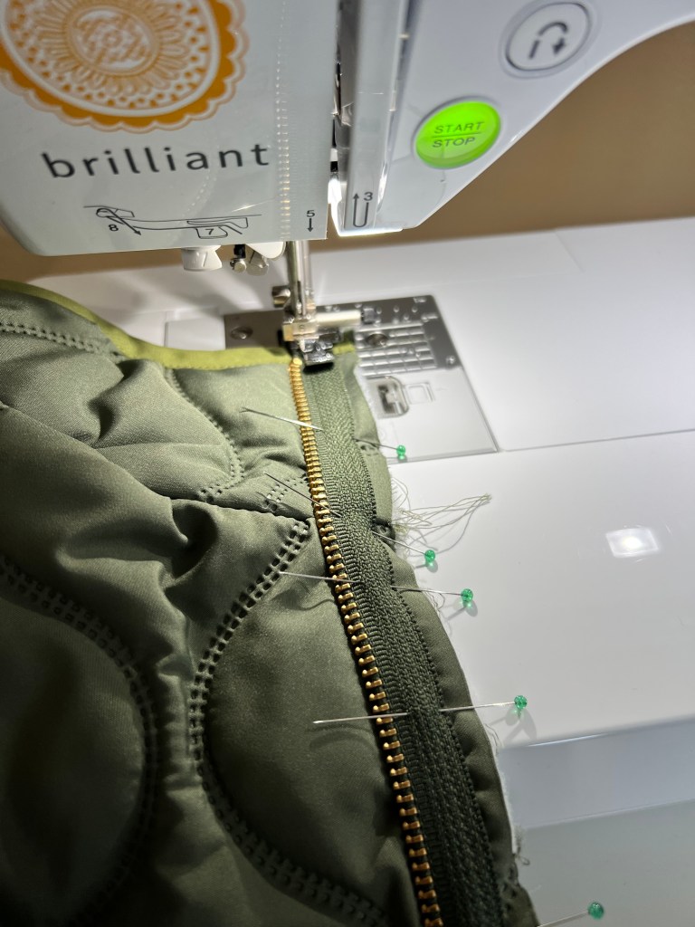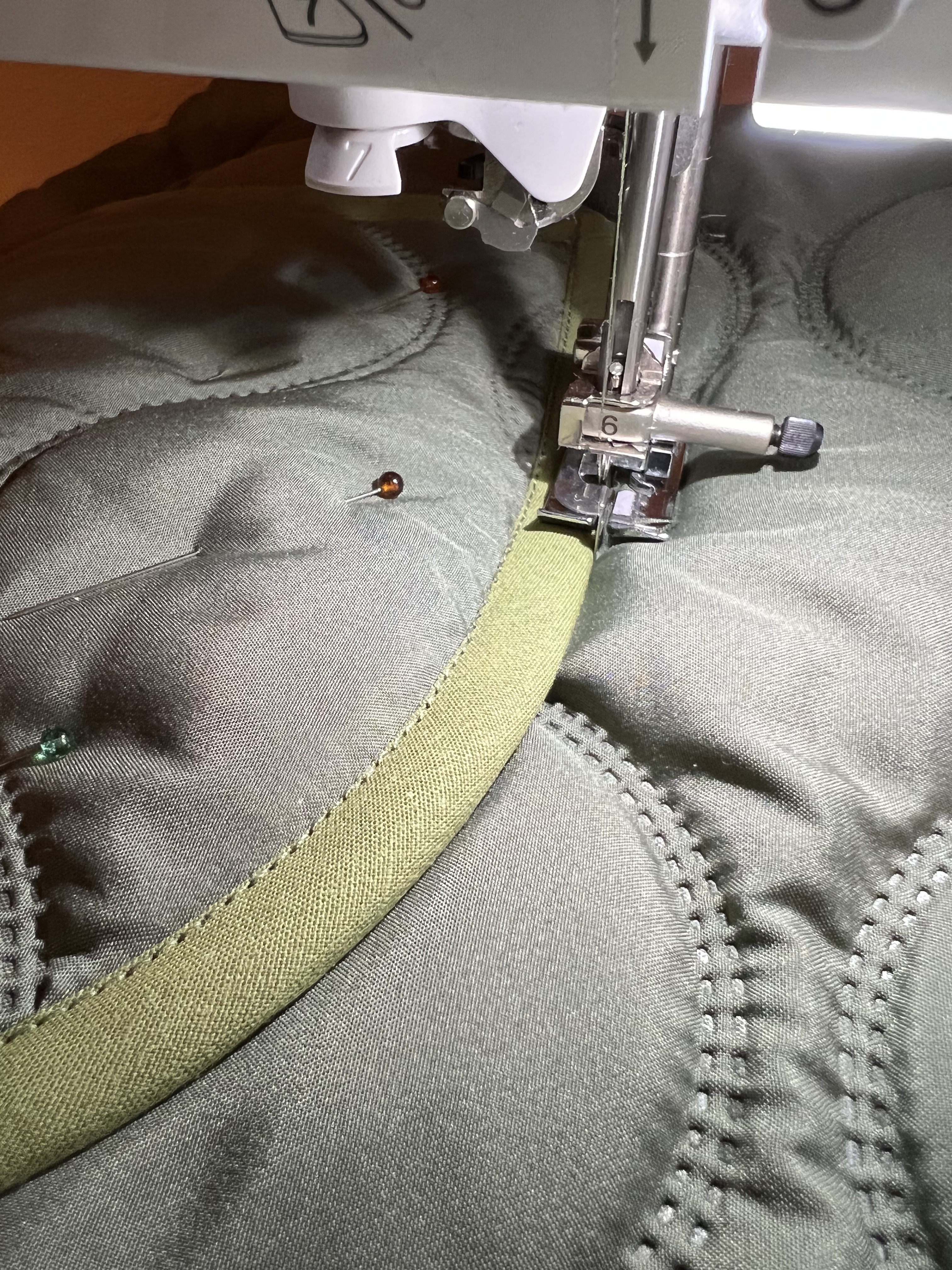 For supplies, I used 2 yards of the puffer fabric, 2 yards of stretch twill for my lining, 15 yards of pre-made extra wide double fold bias tape by Wright’s PC206 Leaf , a zipper I ordered off amazon, and matching thread! I will note that I did not pattern match the quilted puffer jacket with my pattern pieces, you will need more than 2 yards of fabric if you decide to pattern match. I sewed between a XS and S size wise, and I ended up taking in the underarm another 3/4″ or so for a better fit. I extended the sleeves 1-2″ so I could roll the cuff and have the sleeve hit at my wrist. I also added patch pockets instead of using the welt pocket. I followed the pattern directions and was very impressed! It was very easy to follow along, and overall I really enjoyed the whole process of making this jacket.