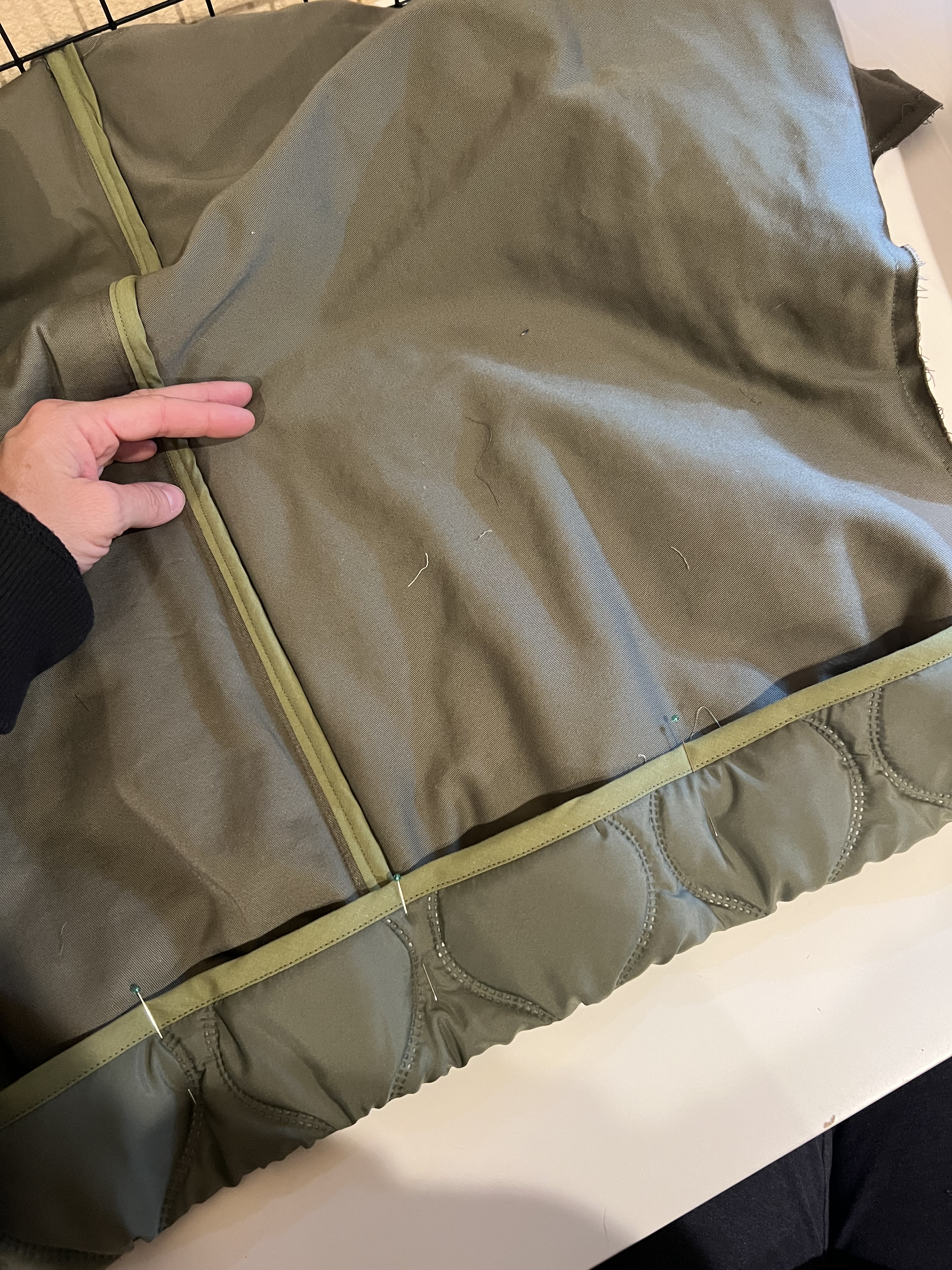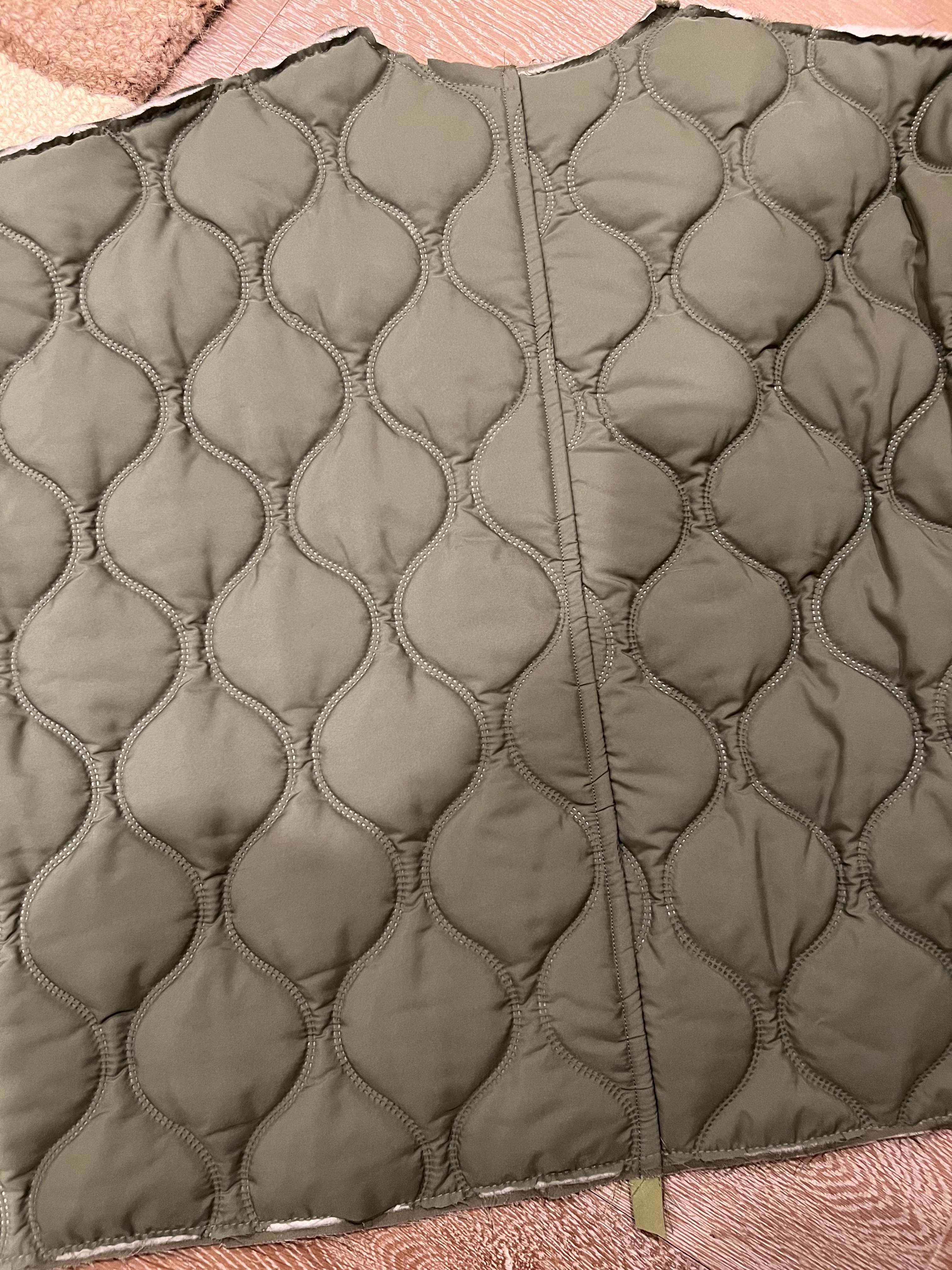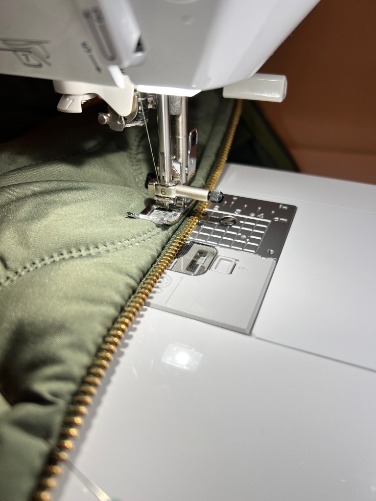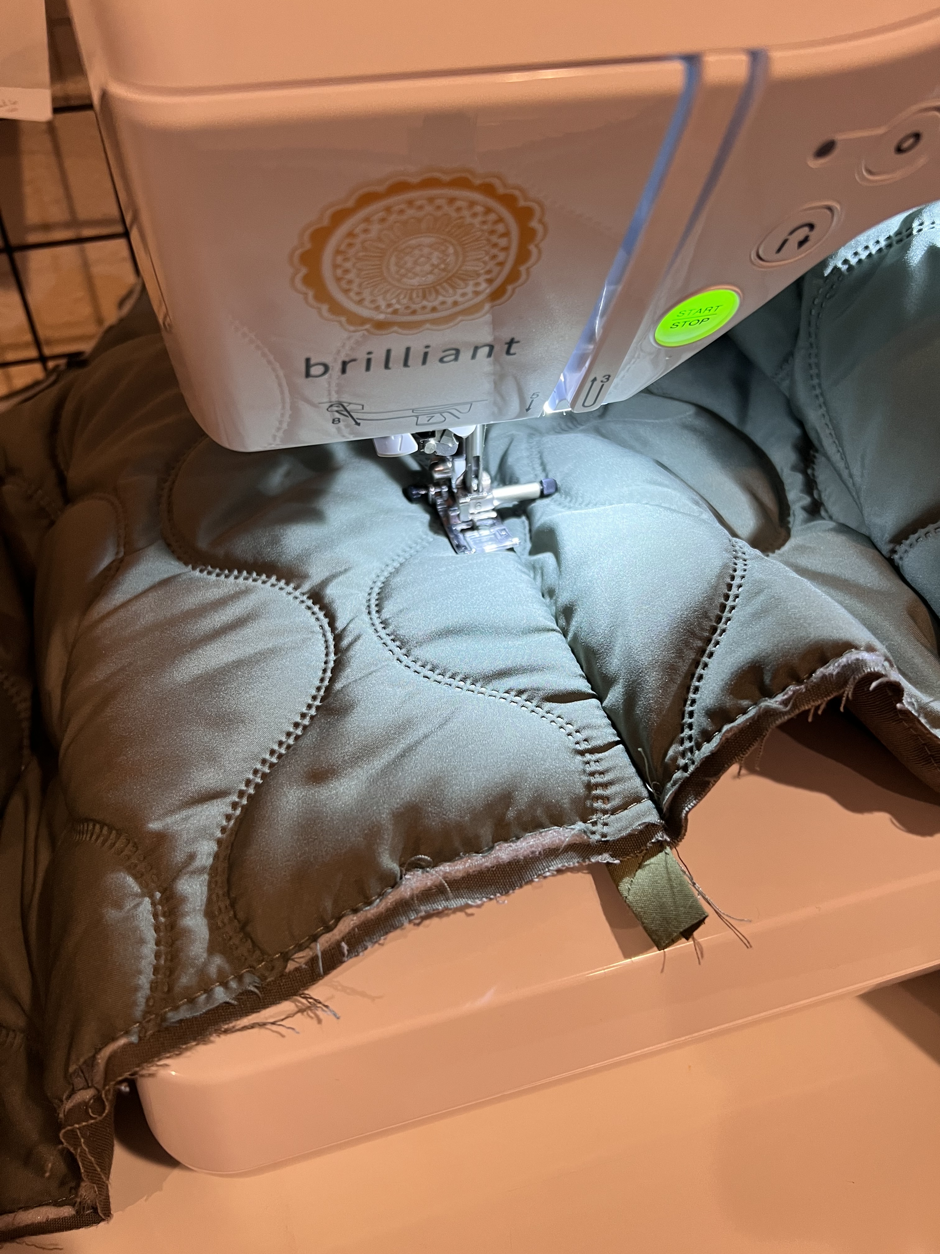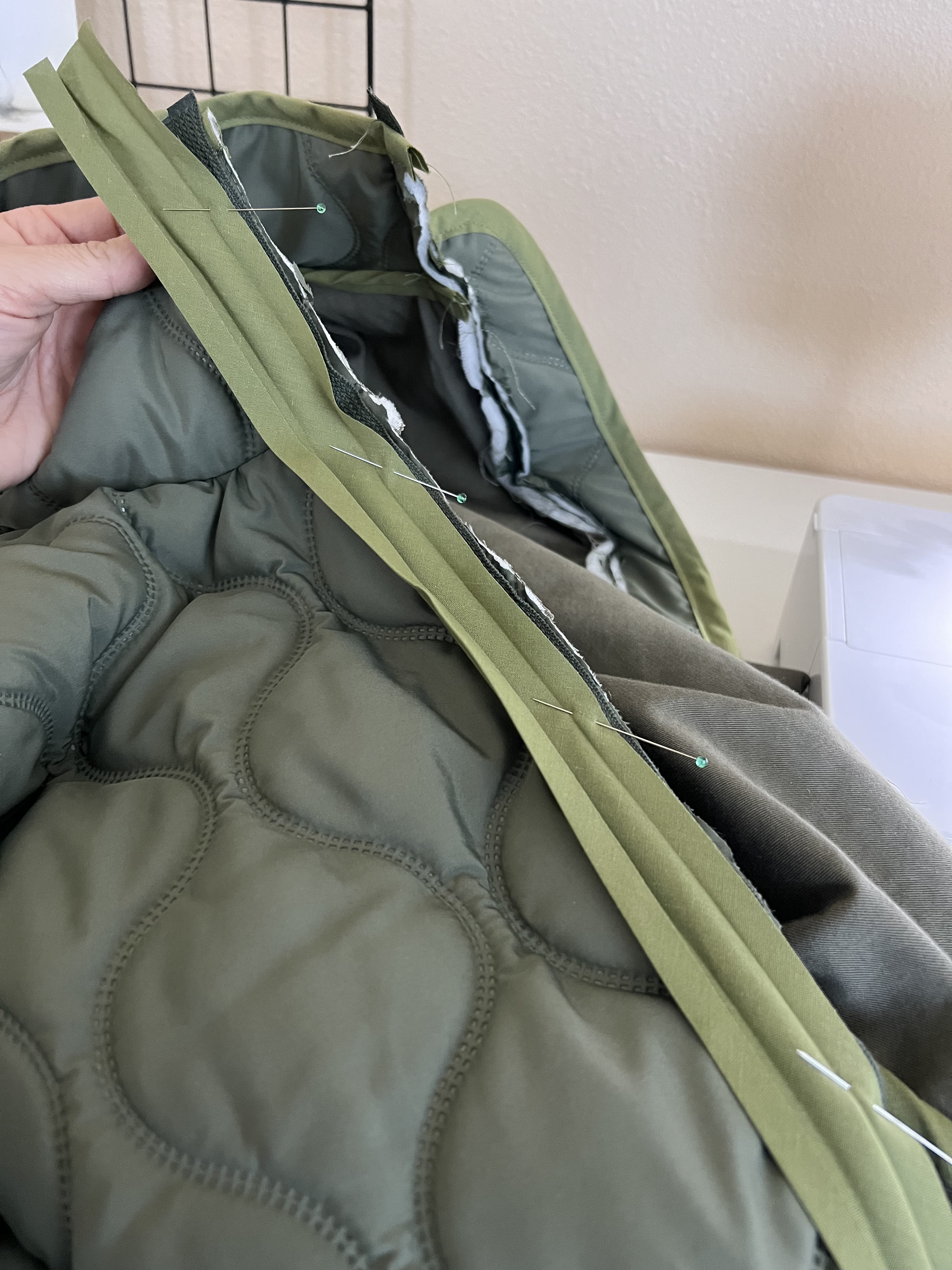 For supplies, I used 2 yards of the puffer fabric, 2 yards of stretch twill for my lining, 15 yards of pre-made extra wide double fold bias tape by Wright’s PC206 Leaf , a zipper I ordered off amazon, and matching thread! I will note that I did not pattern match the quilted puffer jacket with my pattern pieces, you will need more than 2 yards of fabric if you decide to pattern match. I sewed between a XS and S size wise, and I ended up taking in the underarm another 3/4″ or so for a better fit. I extended the sleeves 1-2″ so I could roll the cuff and have the sleeve hit at my wrist. I also added patch pockets instead of using the welt pocket. I followed the pattern directions and was very impressed! It was very easy to follow along, and overall I really enjoyed the whole process of making this jacket.
