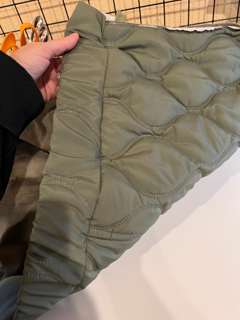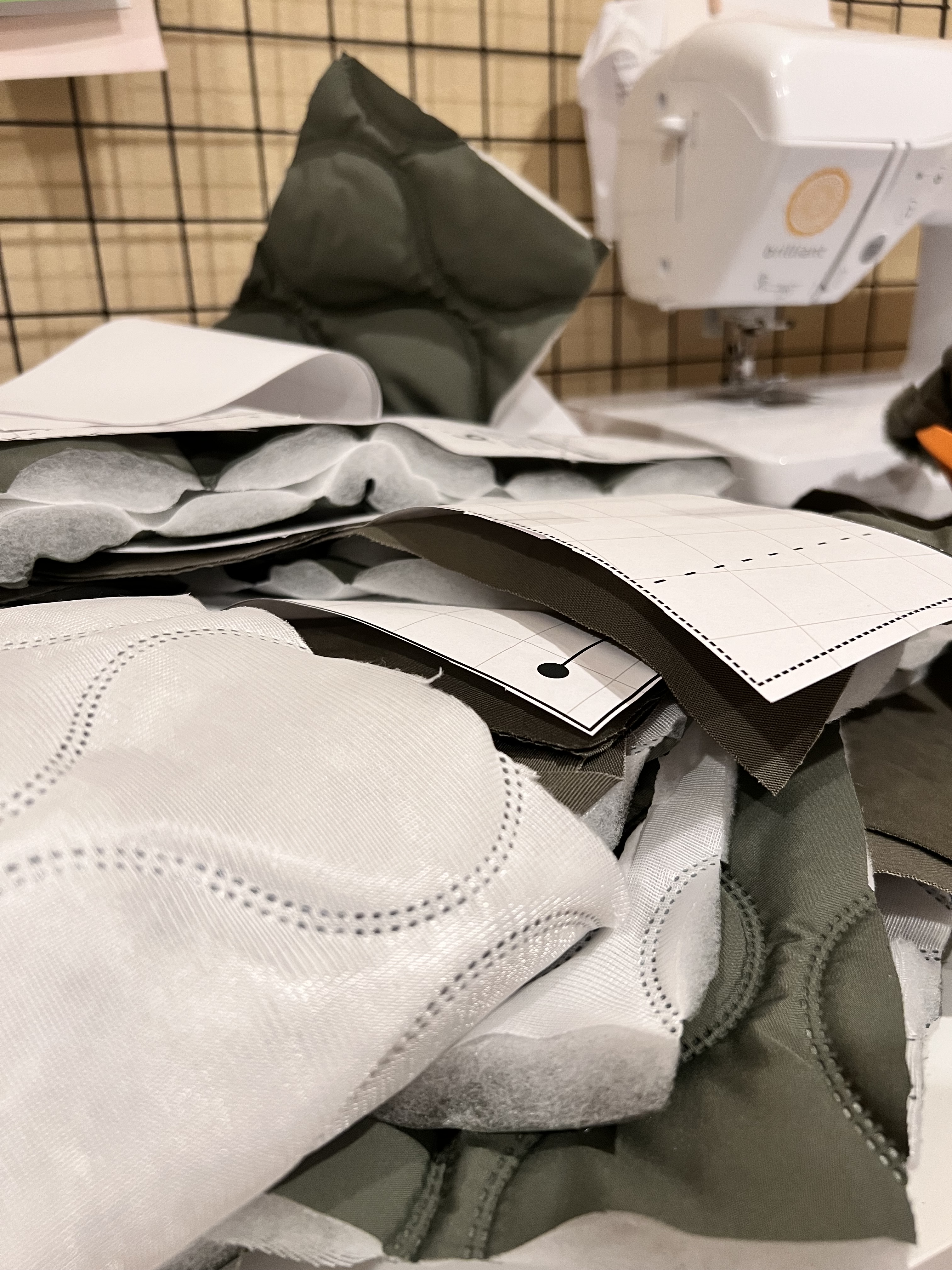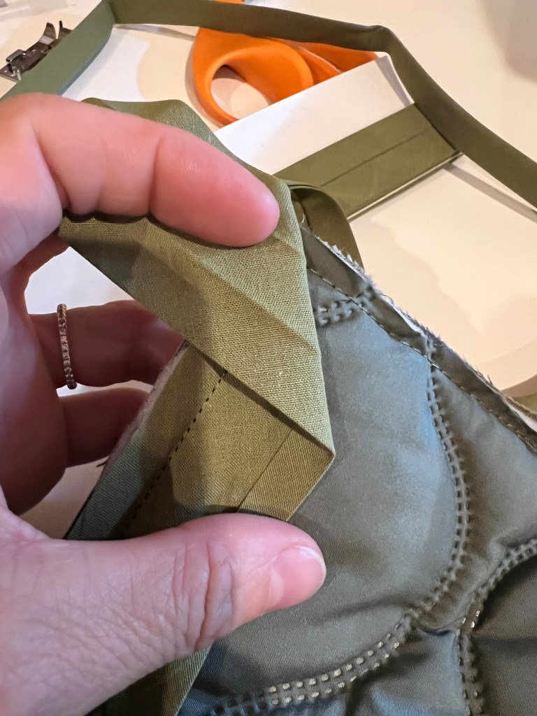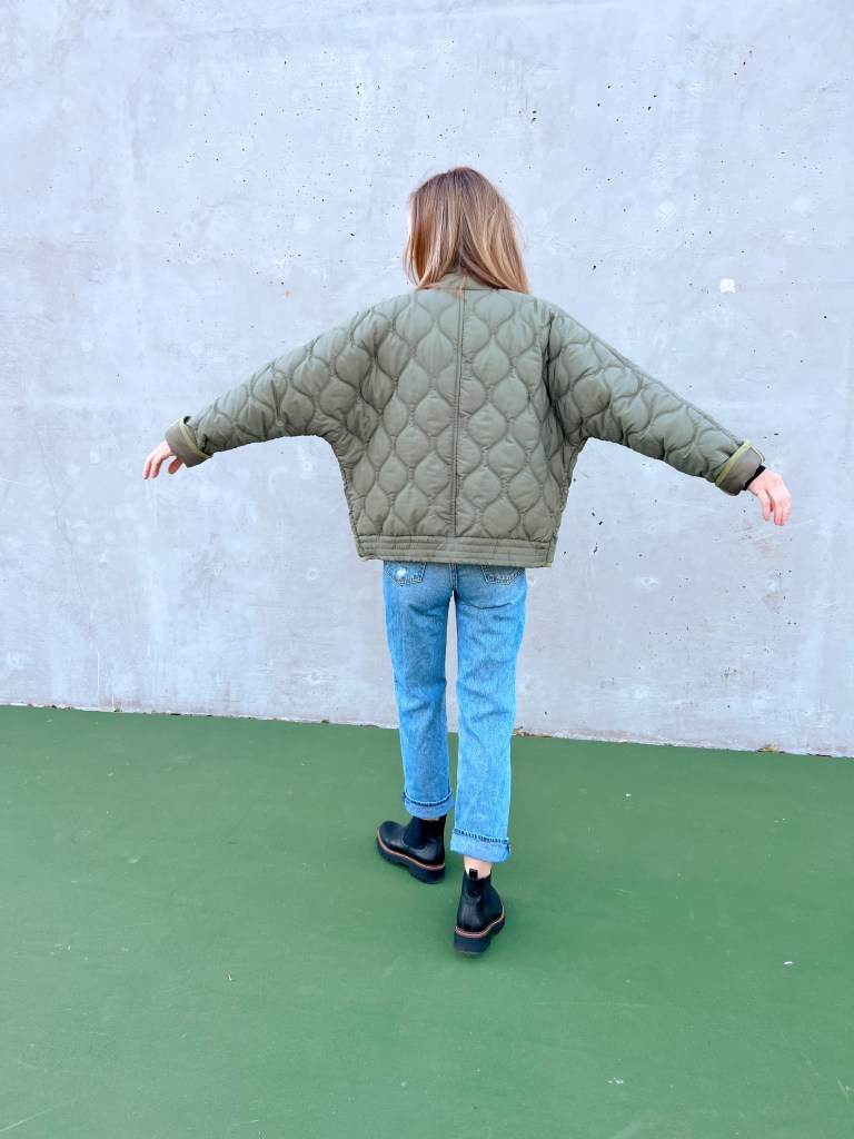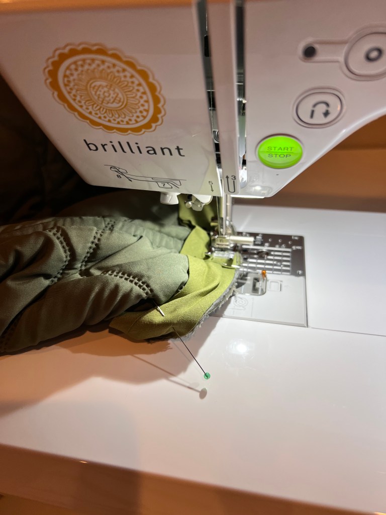 For supplies, I used 2 yards of the puffer fabric, 2 yards of stretch twill for my lining, 15 yards of pre-made extra wide double fold bias tape by Wright’s PC206 Leaf , a zipper I ordered off amazon, and matching thread! I will note that I did not pattern match the quilted puffer jacket with my pattern pieces, you will need more than 2 yards of fabric if you decide to pattern match. I sewed between a XS and S size wise, and I ended up taking in the underarm another 3/4″ or so for a better fit. I extended the sleeves 1-2″ so I could roll the cuff and have the sleeve hit at my wrist. I also added patch pockets instead of using the welt pocket. I followed the pattern directions and was very impressed! It was very easy to follow along, and overall I really enjoyed the whole process of making this jacket.
