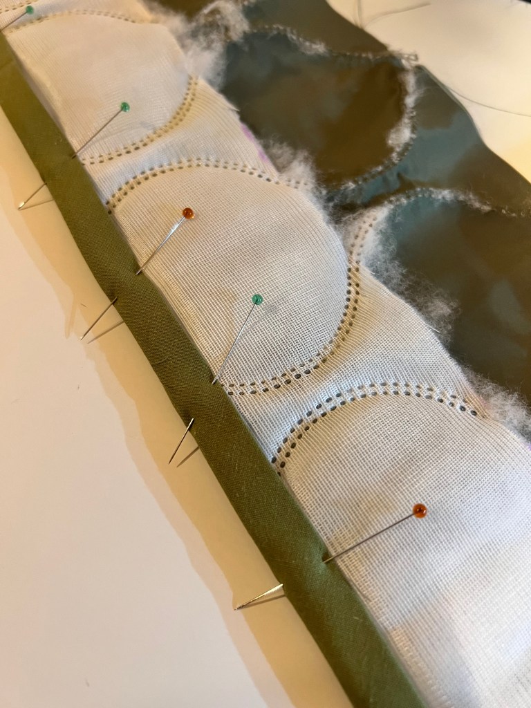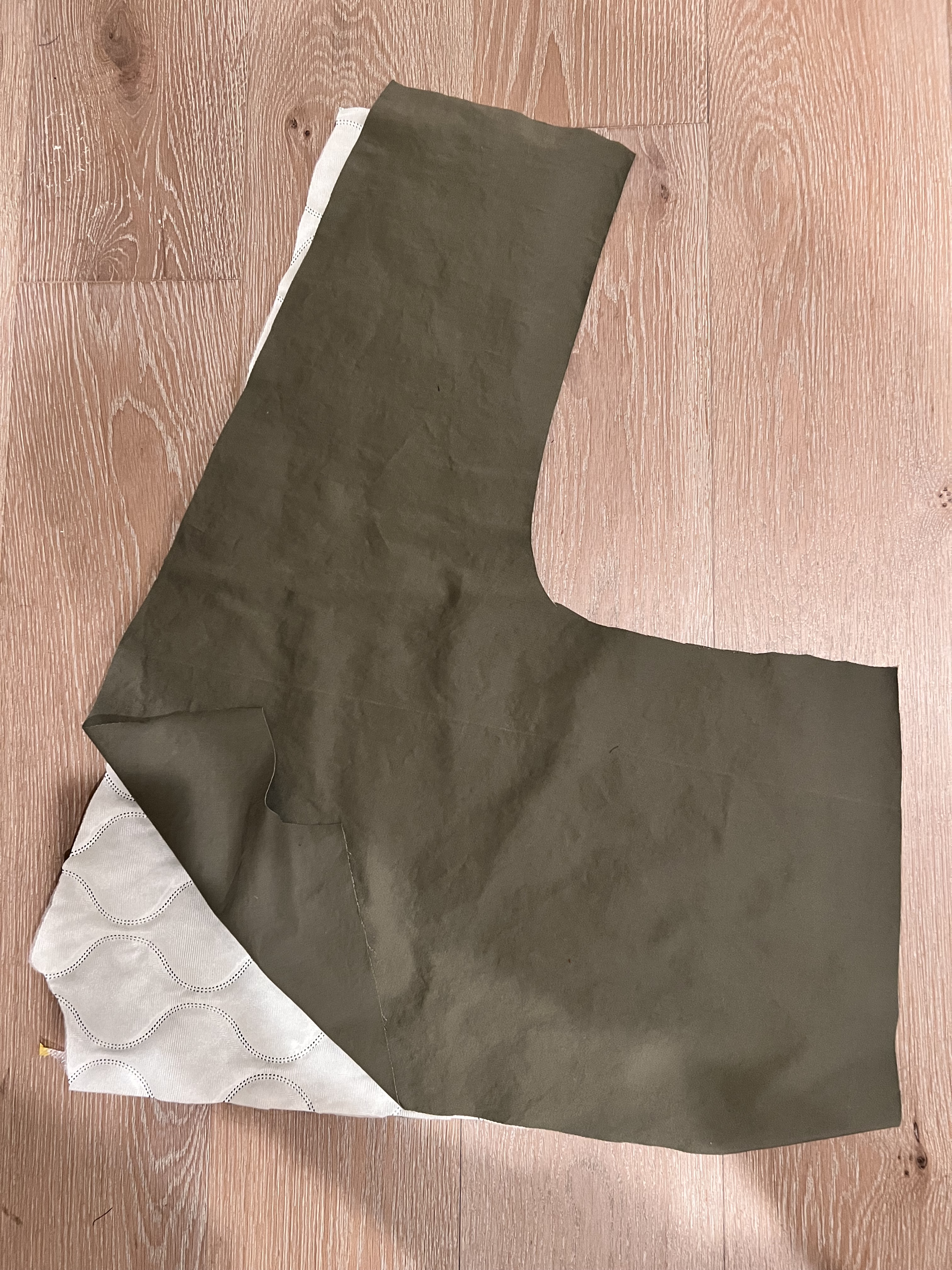 Step 2: Attach the lining pieces. I basted the pieces wrong side together all around the edges at 1/4″.
