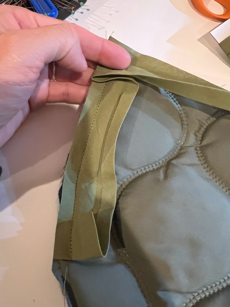 Next, flip the bias tape towards the back side of the pocket, and pin in place. Edge-stitch along the front pocket bias tape edge to finish.