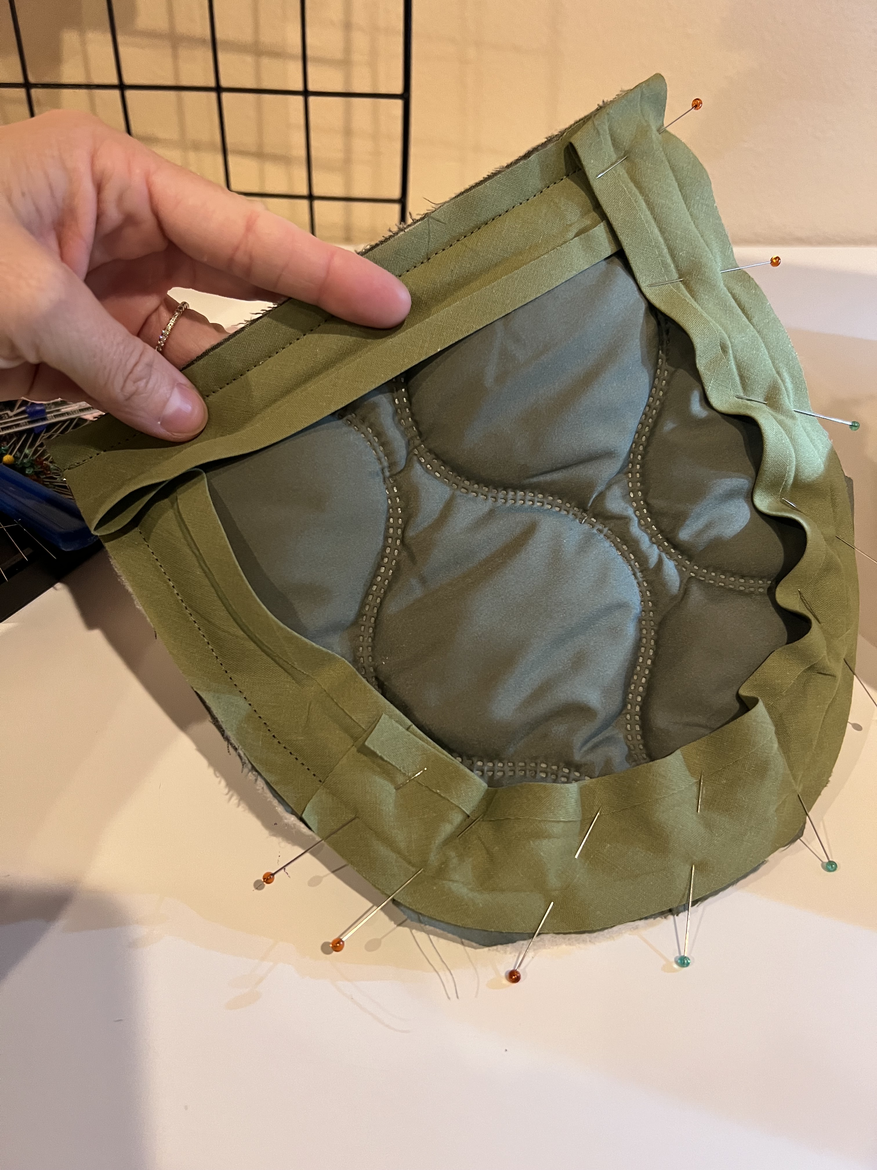 Step 14: Attach the collar. I removed the batting from one collar piece and basted the two pieces together. Finish the shorter end of the collar (the side that curves in) with bias tape.