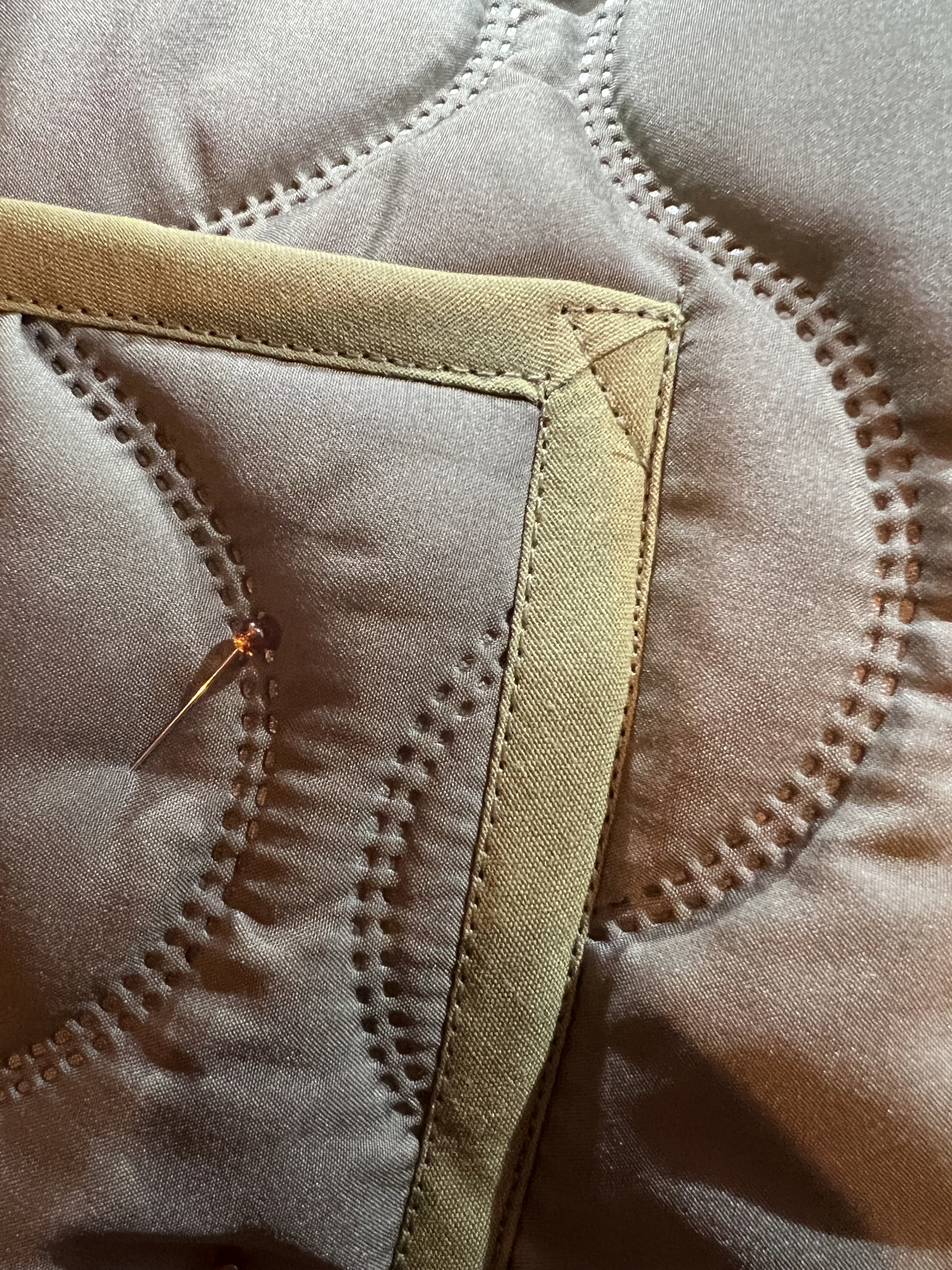 Fold the tape back at 90 degrees as shown in the third photo below. Fold tape over again lining it up with the pocket edge as shown in the 4th photo below. Pin in place and begin sewing once again starting at the edge of the pocket, repeating the same steps for the next pocket corner until all of the tape has been sewn down.