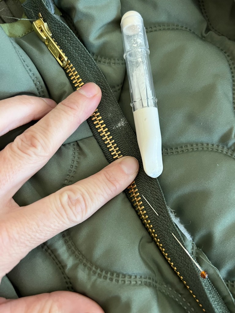 Part the separating zipper. On the right side, pin the zipper, face-down, against the right side of the fabric. The zipper teeth will be away from the edge of the fabric. Using a zipper foot, sew the zipper on about 1/4″ away from the teeth.
