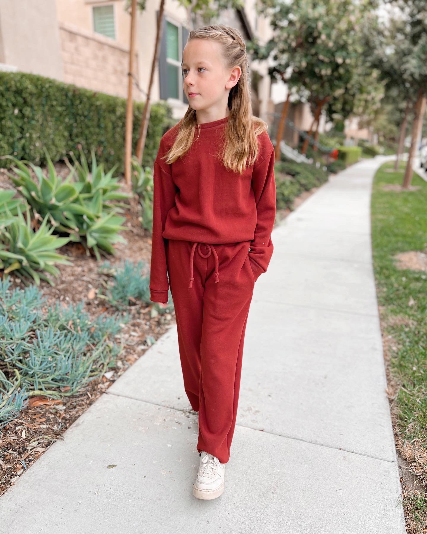 2. Gather Supplies: We hit Joann during their black Friday sale and I let her choose her fabric. I wanted her to be part of the entire process. It was really fun letting her walk through the aisles and helping her understand that you need to pick the correct fabric for specific projects, colors that work best for her skin tone, and trying to get her to picture the finished product while picking out fabric- this can be really hard to do! In the end she chose this really nice brick red sweatshirt fleece. We got three yards, I think 2 1/2 would have been perfect. Planning to make a matching sweatshirt for my baby girl to match with the leftover fabric.