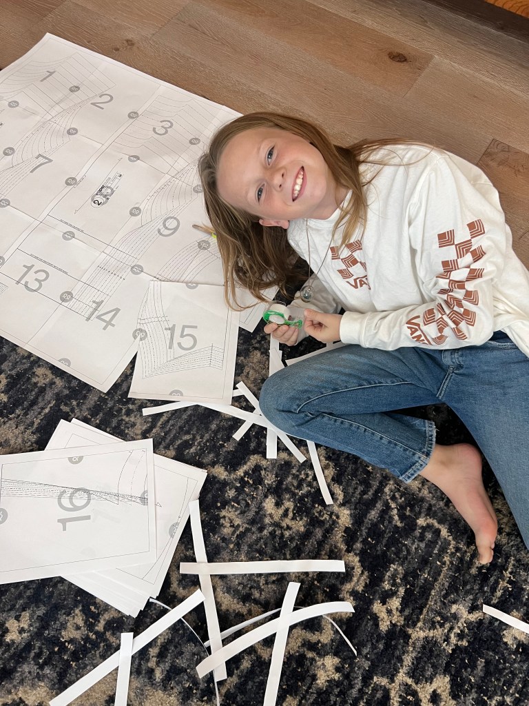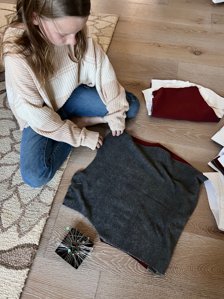 2. Feeling refreshed, the next step was cutting out the pattern pieces in the fabric. We had a quick lesson on warp vs. weft and the importance of cutting fabric out in the correct direction based off the pattern symbols. We talked about paying attention to how may patterns pieces need to be cut per piece and how to cut along the fold line. I showed her how to use pins and pattern weights to hold the pieces to the fabric while cutting. I posted a really fun time lapse reel of us cutting out the pieces together. You can find it here.
