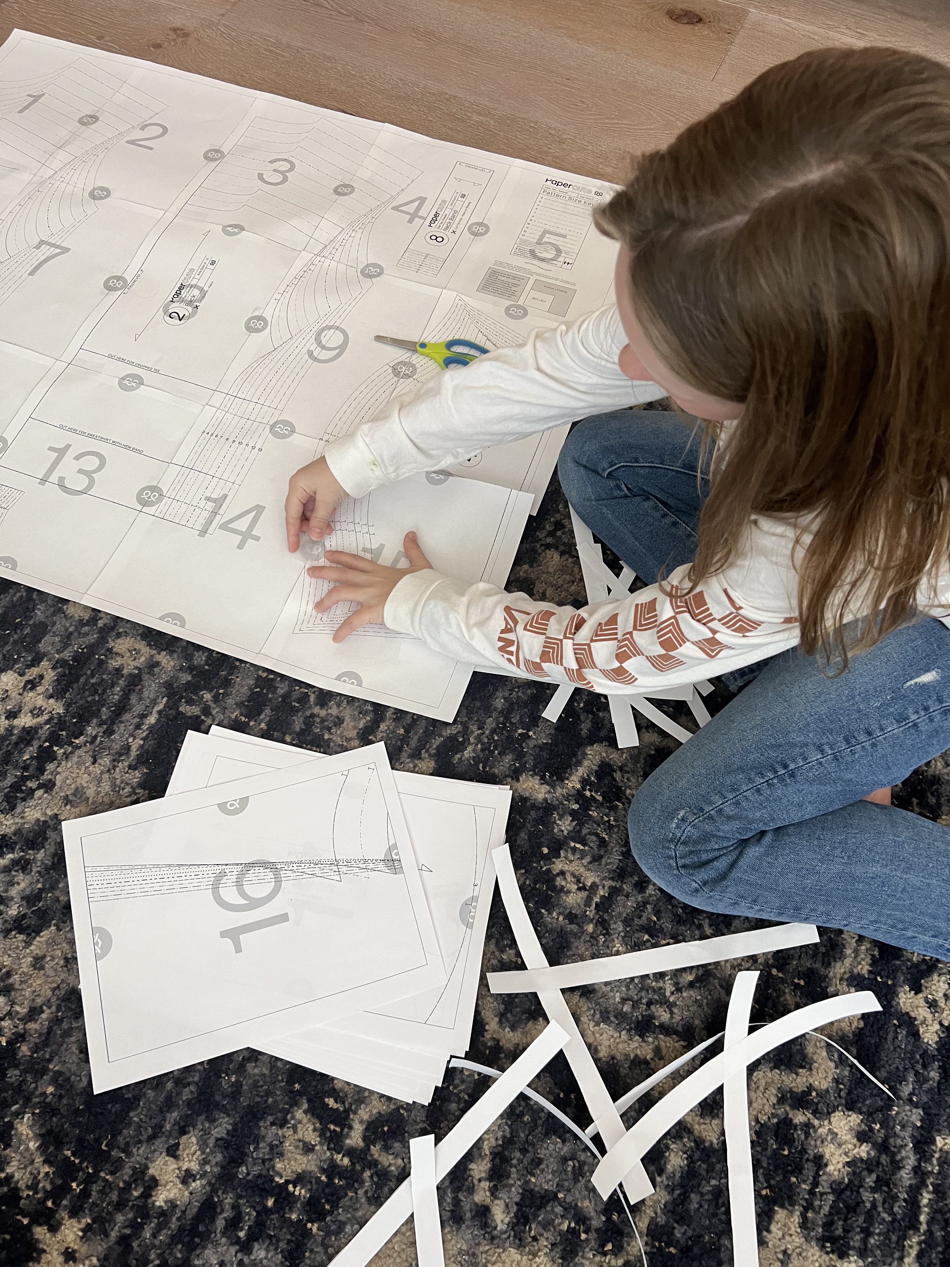 - Pick a Pattern: Papercut patterns recently dropped a new pattern line called “Papercute”- patterns for kids ages 3-12. We chose the Solar Tee Pattern and Tula Pants pattern with a matching seat set in mind for the final product. I showed my daughter the different style options the patterns have available and let her pick the look she wanted. We decided on the basic sweatshirt and wide leg sweatpants. We omitted the front fly for a more basic/simple look.